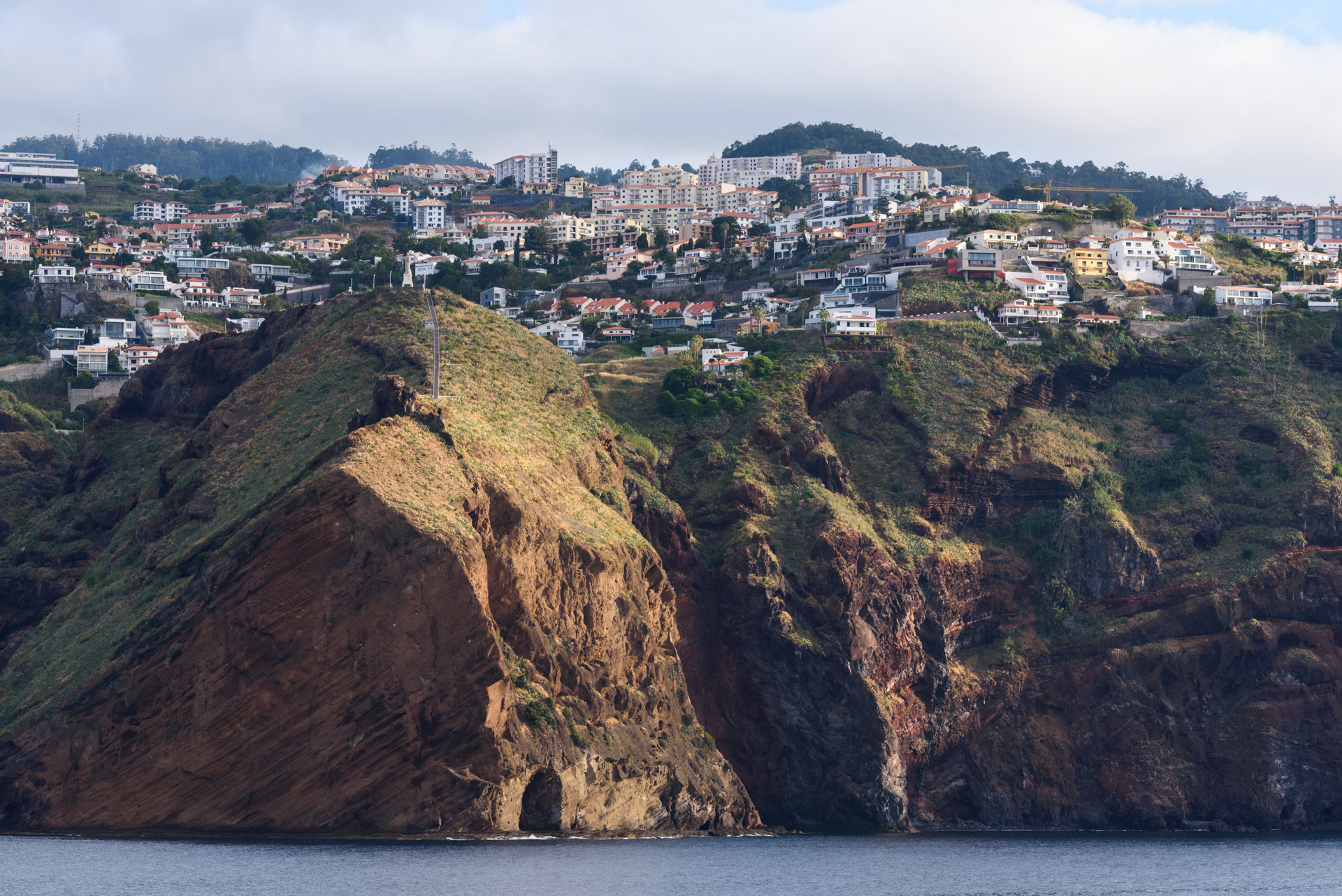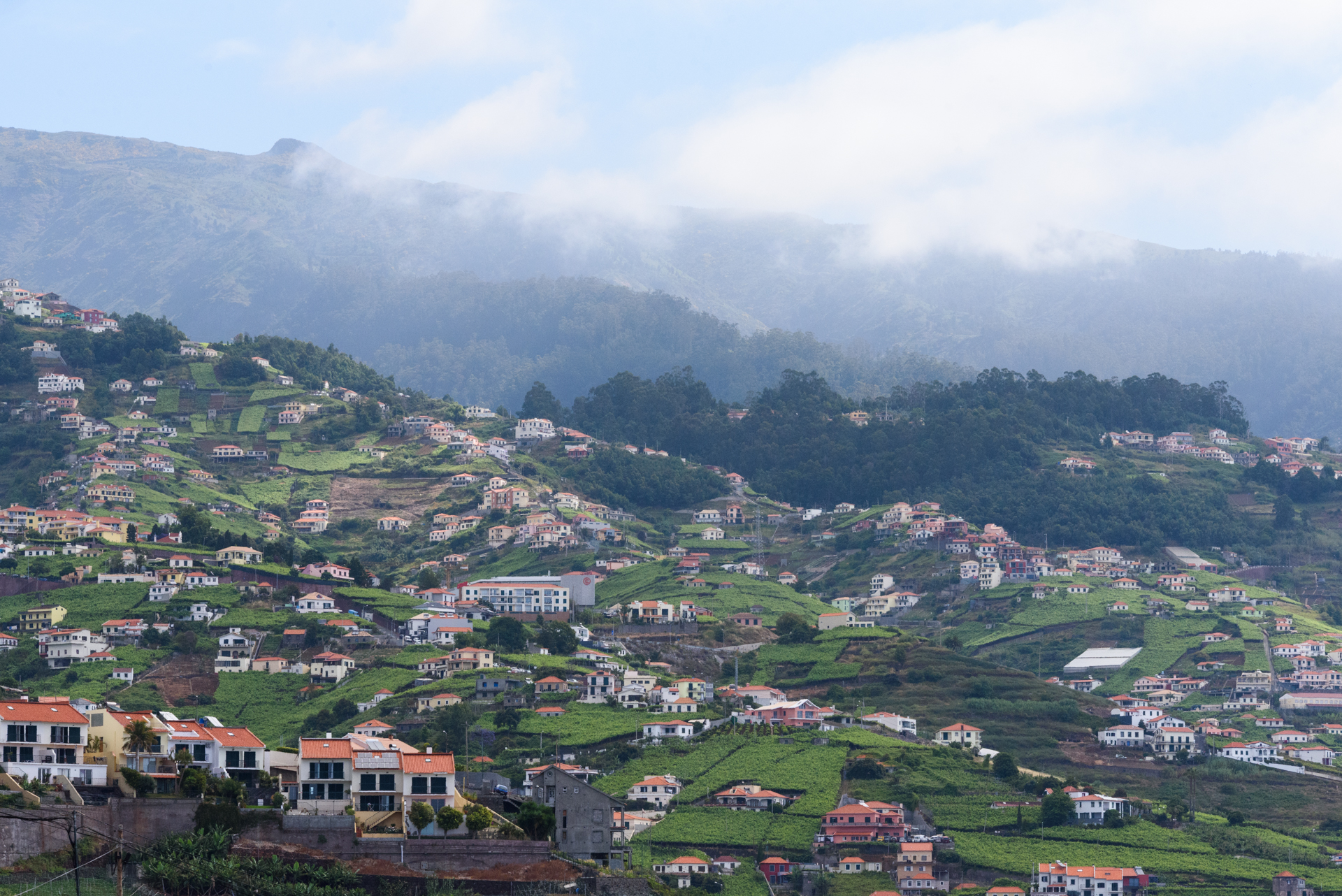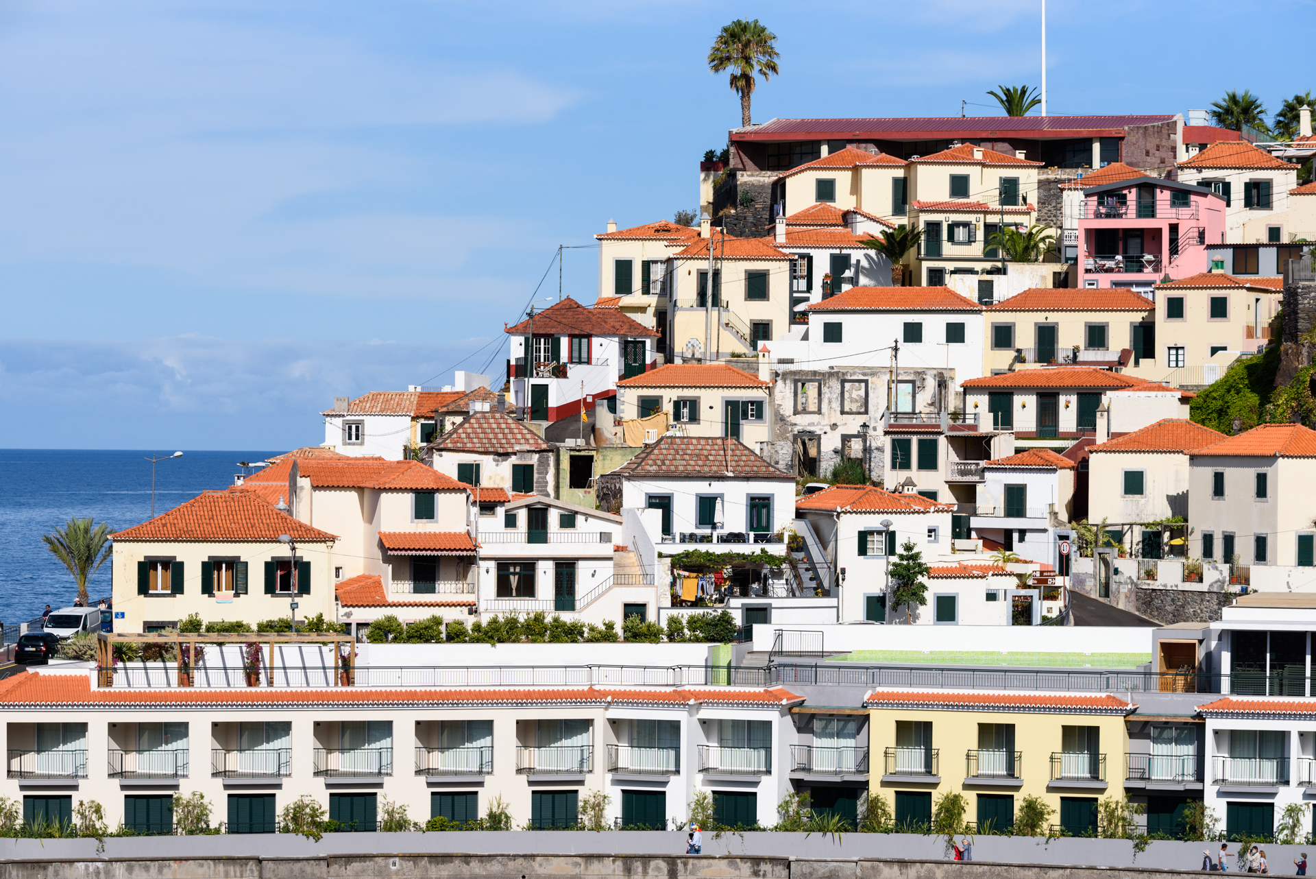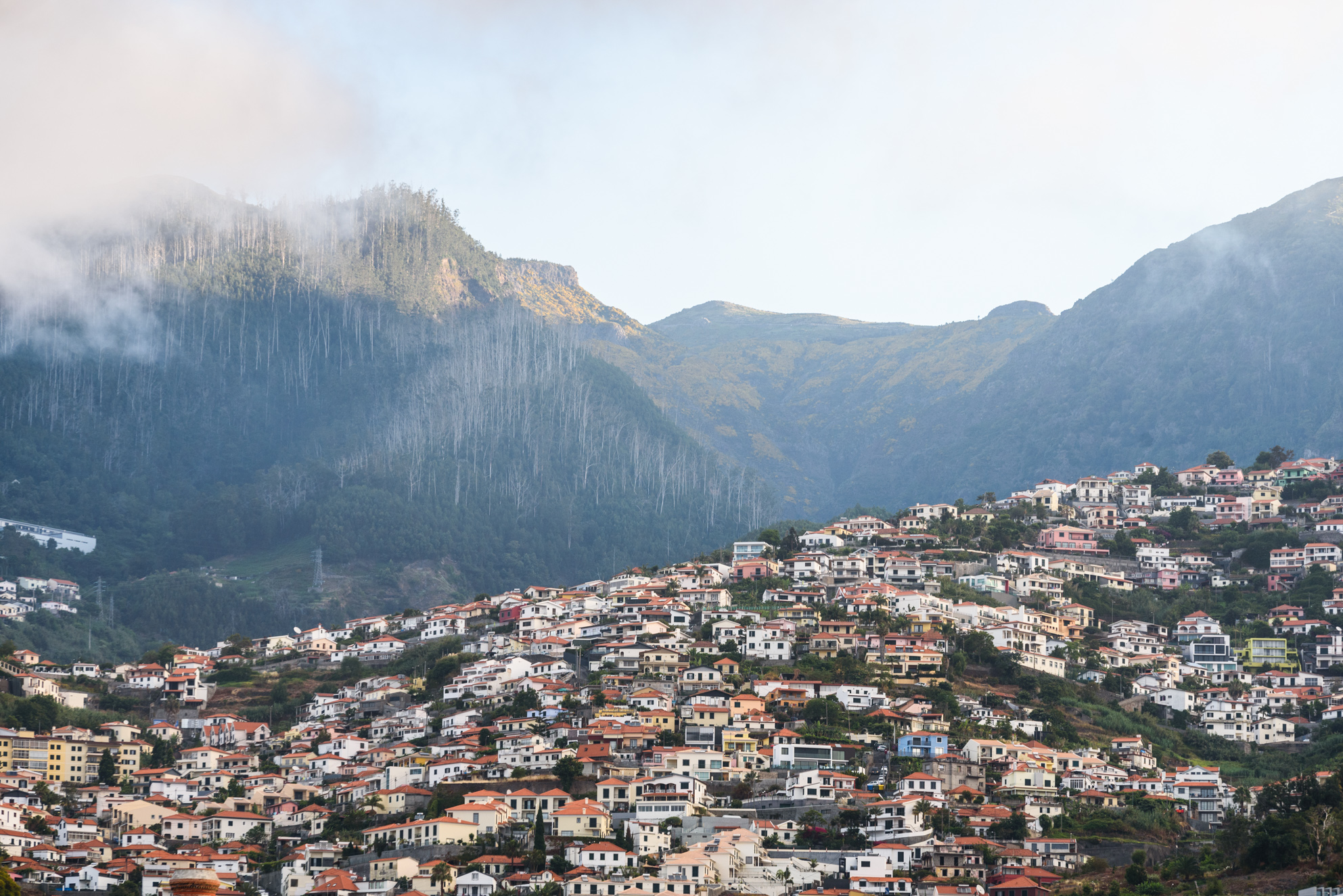 Un mar de casas y construcciones se eleva desde el mar hasta varios kilómetros montaña arriba desde el casco histórico de Funchal.