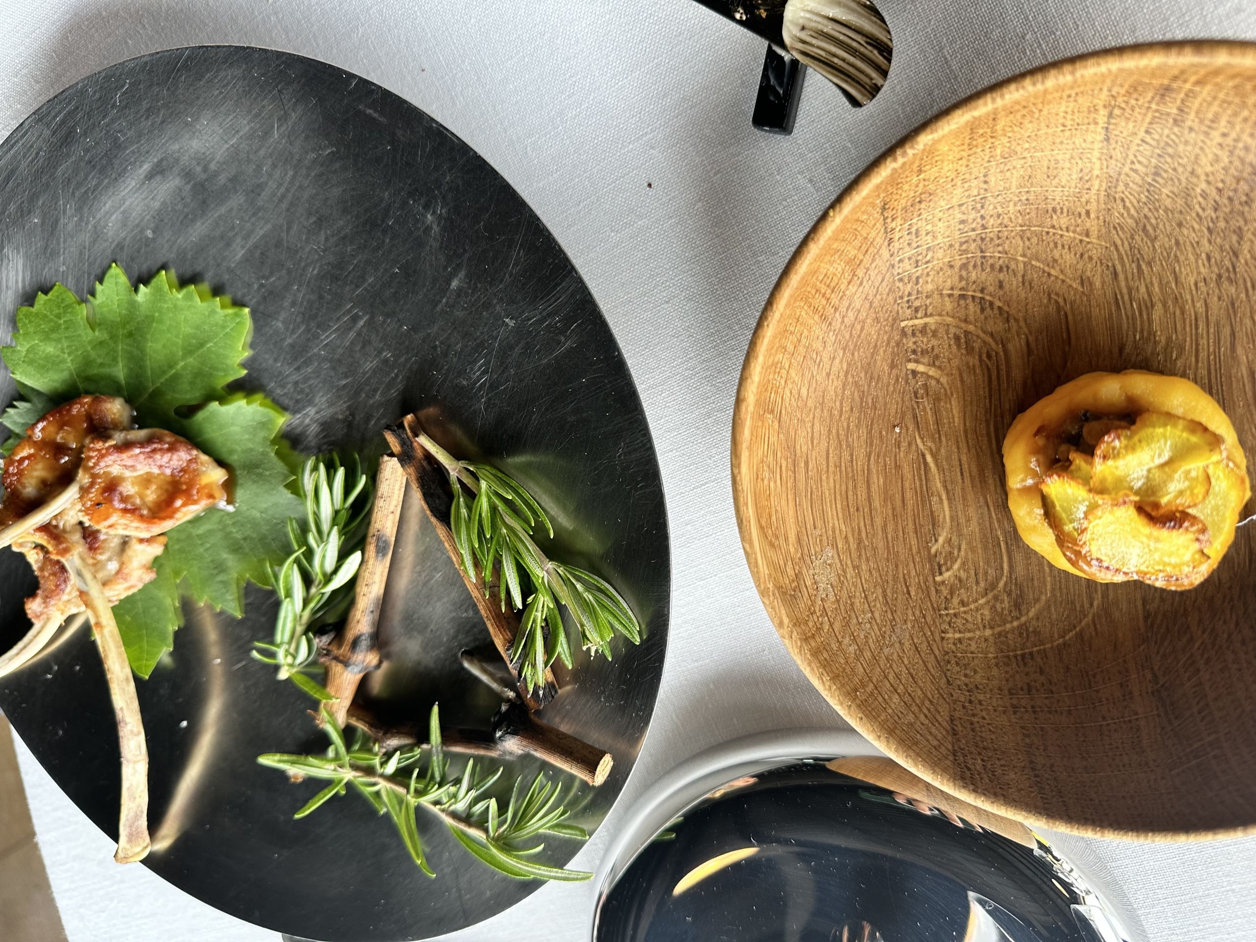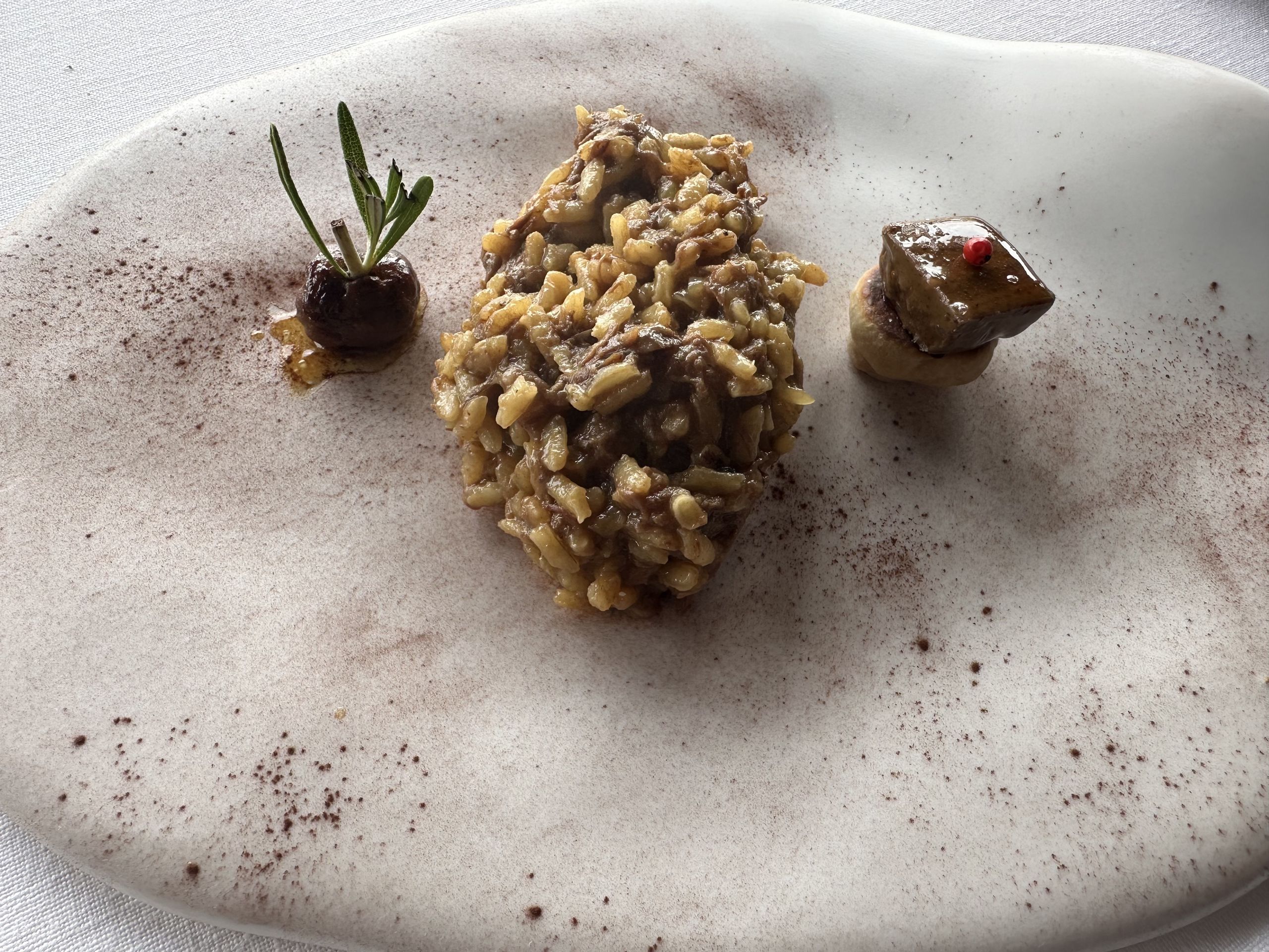 El rico arroz de caza viene flanqueado por una panica de pato y un brioche de mousse de pichón con Pedro Ximénez y pimienta rosa.