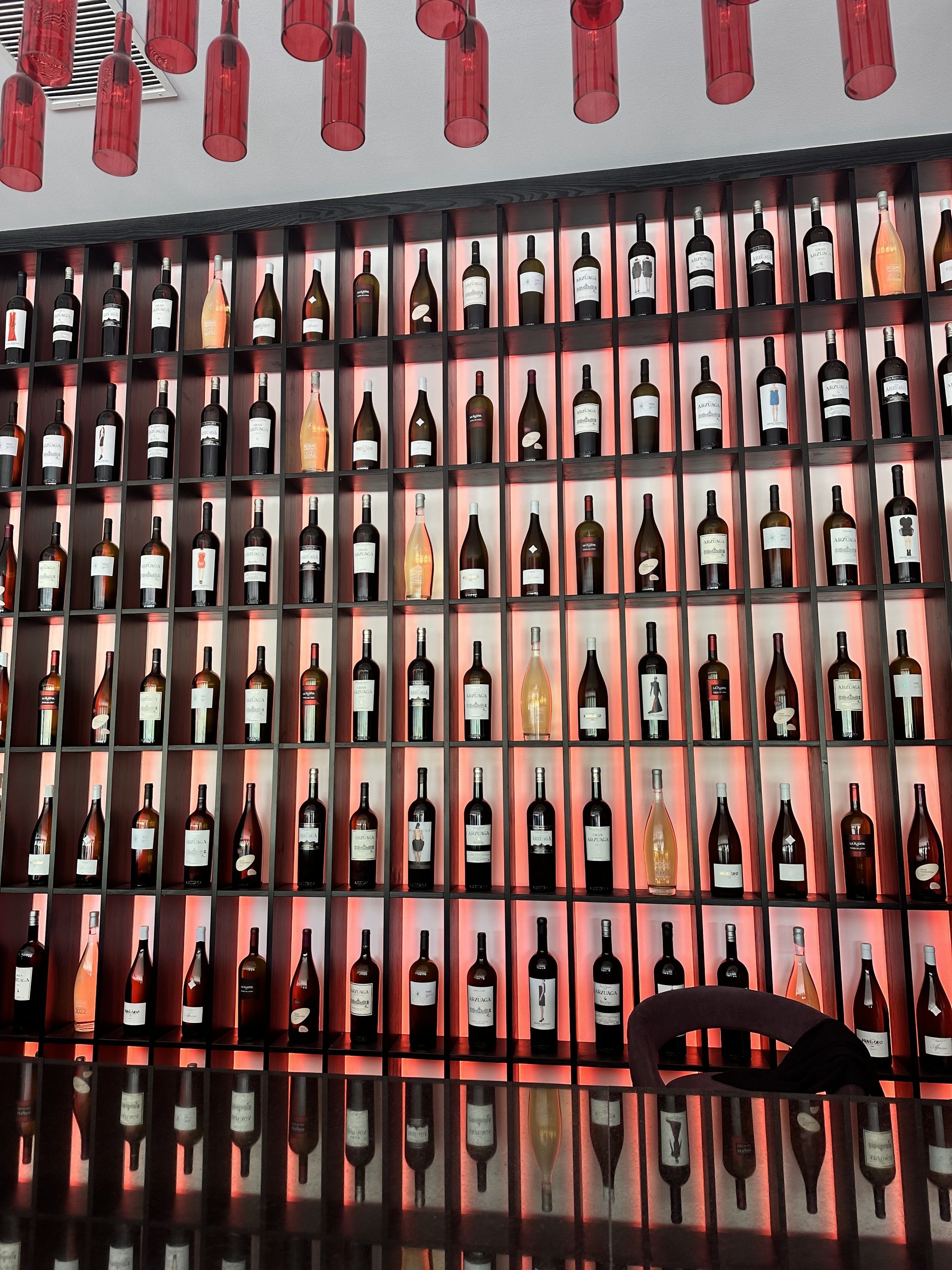 La barra de la sala de catas está decorada por numerosas botellas de todas las referencias de Bodegas Arzuaga.