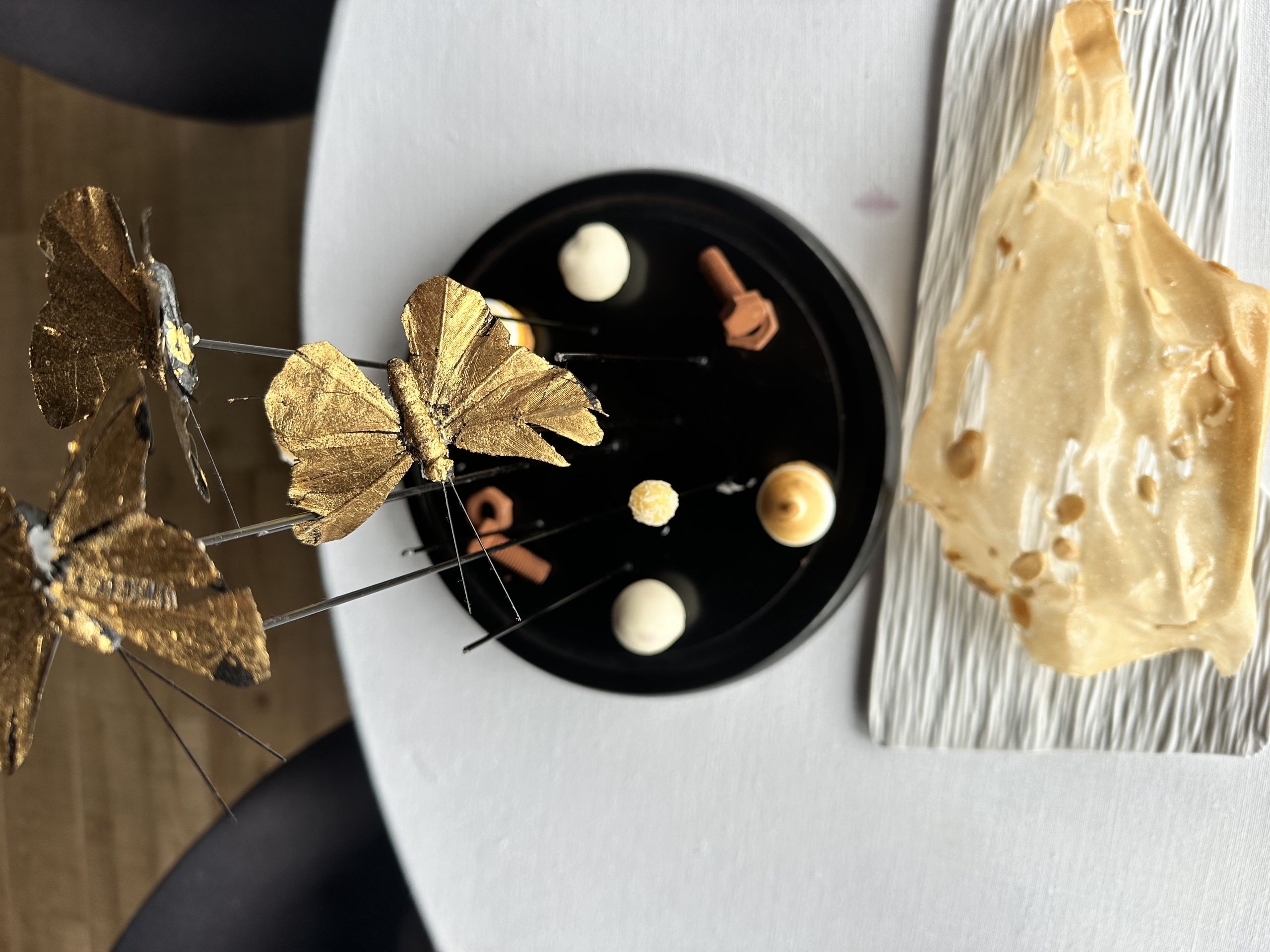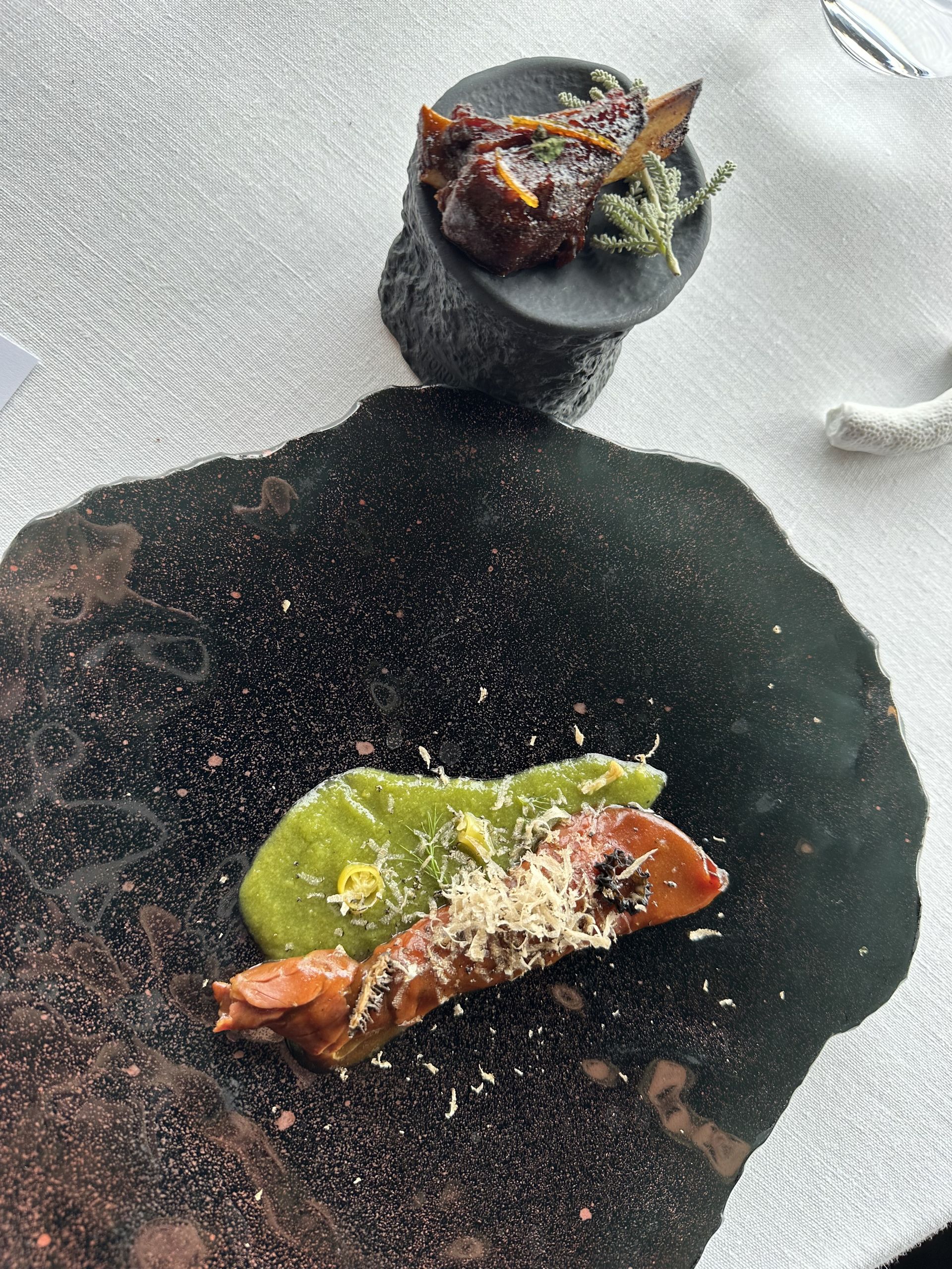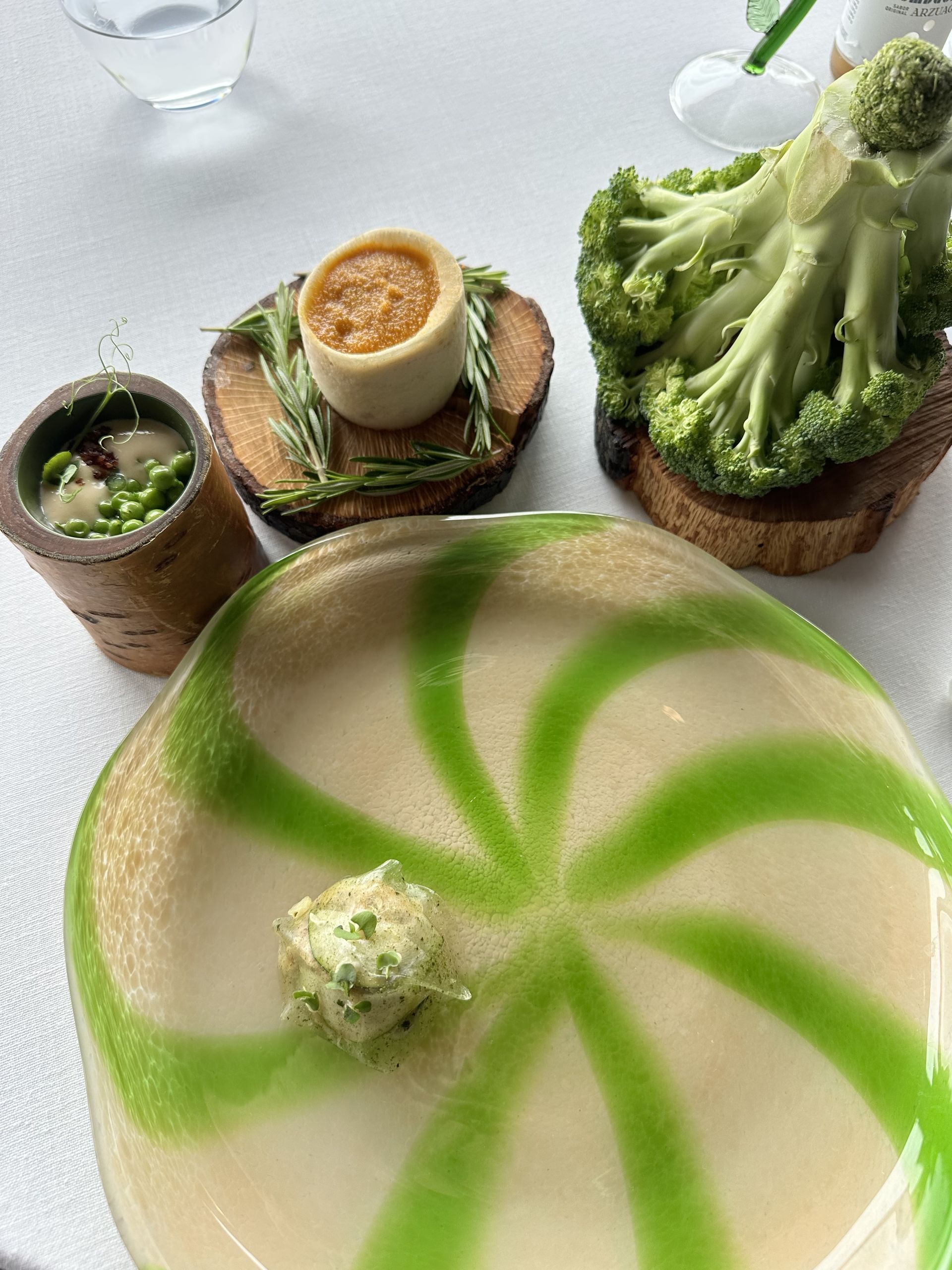Fantástico huerto ecológico del que, a primera vista, destaca por su original presentación, un gallo de corral escabechado, le sigue unos guisantes de Tudela de Duero elaborados con una mousse de jamón y de anguila ahumada. También nos encontramos con una crema de calabaza con polvo de zanahoria y para terminar, una bolita de brócoli con un rebozado de albahaca.