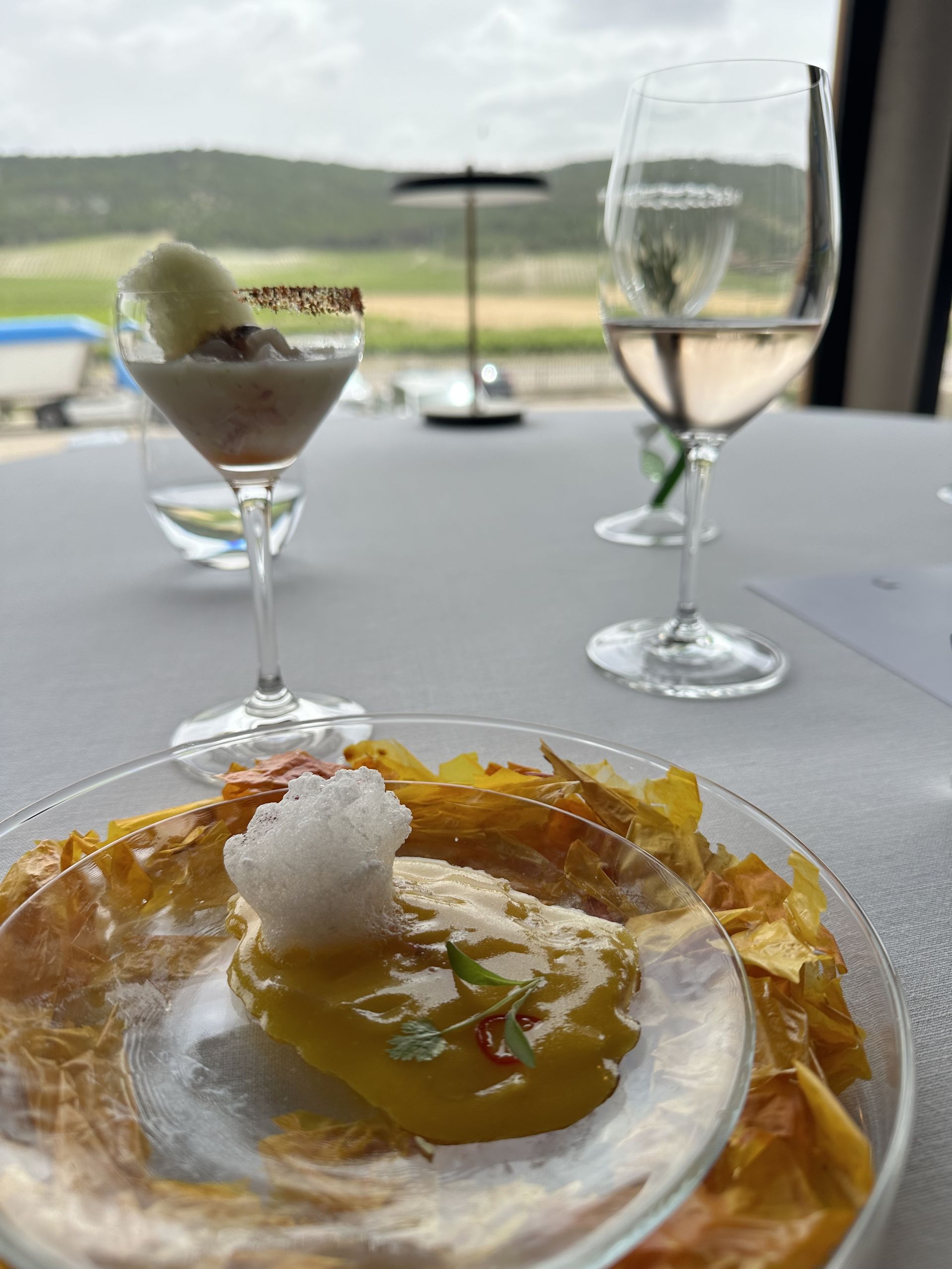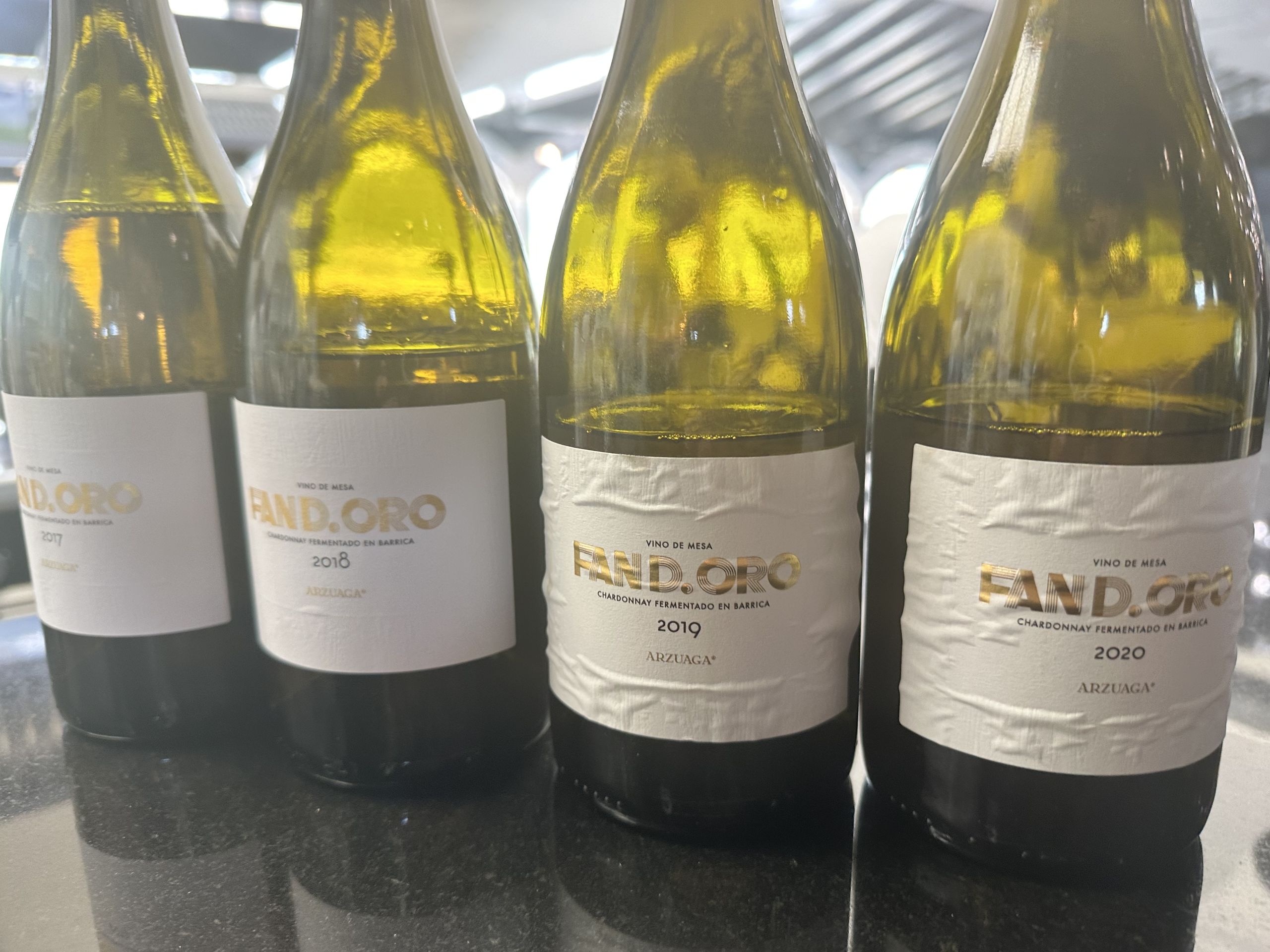 Empezamos con el blanco Chardonay fermentado en barrica Fan D.Oro con añadas diferentes que irán desde 2020 a 2017 para acompañar de manera acertadísima cada uno de estos cuatro aperitivos que nos presenta Sara.