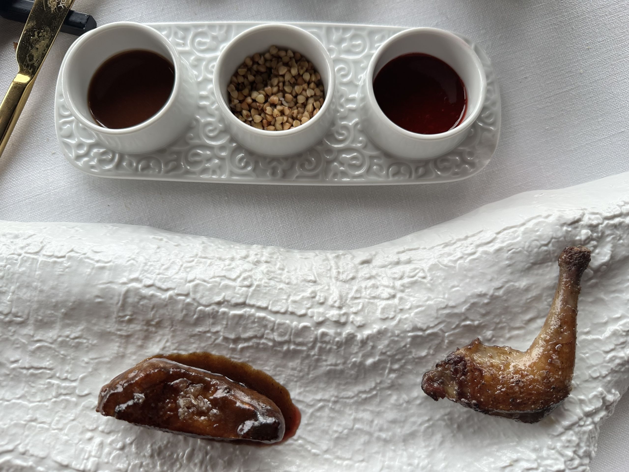 También delicioso el pichón de la región francesa de Bresse, servido con su pechuga y patita y acompañado por una salsa de membrillo y tamarindo, otra de trigo sarraceno y otra frutos rojos con mostaza.