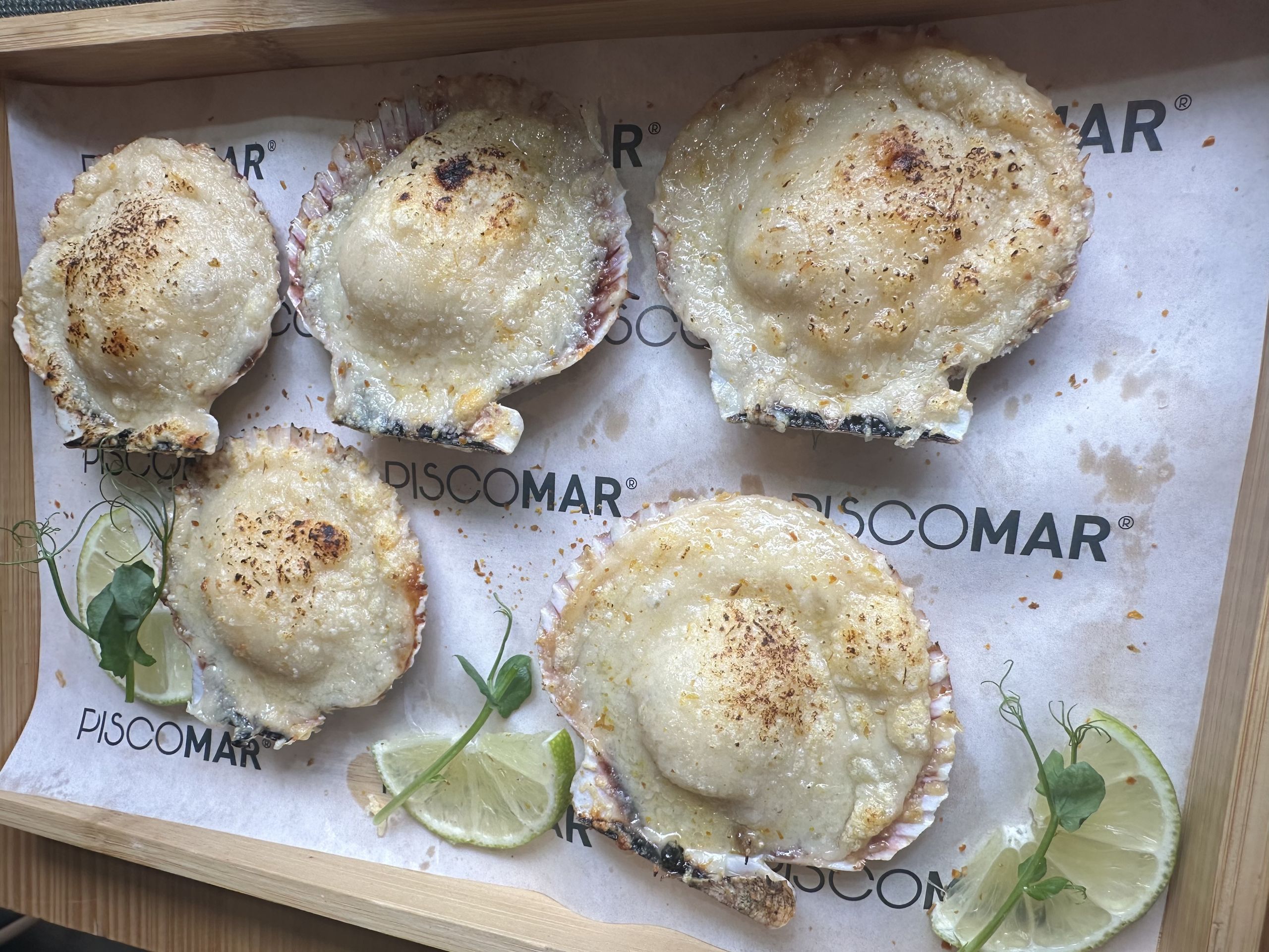 Conchita parmesana, unas sorprendentes y ricas zamburiñas aliñadas con zumo de lima y salsa perrins y tapadas con parmesano rallado gratinado a fuego muy alto para que se quede una costra crujiente.