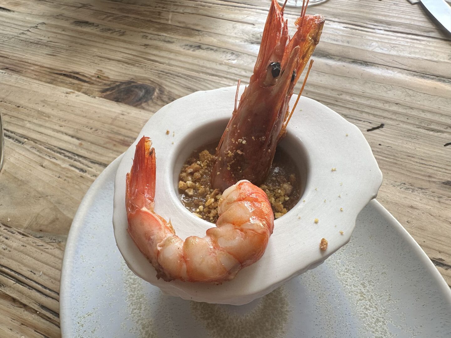 En ella seguimos con su interpretación de croqueta de gamba fresca de Denia (14,50€), lleva en el fondo del plato un crujiente de maíz, una bechamel de gamba roja y por arriba otro crujiente de maíz para simular el crujiente del rebozado de la croqueta. Acompañado por la cabeza de la gamba a la plancha y la colita ligeramente marcada. La recomendación es comerse la colita de la gamba, luego la cabeza y usar la gamba de cuchara para comerse el relleno de esta interpretación de la croqueta.