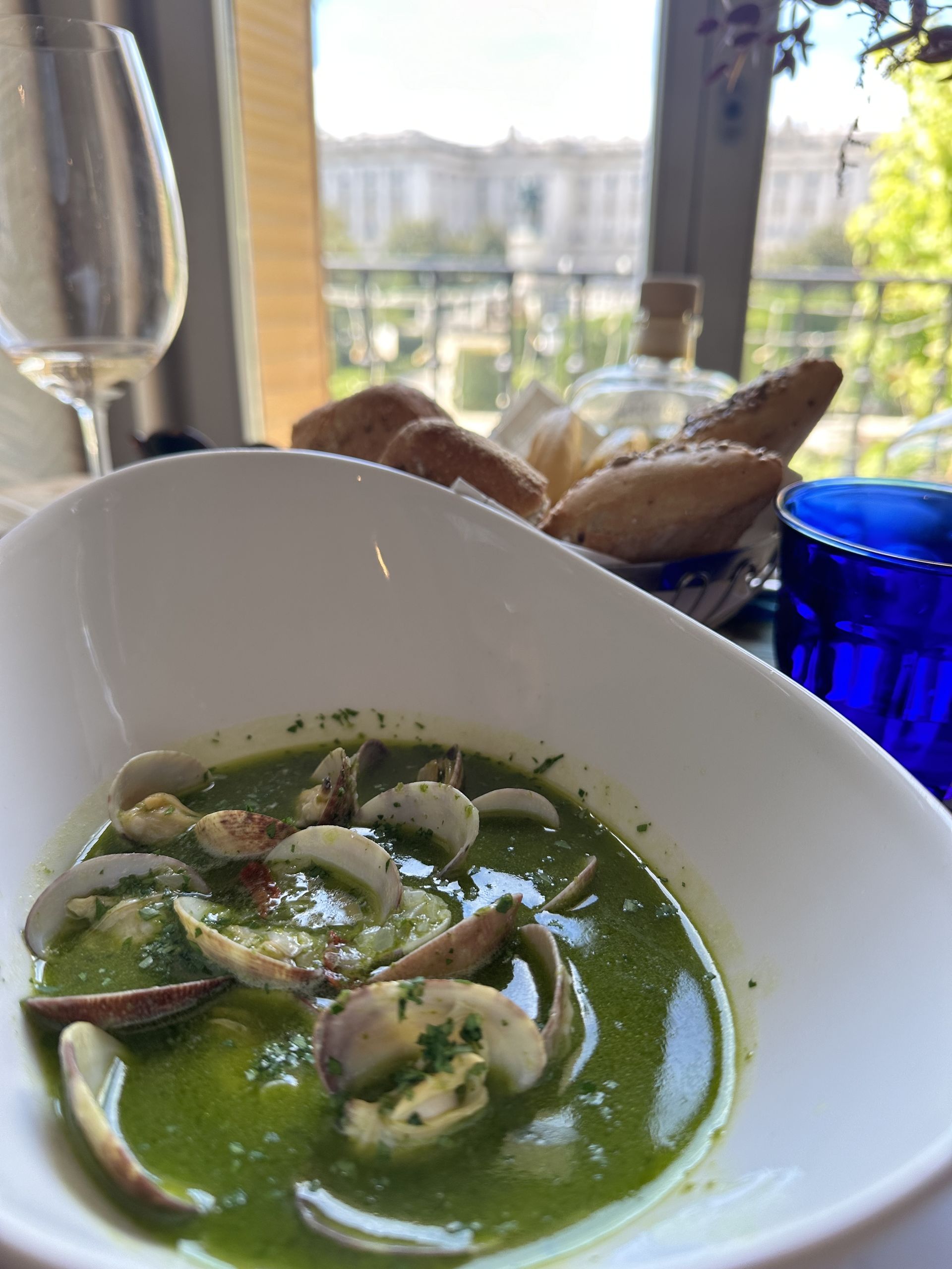 Pero nosotros comenamos tras tomar un vino al sol en su estupenda terraza con una copa de champán Trénel Crémant (35,50€) y sus magníficas ostras soletes (5,90€), recogidas en el Delta del Ebro. Lo que hace que sean especiales es que las sacan a tomar el sol unas horas al día, lo que hace que la ostra se cierre mucho y cuando vuelven a meterla en el agua se vuelve a alimentar. El resultado es que sea más carnosa y un puntito más dulce que la ostra del Cantábrico. También magníficas las almejas finas en salsa "Verdi", mantequilla y fumet de bivalvos (28.50€).