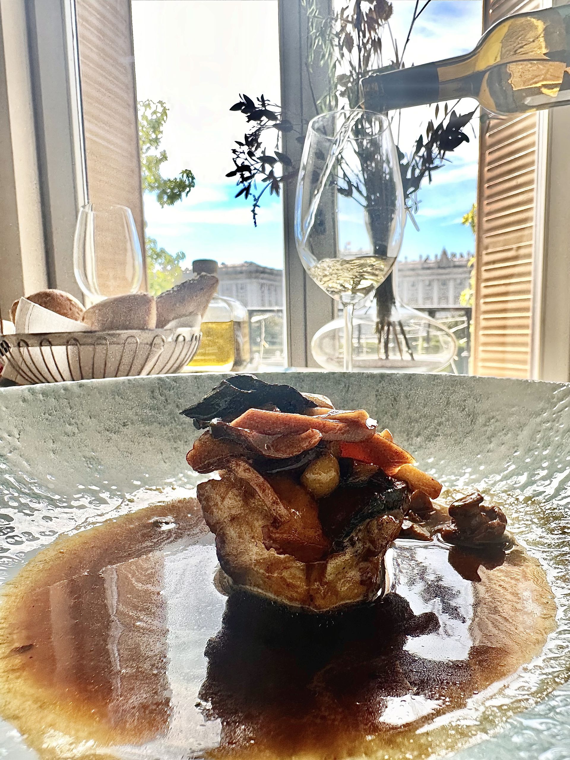 Pero la joya de la corona es La Lonja Restaurante, ubicado en la planta superior del edificio y que alberga el proyecto gastronómico La Lonja. Como os contaba antes, ofrece desde sus ventanales espectaculares vistas al Palacio Real de Madrid. La vista panorámica también incluye al Teatro Real y a la Plaza de Oriente de Madrid, una de las plazas más bellas de Europa y que acompaña a la perfección a la propuesta de carta.