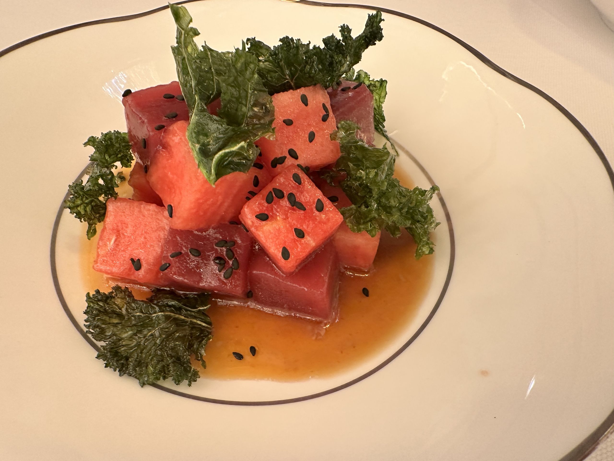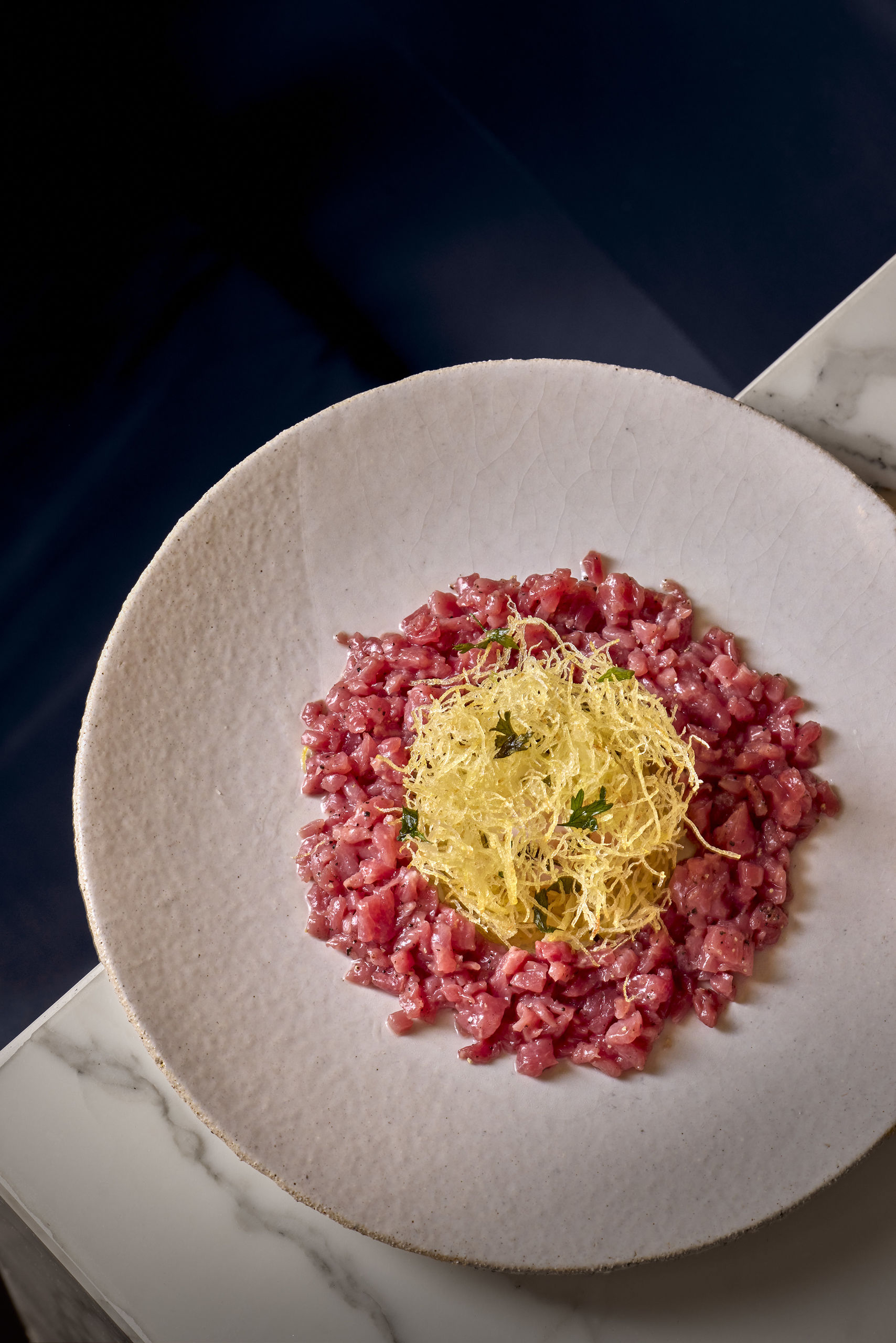 No hay que olvidar que Dani García es uno de los chefs que más importancia dan al atún de Almadraba. Por eso, el viaje llega hasta a Asia con su oda al atún y elaboraciones como el bogavante con salpicón de yuzu y endivias, la espectacular ensalada de sandía, atún y kale frito (16€) sobre una salsa de ponzu y soja que llega desde Marbella, el sashimi de atún de Almadraba en adobo, el tartar de atún con soja o el dúo tartar de atún toro con soja, sésamo con yuzu y yema curada o el dúo tartar de atún akami y salmón.