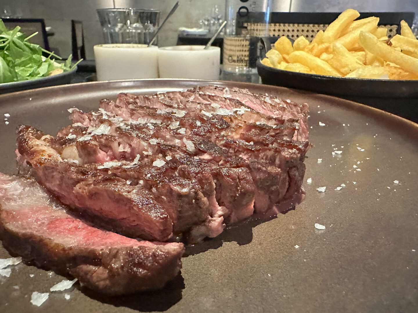 Pero lo dicho, es hora de coger el cuchillo e hincar el diente a una de las piezas que elegimos y que es de las más representativas. El ojo de bife (36€), perfecto de punto, de textura y con el sabor de las brasas. Además, lo acompañamos de ensalada de rúcula, tomatitos, parmesano y croutones de laffa (10€) y patatas fritas (7€).