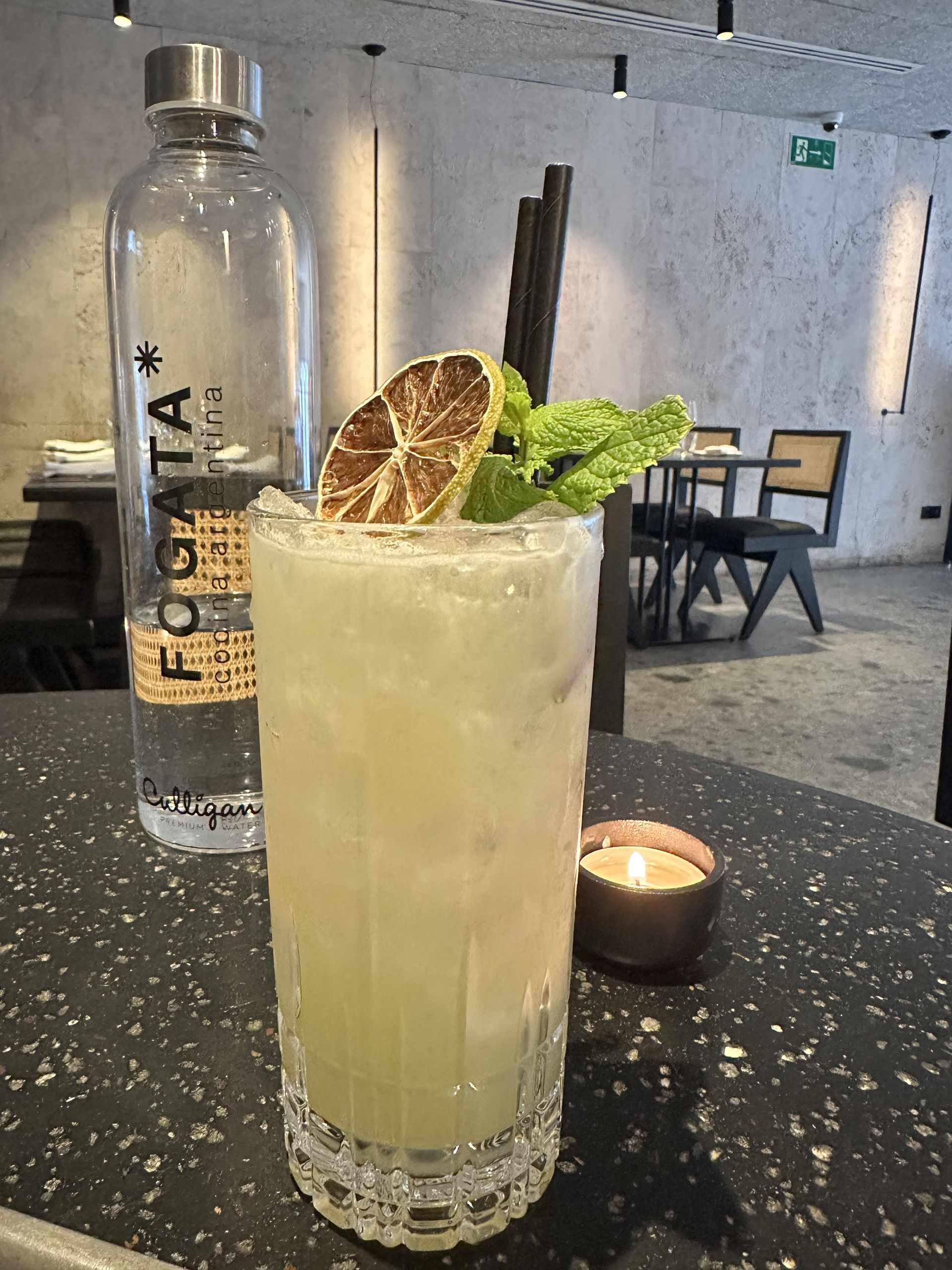 En el concepto de Fogata, alejado de formalidades y protocolos, la coctelería tiene un protagonismo esencial, al igual que la música. Una gran barra junta a una zona de mesas bajas reciben al comensal, y una carta de cócteles clásicos diseñada como te decía por Diego Cabrera y de la que probamos un tradicional Bloody Mary (12€) con Vodka Absolut Elyx, zumo de lima, salsa worcester, sal, pimienta negra, tabasco y zumo de tomate; y un The Spicy (13€) con Mezcal, Chartreuse, zumo de lima, piña y sirope de jalapeño.