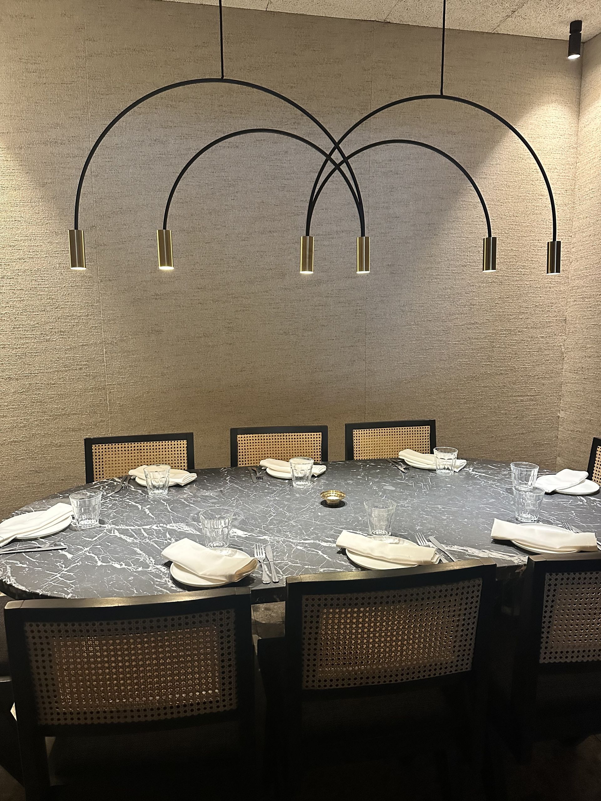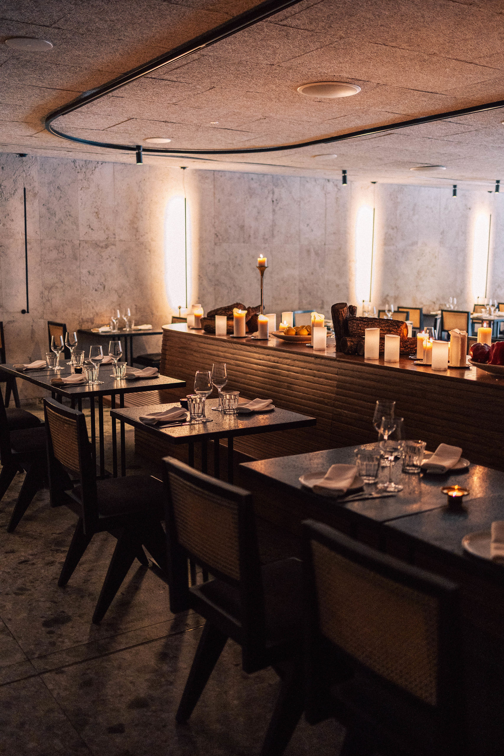 La iluminación, buscando siempre la intimidad, baja y a la luz de las velas en la parte central de la sala. En la entrada, una amplia barra para disfrutar de los cócteles y donde no se admiten reservas.