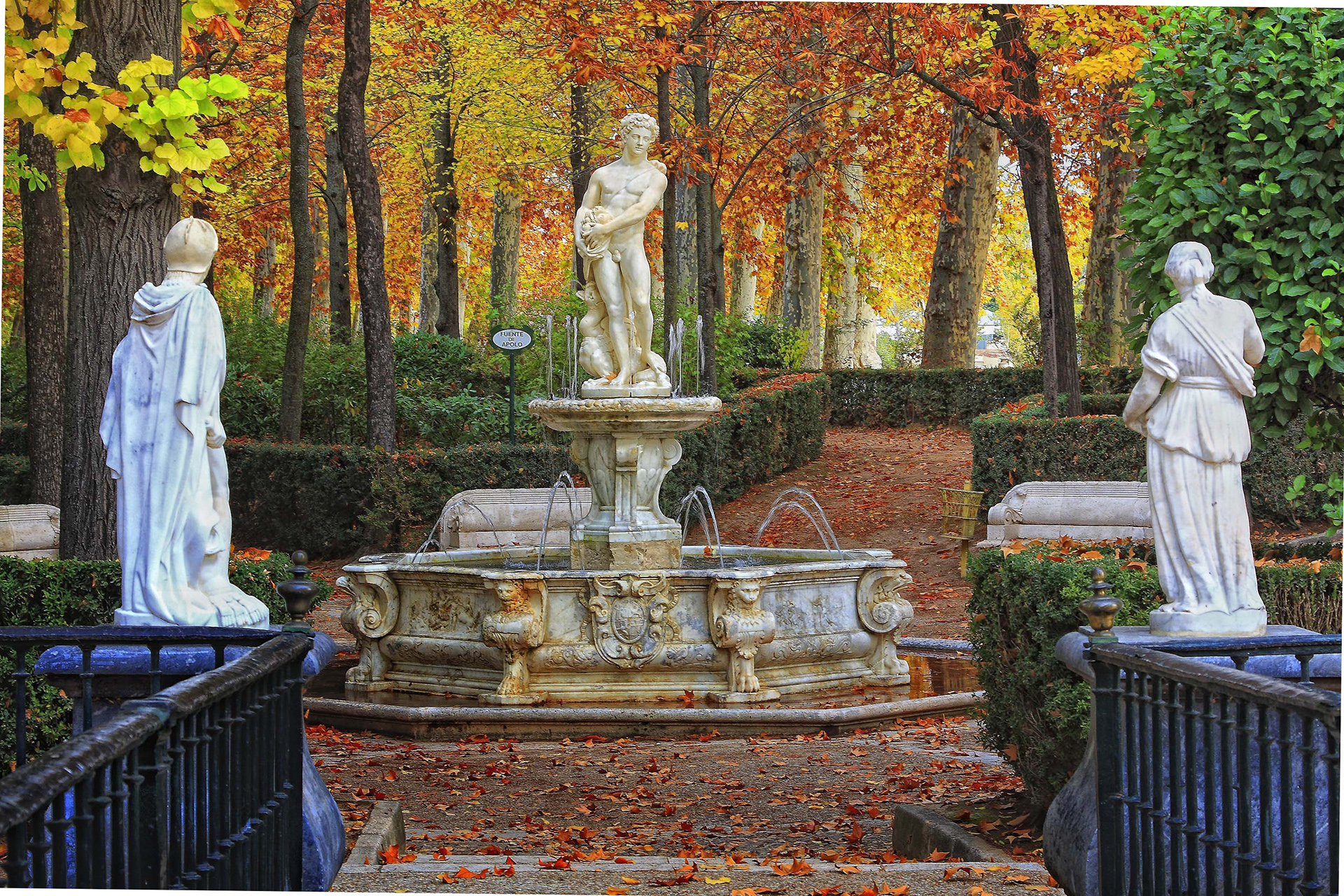 Los jardines del Palacio Real están adornados con fuentes históricas que no solo embellecen el paisaje, sino que cuentan historias de mitología y el poder de la realeza. Algunas de las más famosas alegorías esculpidas en piedra y de las que brota el agua son la Fuente de Hércules y Anteo, la Fuente de Ceres, ubicadas en el Jardín del Parterre y la Fuente de Hércules e Hidra, la Fuente del Reloj y la Fuente del Niño de la Espina, estas tres últimas ubicadas en el Jardín de la Isla.
