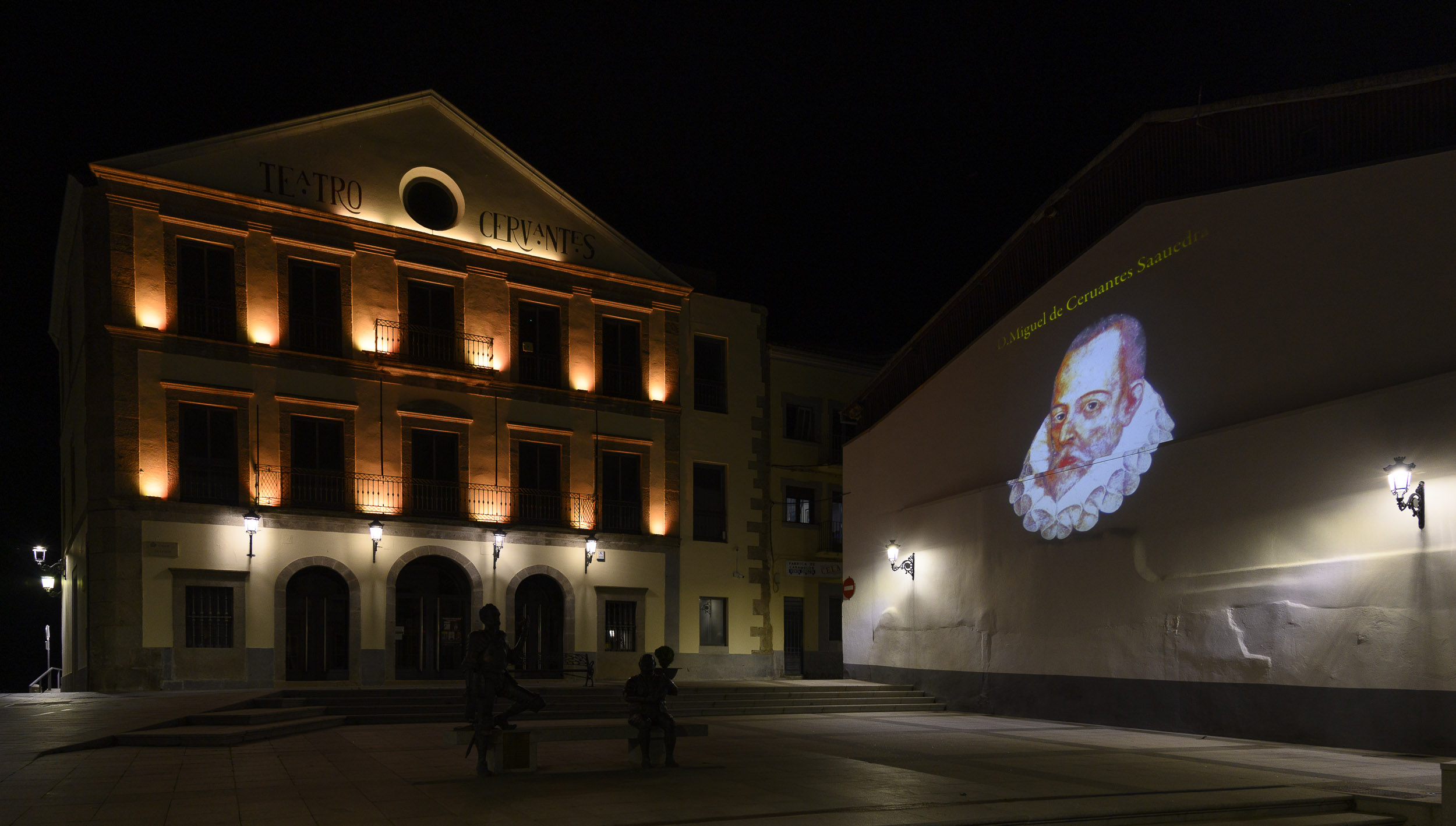 El teatro Cervantes de Béjar junto a una imagen del genio de Alcalá de Henares.