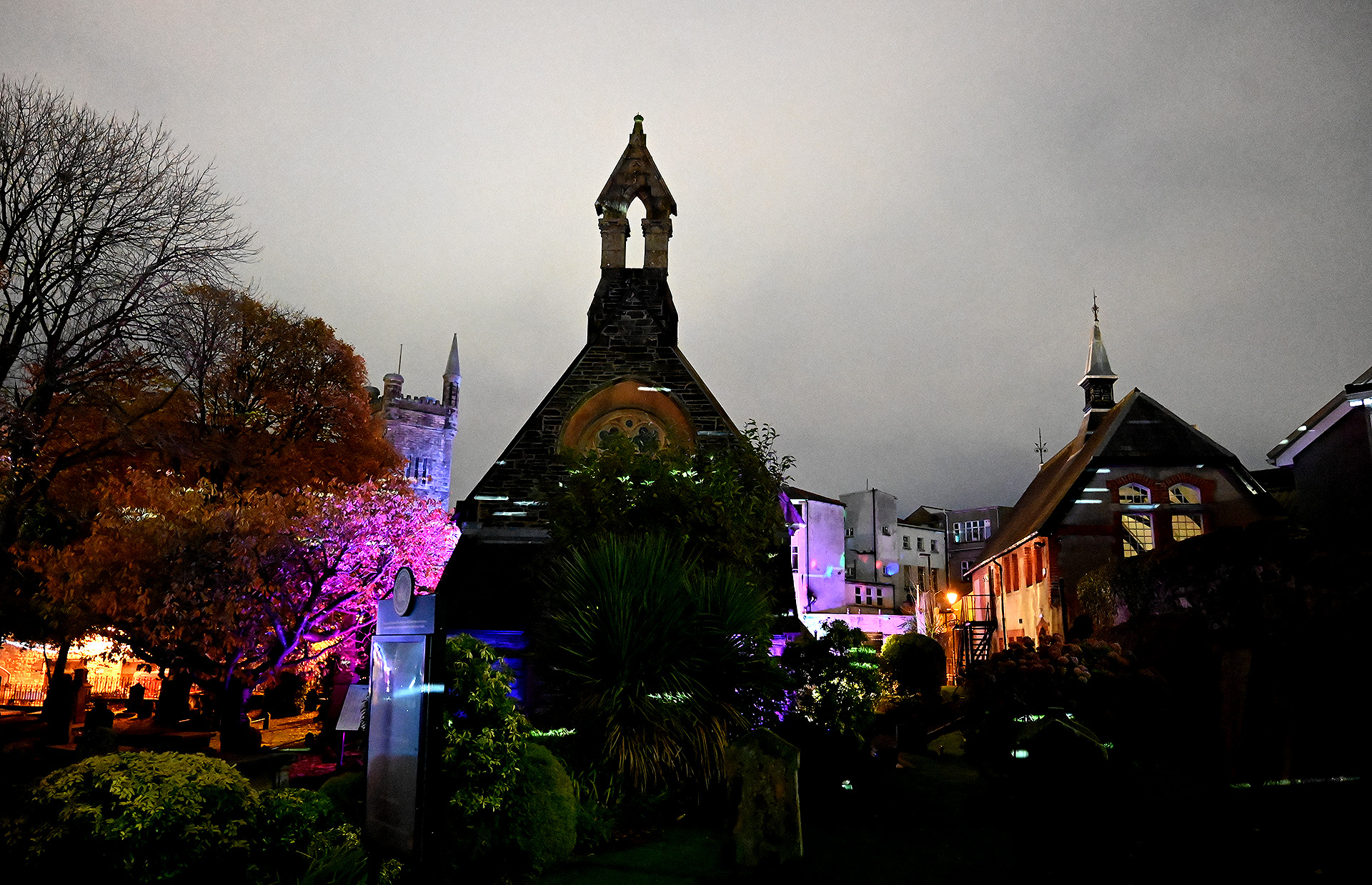 Uno de los pequeños cementerios situados en el centro del casco histórico de la ciudad amurallada de Derry, también iluminado para la ocasión.