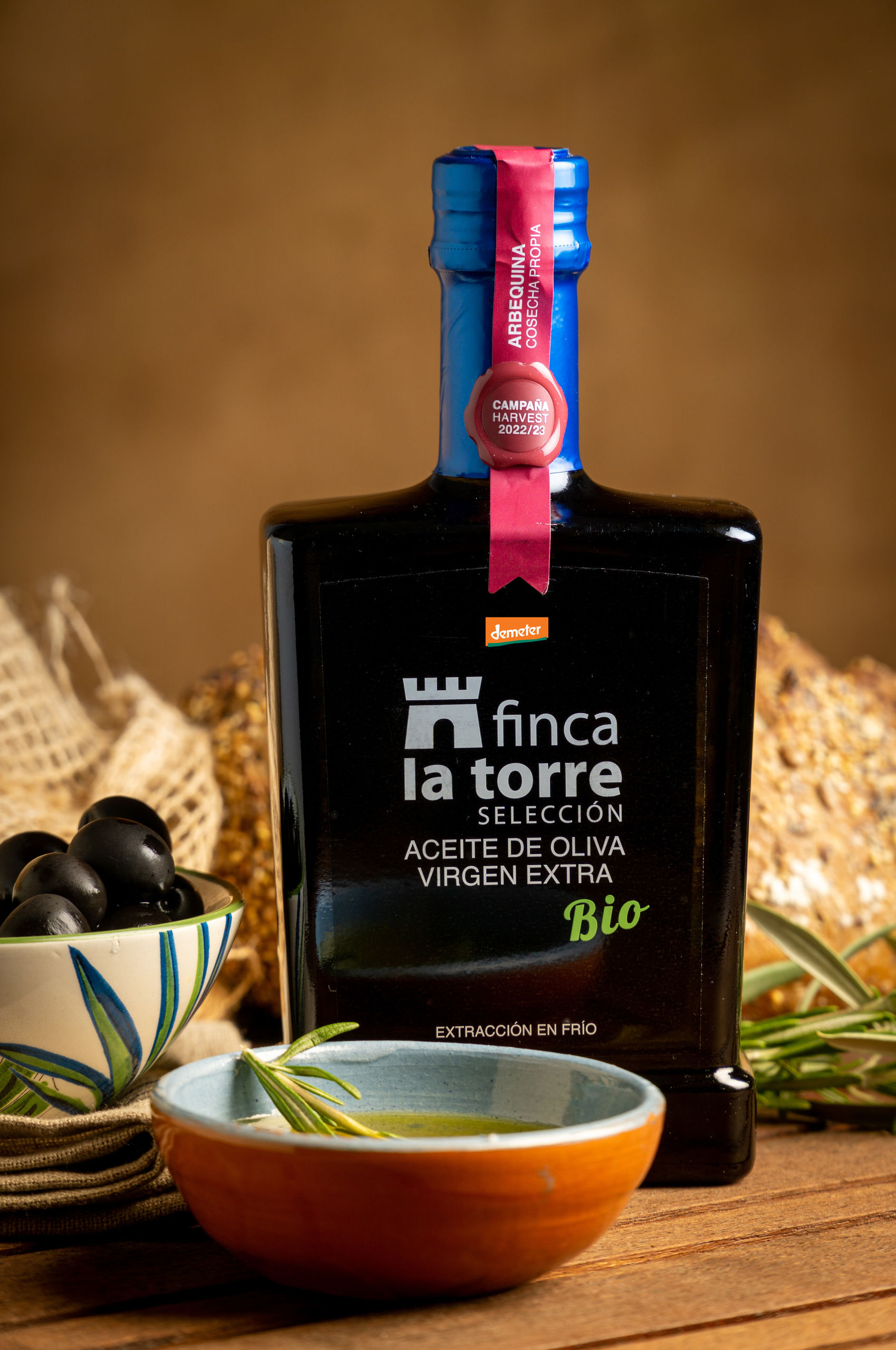 Con 13 años de exitosa trayectoria, Finca La Torre tiene al ingeniero agrónomo Víctor Pérez como alma mater del proyecto, al frente de un modelo de producción y elaboración ecológico y biodinámico que consigue sacar el mayor partido al olivar de su finca propia. Situada en Bobadilla, a quince minutos del centro de Antequera, cuenta con 380 hectáreas, entre pastos, pinares y olivares, compuestos estos últimos por 1/3 de olivos centenarios de la variedad hojiblanca —es la estrella de la gama de AOVE— y 2/3 por olivos nuevos de las variedades arbequina, picudo y cornicabra, de intensísimos aroma y sabor. En Finca La Torre, consiguen, mediante un delicado tratamiento del fruto, extraerle todo el potencial a cada variedad. El proceso comienza por una recolección temprana y sigue con la extracción en frío para que el fruto mantenga intactas sus propiedades. El secreto está en recoger la cantidad que la almazara puede molturar en el día. Así, además de potenciar al máximo su aroma, su sabor y su textura, se garantizan sus propiedades saludables (antioxidantes como la vitamina E, los polifenoles, etc.).
