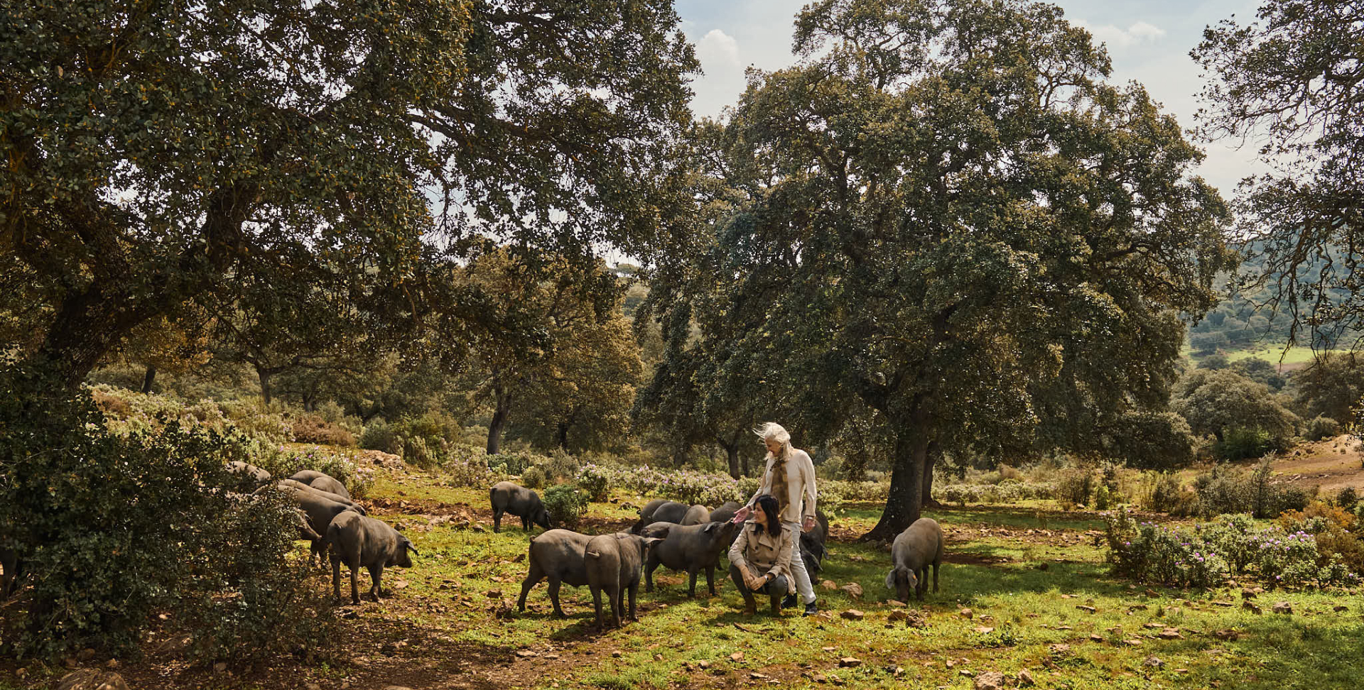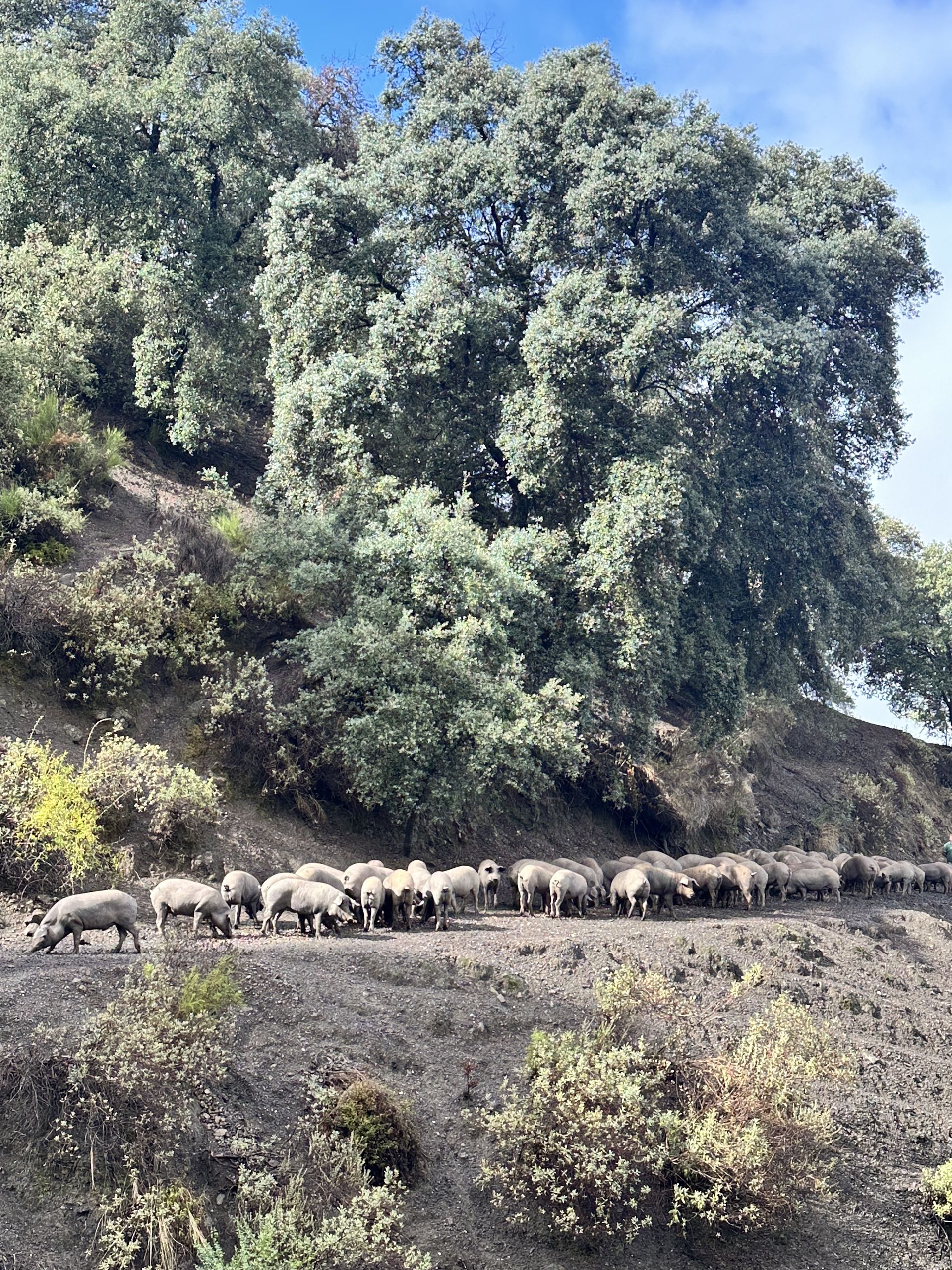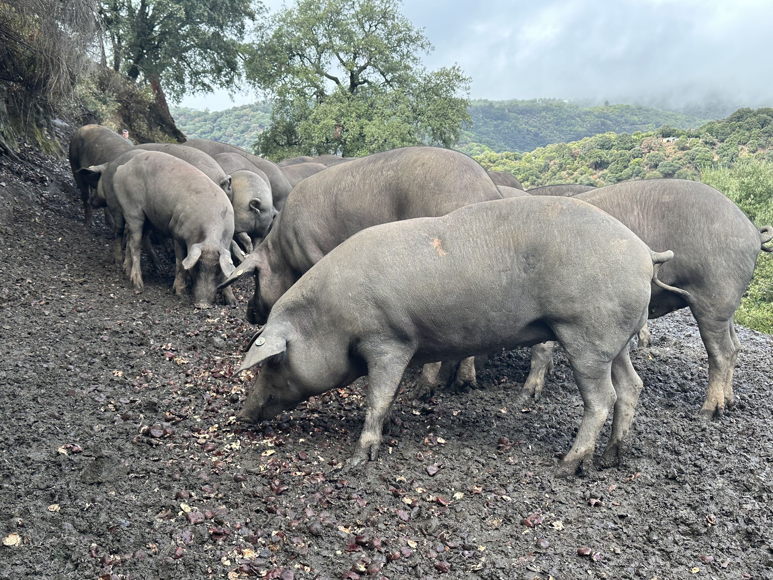 Como auténticos atletas, los animales se ven obligados a hacer ejercicio a diario para alimentarse en estos montes con abruptas pendientes —esculpiendo jamones y paletas inigualables—. En las fincas hay una mezcla casi perfecta de tres bellotas —encina, quejigo y alcornoque—. Estos tres tipos de bellota se suceden unos a otros y se encabalgan durante el mes de la montanera, predominando unos u otros según el momento del mes, pero garantizando siempre una estabilidad en la cantidad de bellota y, gracias a ello la máxima calidad. Esta mezcla de bellotas diferentes, aportan a las carnes del cerdo ibérico una fuerza y un sabor excepcionales.