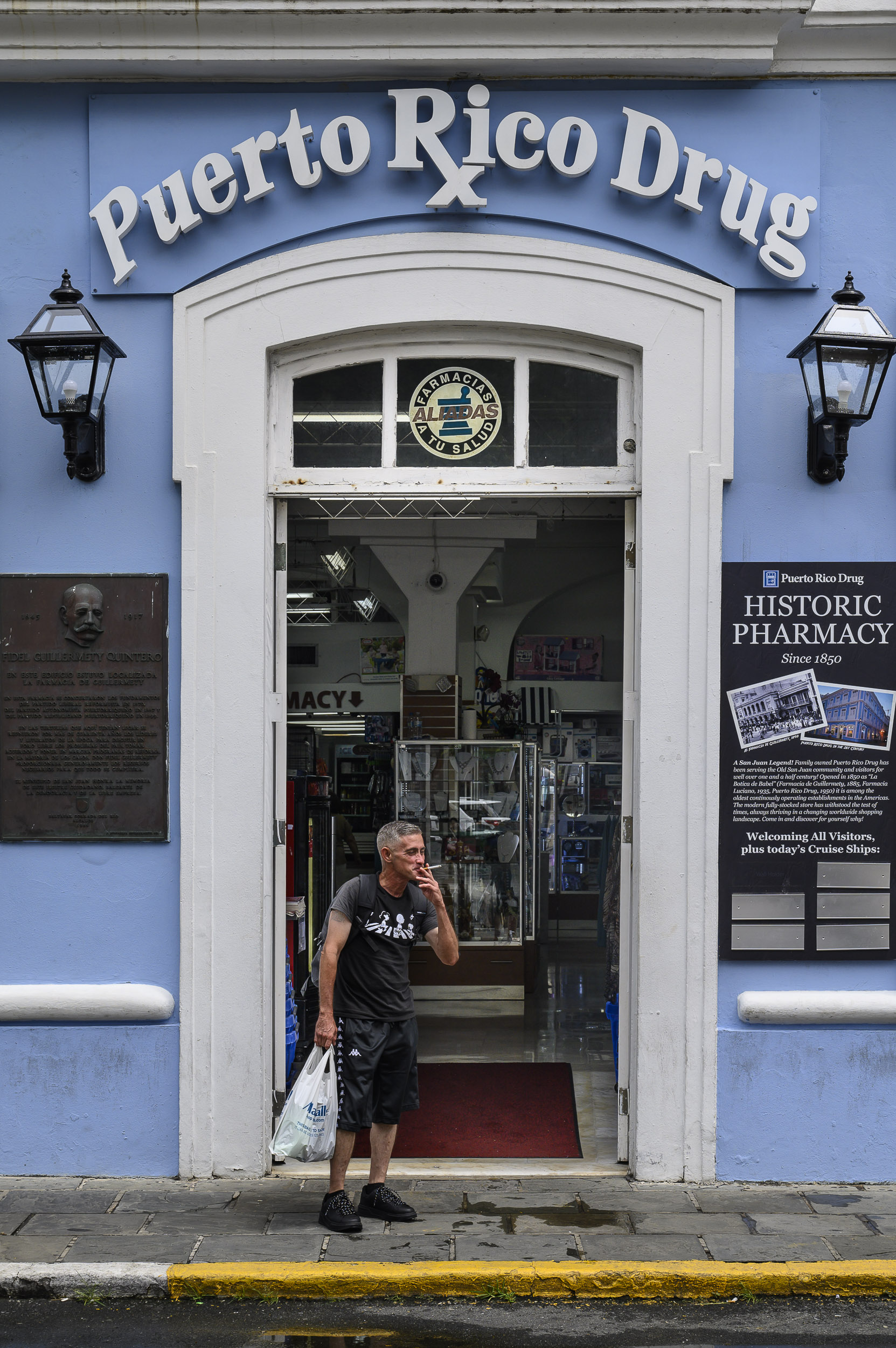 Dos turistas tomando algo y fumando en una calle del Viejo San Juan.
