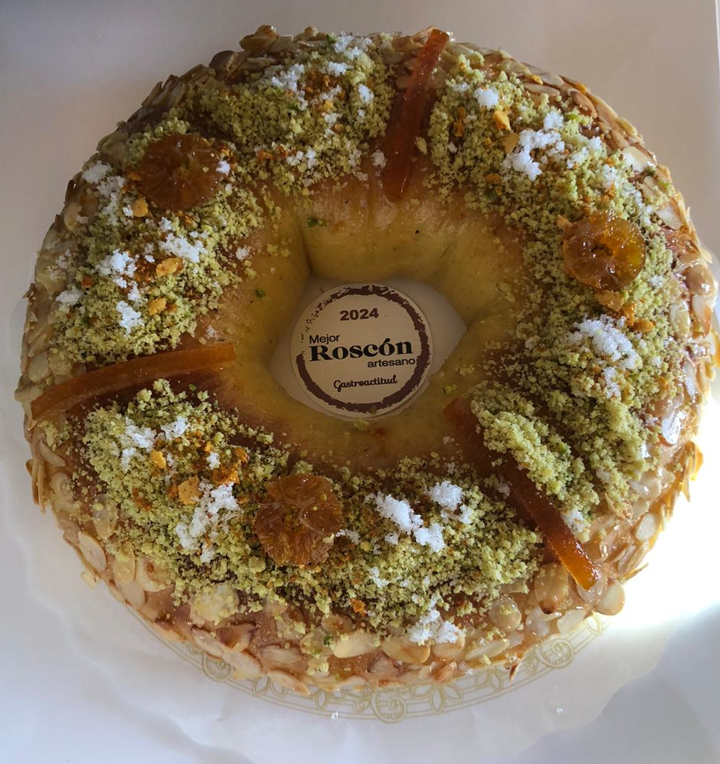 Un roscón muy tradicional, de textura media, perfecto para acompañar con chocolate caliente. Su decoración incluye naranja confitada en dos presentaciones, picada y en gajos, junto con azúcar, almendra molida y un toque especial de pistacho, que le da un matiz único y delicioso.