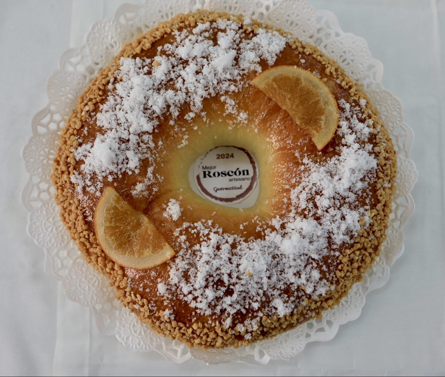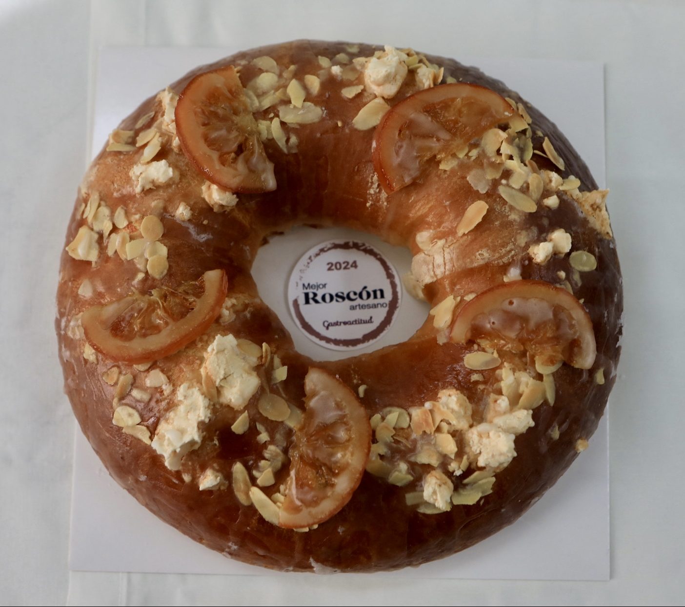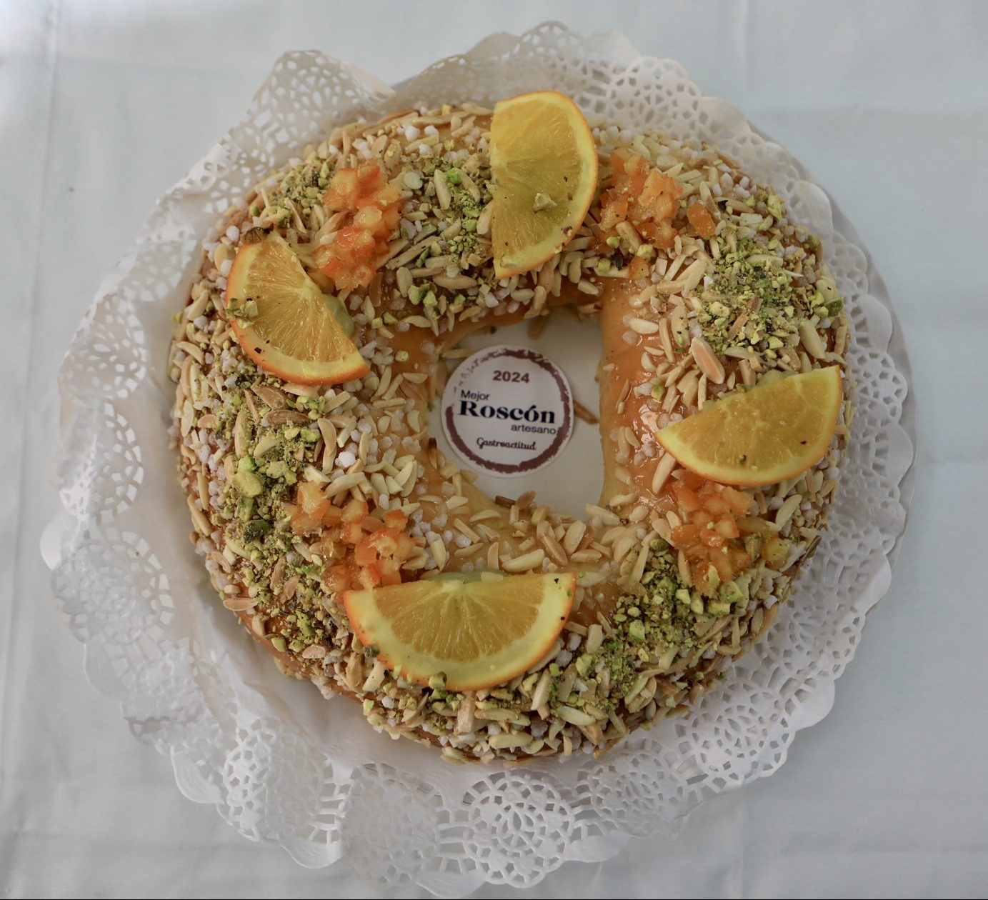 Este es un roscón de miga esponjosa y jugosa, resultado de una doble fermentación que aporta una textura impecable. Su sabor es intenso, con un marcado protagonismo del agua de azahar que le otorga un carácter muy tradicional. La decoración combina azúcar en grano, almendra molida y dados de naranja confitada artesanalmente, elaborada por ellos mismos.