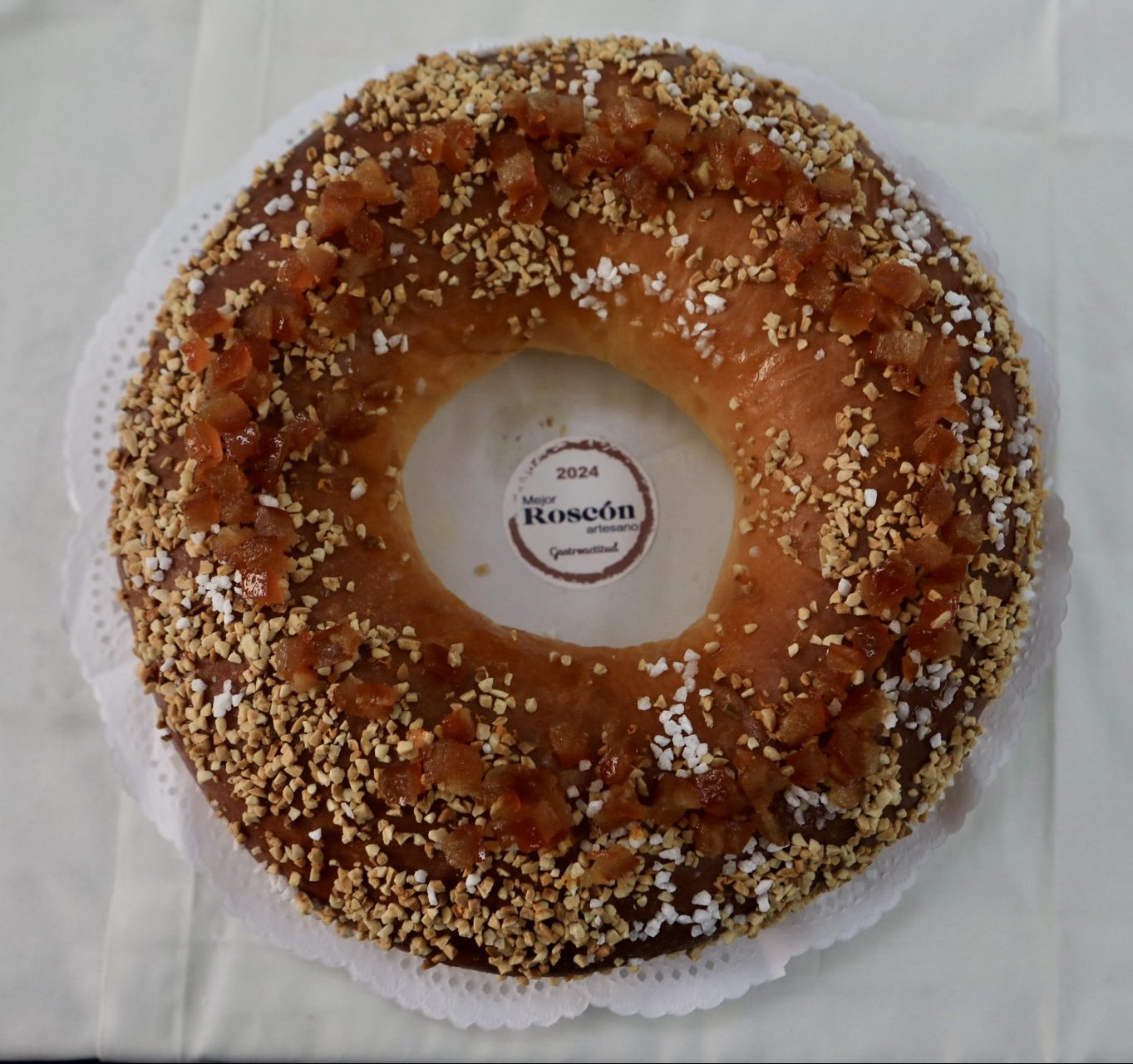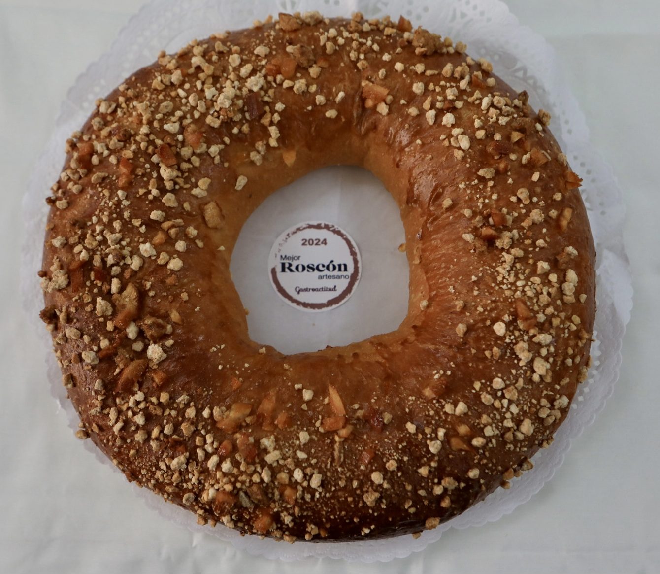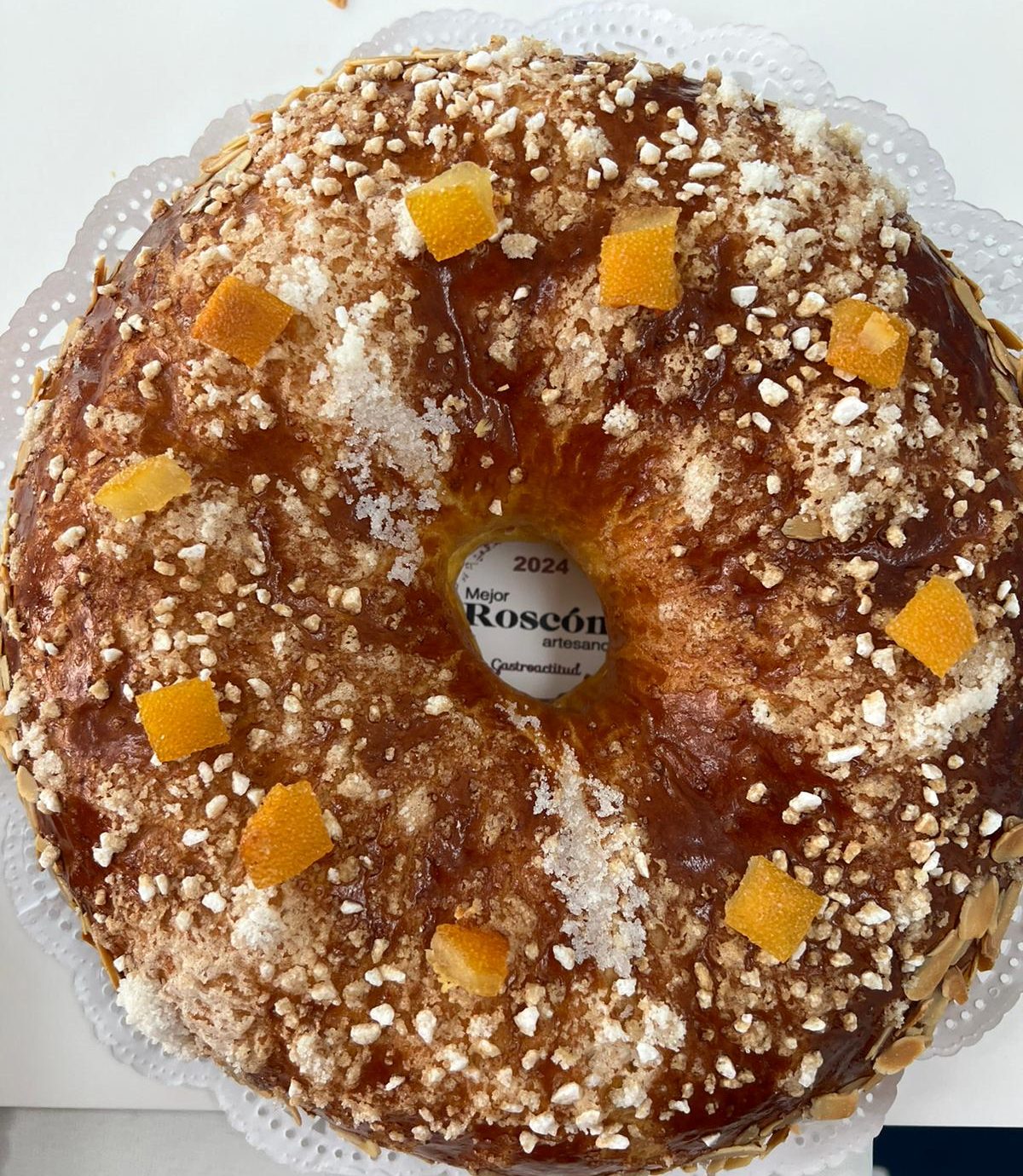 Este es un roscón de miga esponjosa y jugosa, resultado de una doble fermentación que aporta una textura impecable. Su sabor es intenso, con un marcado protagonismo del agua de azahar que le otorga un carácter muy tradicional. La decoración combina azúcar en grano, almendra molida y dados de naranja confitada artesanalmente, elaborada por ellos mismos.
