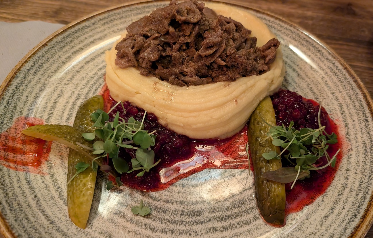 Plato de reno rehogado acompañado de puré de patatas, pepinillos y mermelada casera de arándanos tojos. Uno de los platos estrella de Nili Restaurant, el mejor establecimiento para disfrutar de la gastronomía lapona en la ciudad, junto con el de reno asado (que sirven con una terrina de patata).