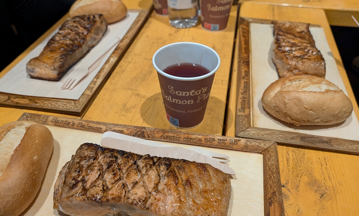 Salmón a la brasa que sirven en Santa's Salmon Place, un restaurante tradicional lapón muy demandado que encontrarás en el interior de un pequeño tipi en el pueblo de Papá Noel. Cuenta con un gran fuego central en el que cocinan el pescado. Lo puedes acompañar con glögg, una bebida caliente finlandesa con especias.