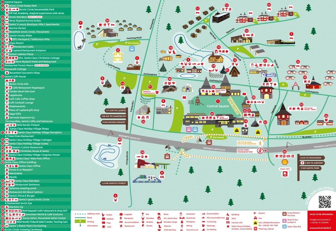 Si hay una visita obligada cuando viajas a Laponia es la de Santa Claus Village, el pueblo de Papá Noel. Está ubicado a unos 8 kilómetros de Rovaniemi y tienes autobuses que te trasladarán desde el centro de la ciudad. En el mapa encontrarás otros servicios disponibles en la villa.