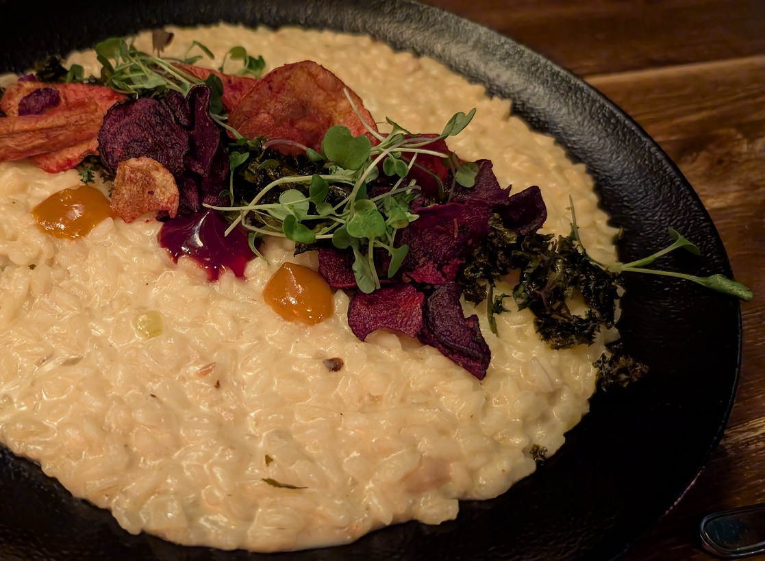 Otro de los platos más demandados de este reconocido restaurante de cocina lapona es el risotto de setas, con su crujiente de raíces y una mermelada casera que -como puedes ver- acompaña a muchos de los platos de su carta (como en todos los establecimientos especializados en la gastronomía local).