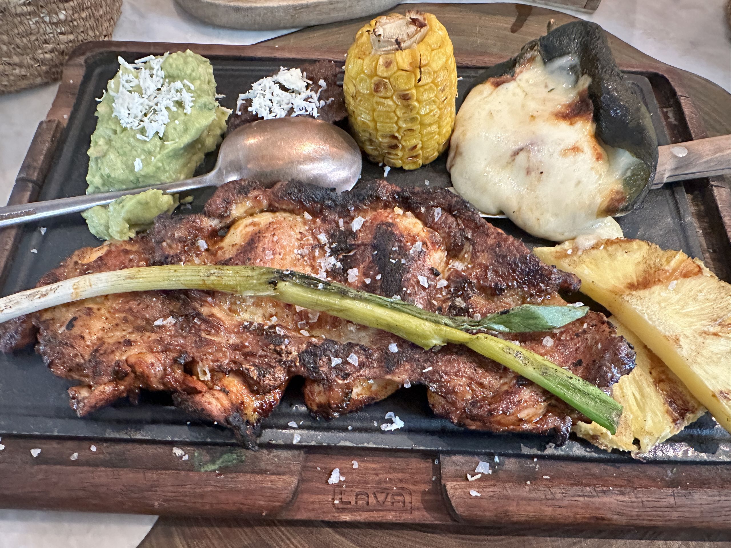 Y si el segundo pilar del restaurante Bakan es el asado de leña, tienes que probar alguna de sus numerosas opciones de carne, pescado y pollo. Jugoso, sabroso y perfecto el medio pollo de corral deshuesado (28€) al pastor con piña, acompañado con elote asado, chile poblano relleno de queso, frijol negro refrito, guacamole y cebolla cambray para que te sirvas los tacos a tu gusto o lo comas por separado en el plato. También son buenos los postres, del que destaca su tarta campechana, un pastel crujiente de campechana con helado de vainilla, nueces y dulce de leche.