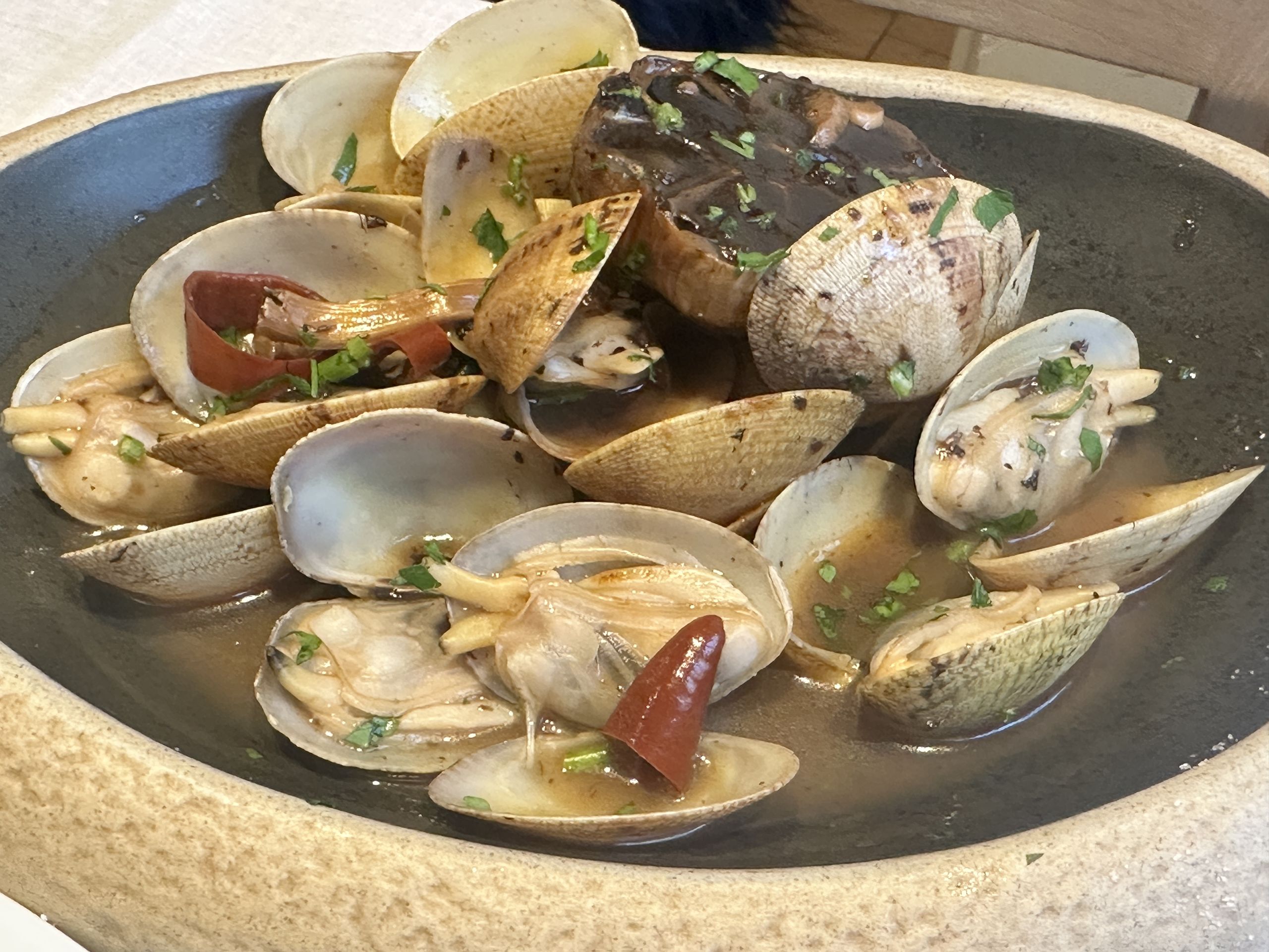 Así que para productazo los camarones (12,50€ / 100grs) frescos y perfectamente cocidos. También ricas, gordas y con buen coral las zamburiñas (16,80€) preparadas a la plancha con un ligero aliño. Platazo imprescindible el de las almejas en salsa de ajo negro (28,50€), con un fondo que le aporta el ajo negro que nos hace dudar de que esté elaborado a base de carne. Un manjar con el que además huntarás pan.