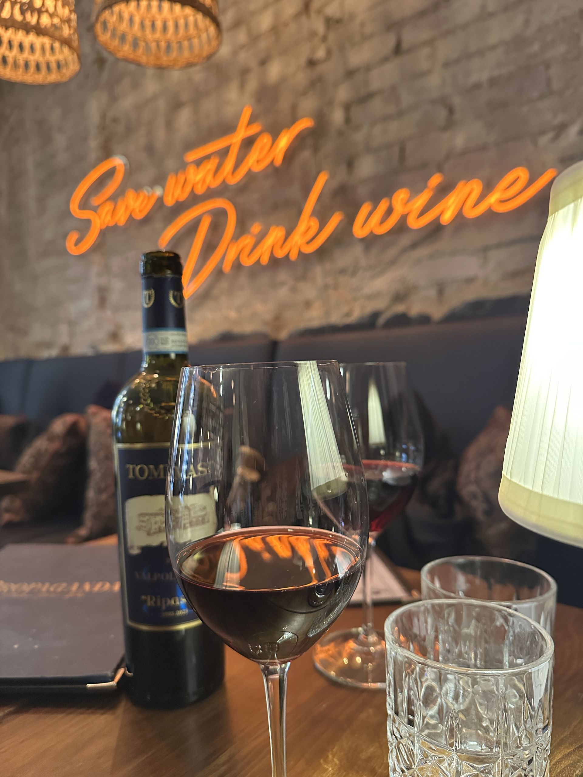 Con dos ubicaciones en la capital –calle de Jorge Juan, 21 y calle de la Libertad, 12– se adapta a esos dos ambientes, el de la calle más exclusiva y gastronómica de la capital y el del emblemático y cosmopolita barrio de Chueca. Por que en esta vinatería creada por Mattia Pierantoni el ambiente también juega un papel importante ya que es muy acogedor e invita al disfrute, como dice su eslogan en resplandeciente neón: "Save water, drink wine".