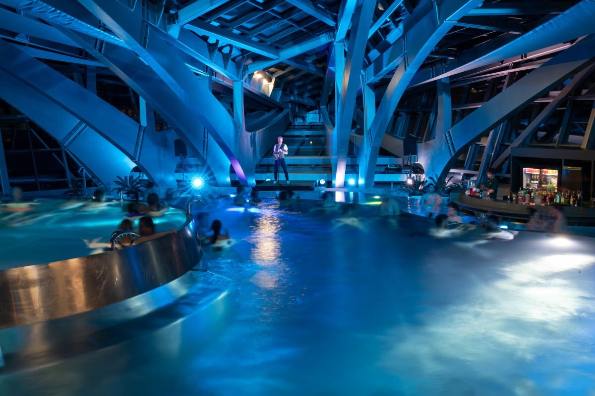 Caldea, el centro de ocio termal de Andorra, ofrece a sus visitantes este invierno una experiencia nocturna que les permite bañarse con una copa de champagne dentro del agua, hacerse 'masajes dúo' y disfrutar de la gastronomía.