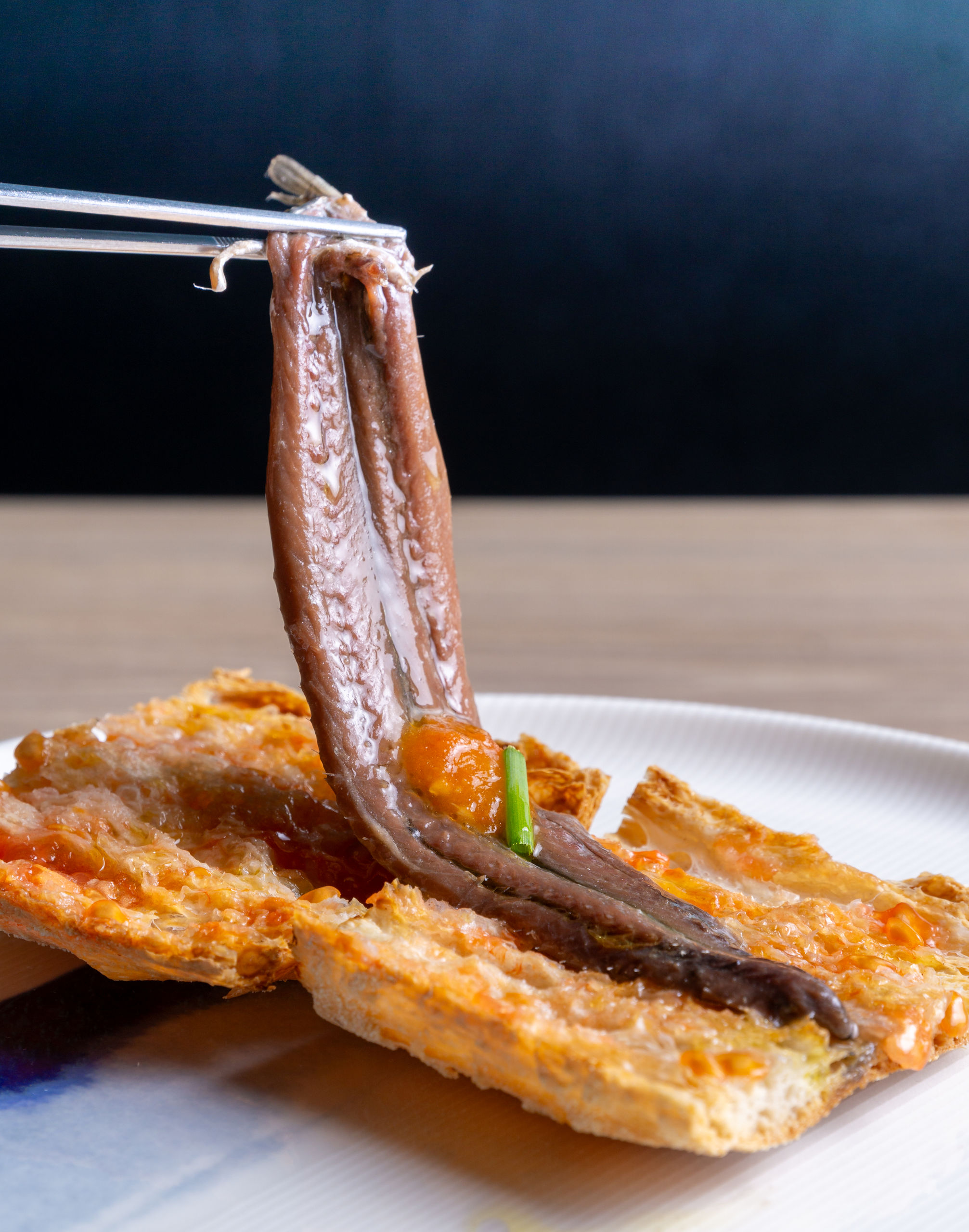 También ricas las anchoas del Cabo de Rosas maceradas con AOVE Arbequina (24€ 5 unidades). Son 100% artesanales y como nos cuenta Joan, llegan enteras en sal muera, las ponen tres horas en agua cambiándola cada 20 minutos. Se deja en aceite turbio –muy utilizado en esta casa– con unas gotas de vinagre y cuando han pasado seis horas se abre, se quita la espina y se sirve. Este último paso se hace en el momento en el que las vas a disfrutar.