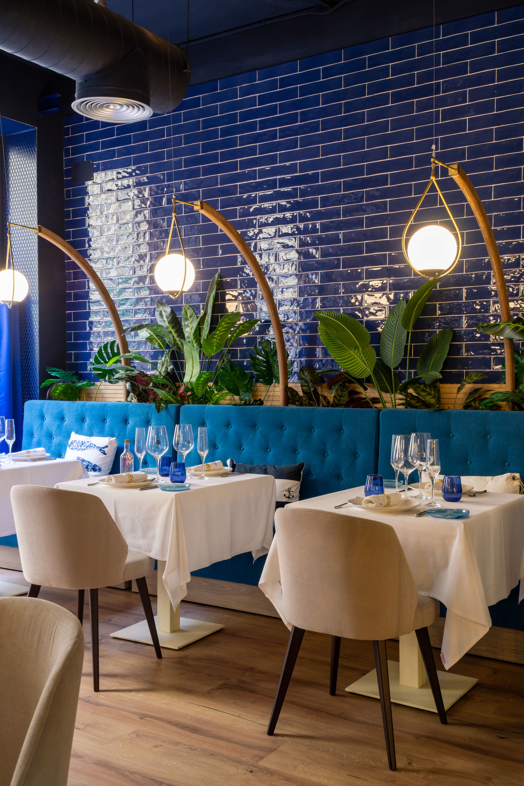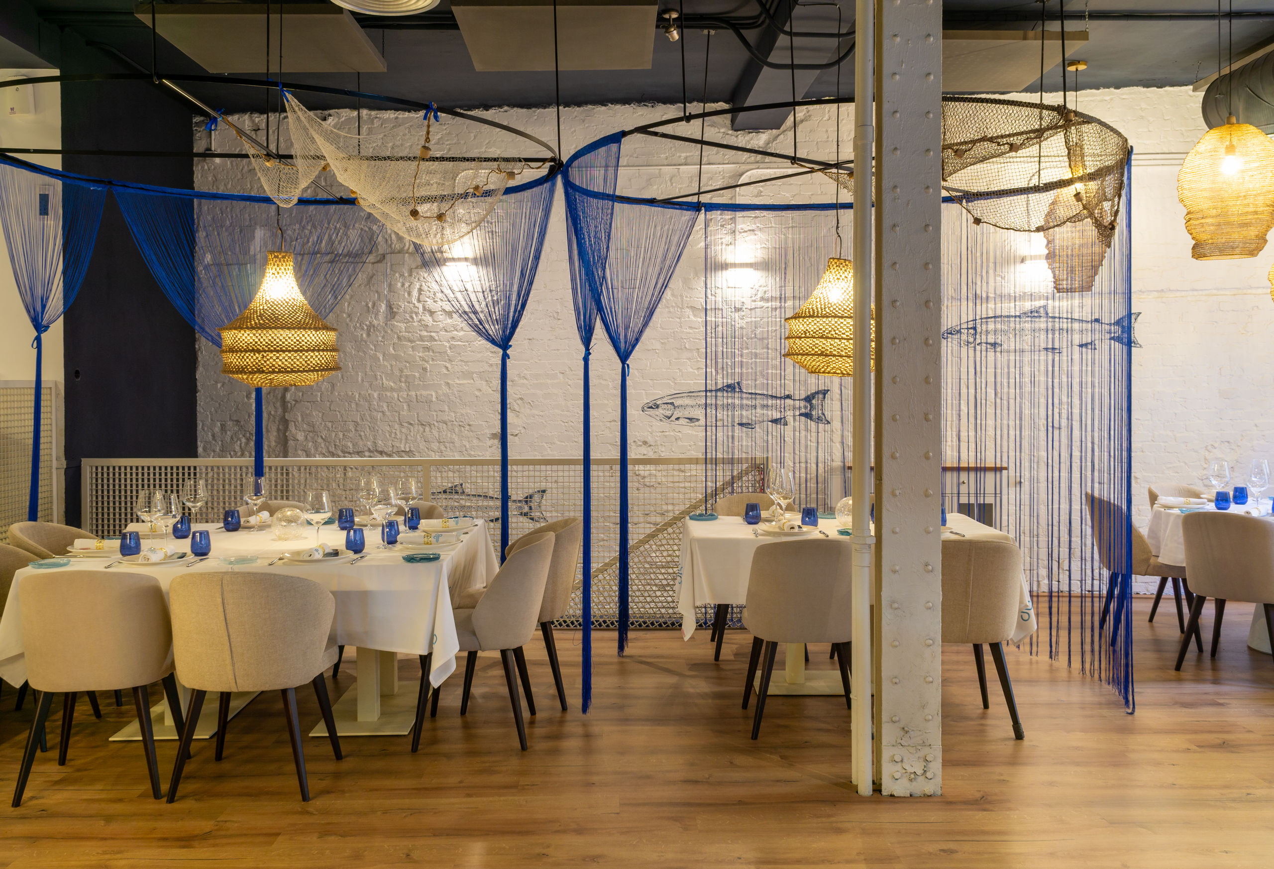 Sa Marinada es mar y eso se refleja en la decoración del local llevada a cabo por Dorotea Estudio. Azules, blancos y dorados son los colores que dominan el espacio, tonalidades que le otorgan una estética marinera a la que contribuye la presencia de tejidos naturales, multitud de vasijas de cerámica y las redes de pesca.