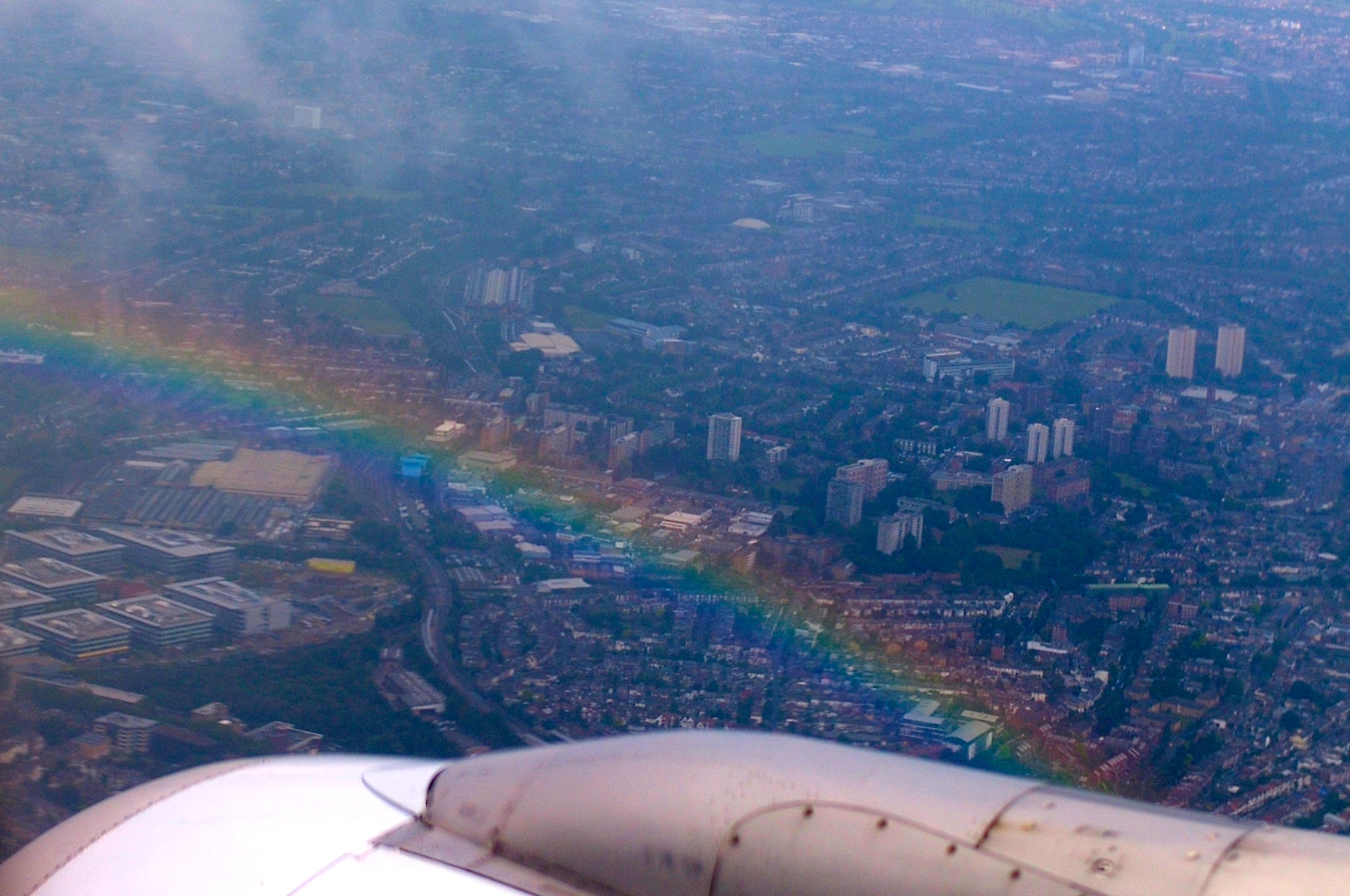 Este fenómeno óptico y meteorológico causa la aparición en la atmósfera terrestre de un arco multicolor. En la imagen, se aprecia desde un avión que sobrevuela la ciudad de Londres.