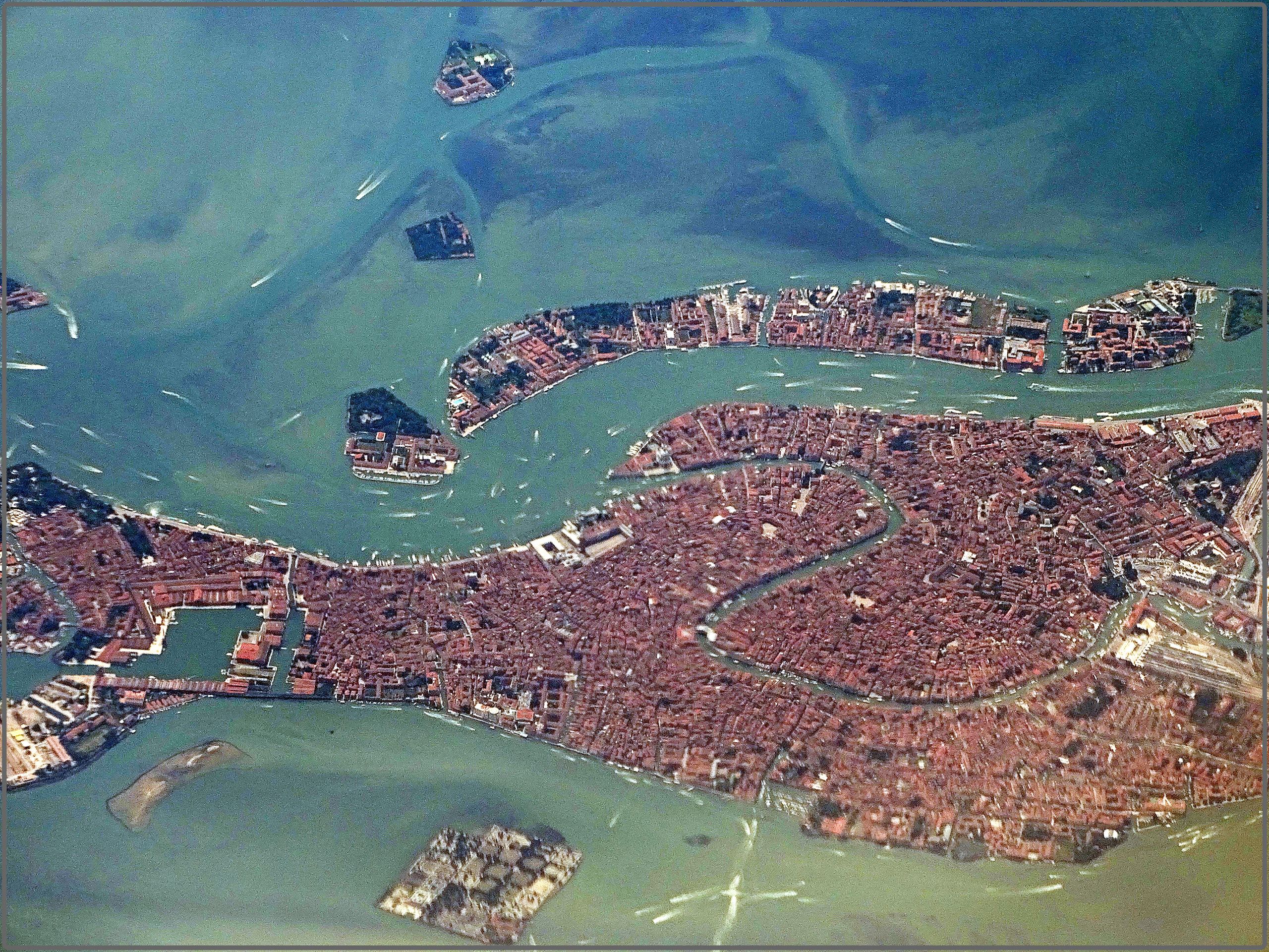 Increíble fotografía tomada desde el cielo y mostrando la particularidad geográfica de Venecia, que la convierte en uno de los destinos turísticos más impactantes y populares del mundo.