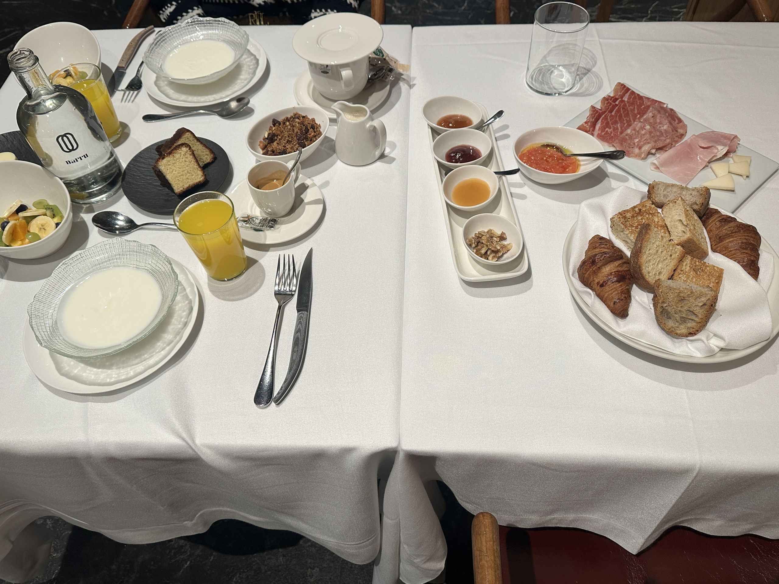 Fundamental su tabla de embutidos para acompañar con los deliciosos panes y el tomate rallado. Un delicioso jamón ibérico, junto a una maravillosa cabezada de jabalí y muy rico también el queso. Bollería casera y tostadas con aguacate sola o con salmón ahumado. Tamibén huevos fritos, tortilla, revueltos o escalfados.