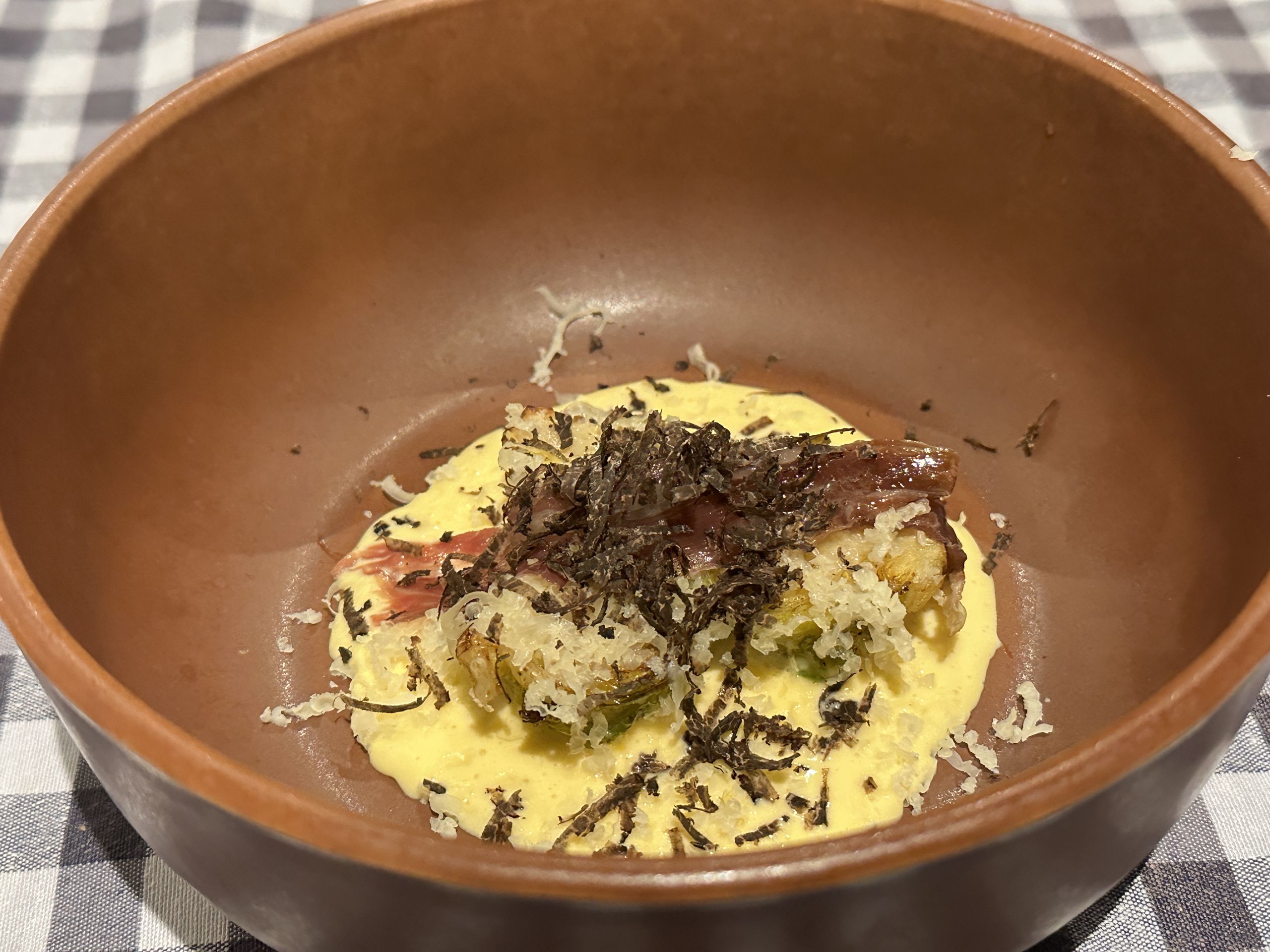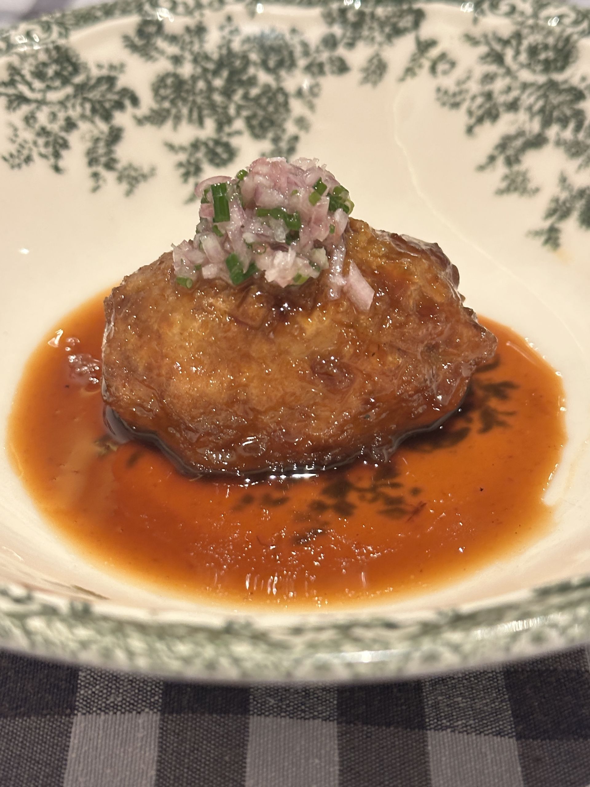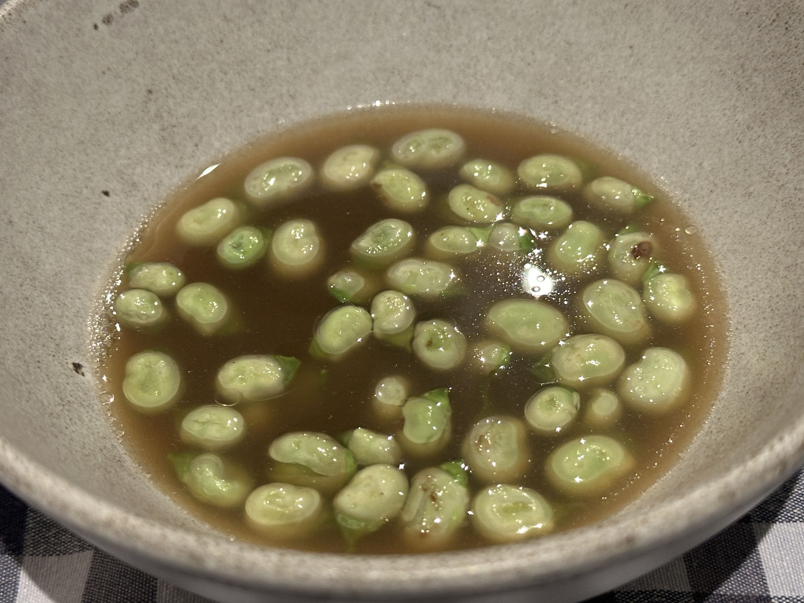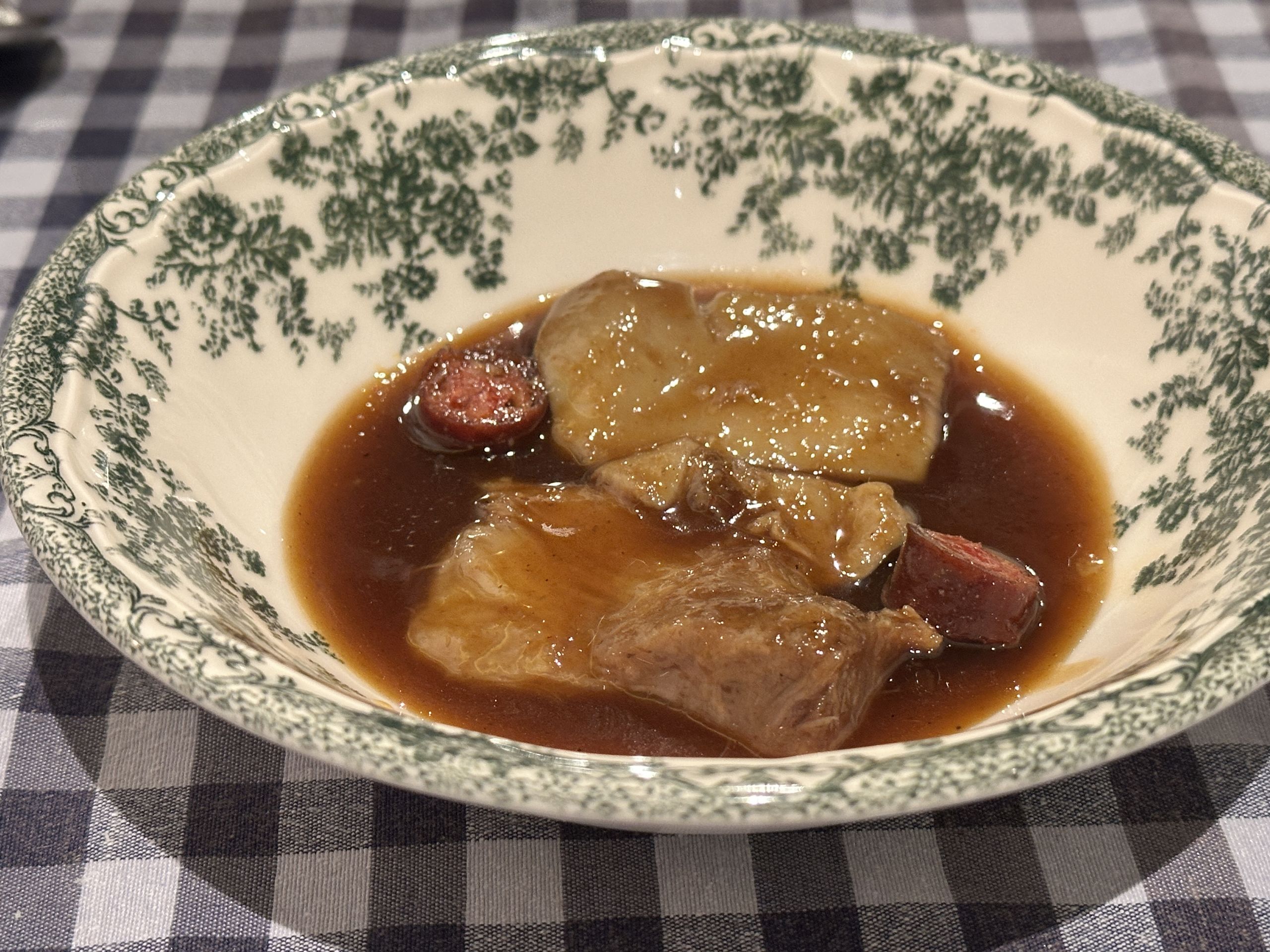 Así que aprovechando las verduras de temporada llegan los siguientes platos, preparados para llorar de la emoción y recuperar esos sabores de una cocina tradicional, aparentemente sencilla, pero que lleva su tiempo para potenciar lo mejor de cada ingrediente. Excelente el caldo de verduras de inviero con las primeras habitas tiernas (26€). El caldo lo elaboran de forma minuciosa con pochas, coliflor y apio y las habitas están ligeramente tocadas en la sarten por lo que su sabor permanece intacto, al igual que la textura fresca. Mucho más fuerte es lo que te vas a encontrar con su pelota de cocido con el relleno de gallina. Aquí te vas a reencontrar con otro guiso de toda la vida, fuerte pero delicioso, para refrescar su potencia añaden un fondo de un caldo reducido con una vinagreta.