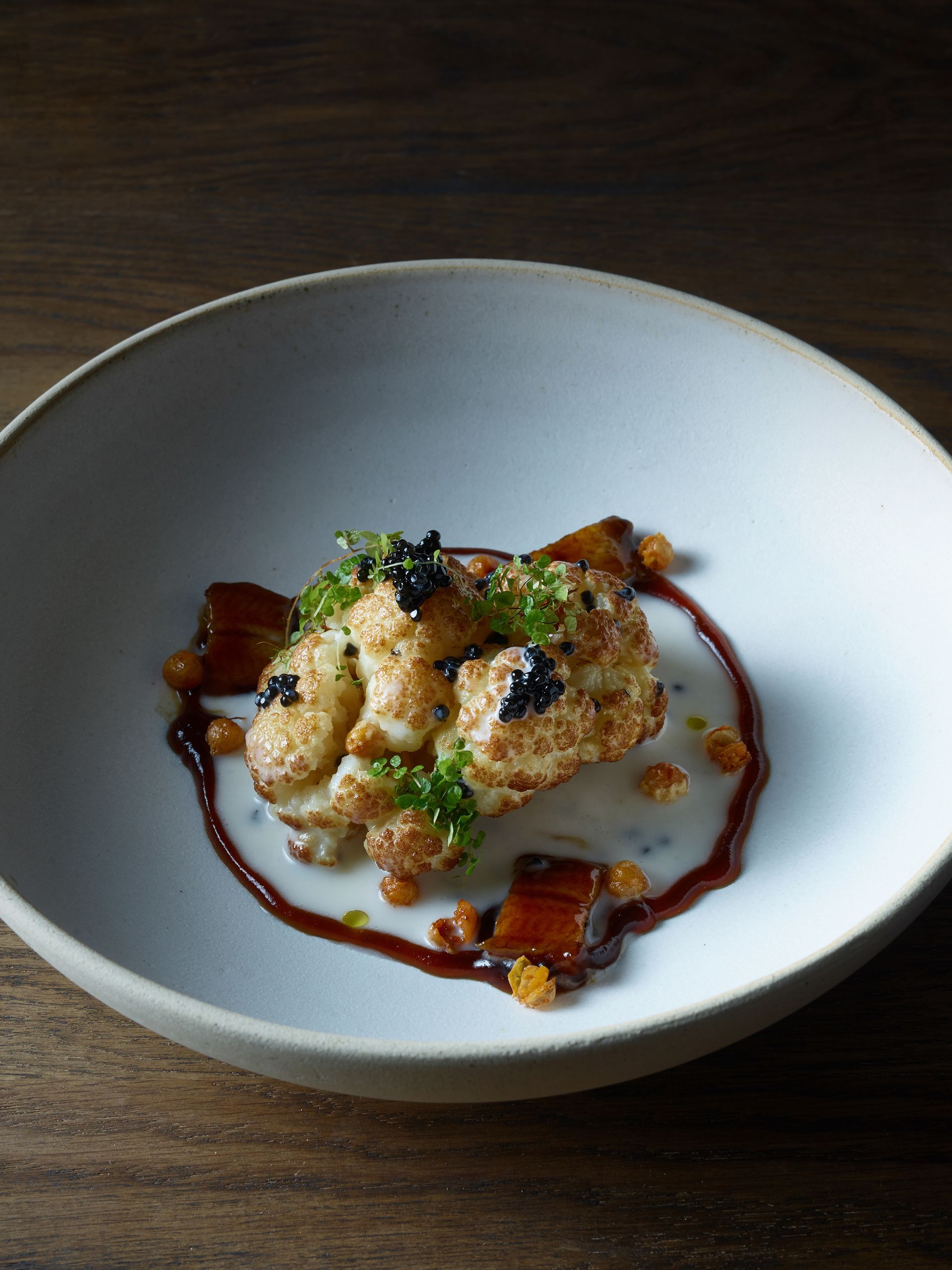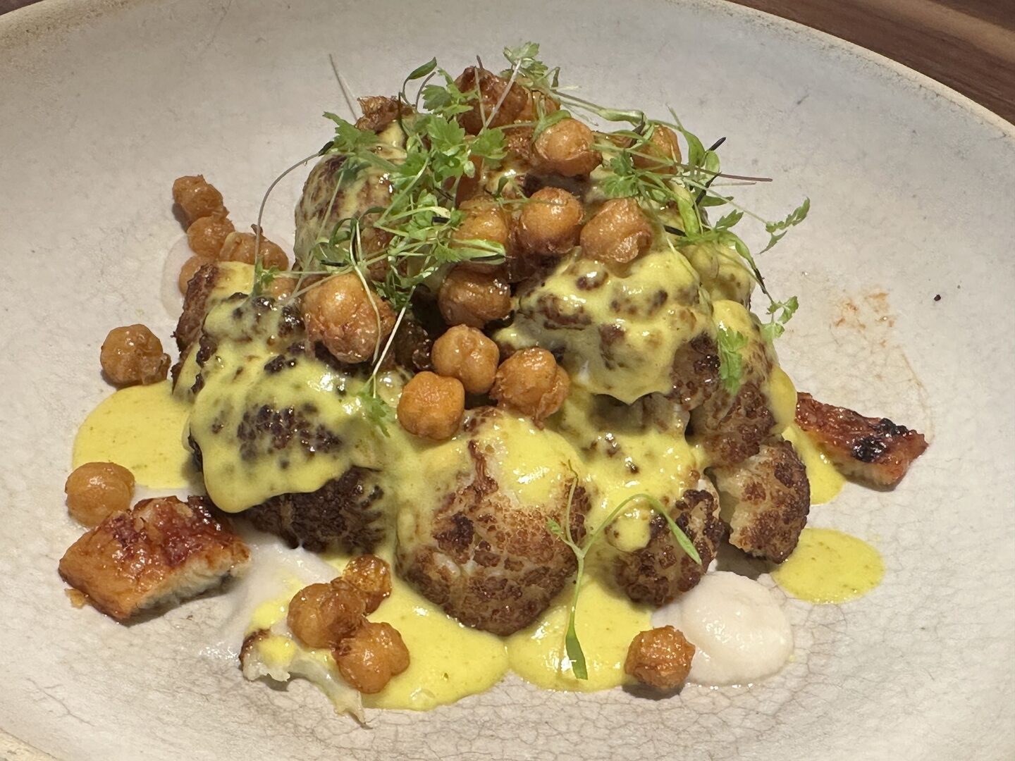 Y de esa maestría en la cocina nos llega uno de los platos que más nos gustó, una coliflor en salsa de coco y anguila (16€). Es un plato contundente, así que mejor compartirlo elaborado con yogur de coco y anguila, además de unos garbanzos tostados para aportar el toque crujiente. Y otro de los platos que llevan en carta desde sus inicios son las miso cod balls (24€), a modo de buñuelos de bacalao negro marinado en miso y albaricoque confitado, un bocado redondo, nunca mejor dicho.