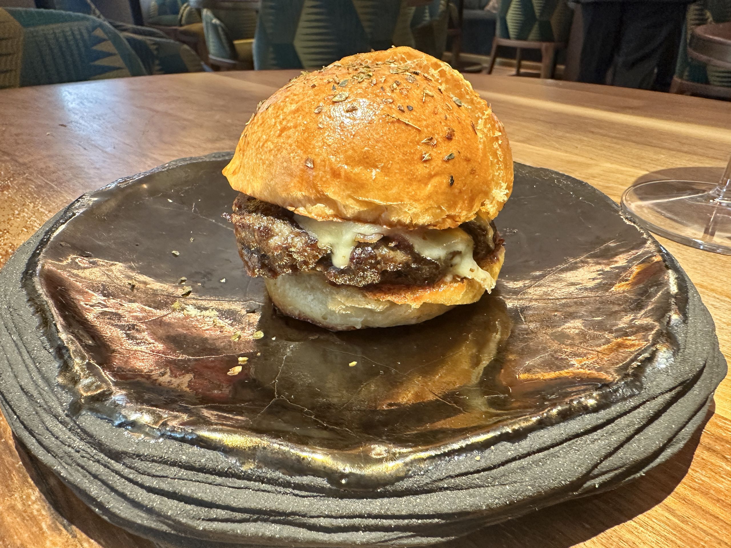 Para terminar la parte salada del menú, una buena empanada melosa de costilla de vaca a la brasa y berenjena a la llama acompañada de salsa de tuétano (19€) y una deliciosa media burger de Wagyu A-5 de Kagoshima con panceta de Casa de Alba, queso ahumado de Pría y salsa ABYA (21€), sin lugar a dudas una hamburguesa que hay que probar al menos la primera vez que acudes a este restaurante, aunque corres el riesgo de querer pedirla cada vez que vas.