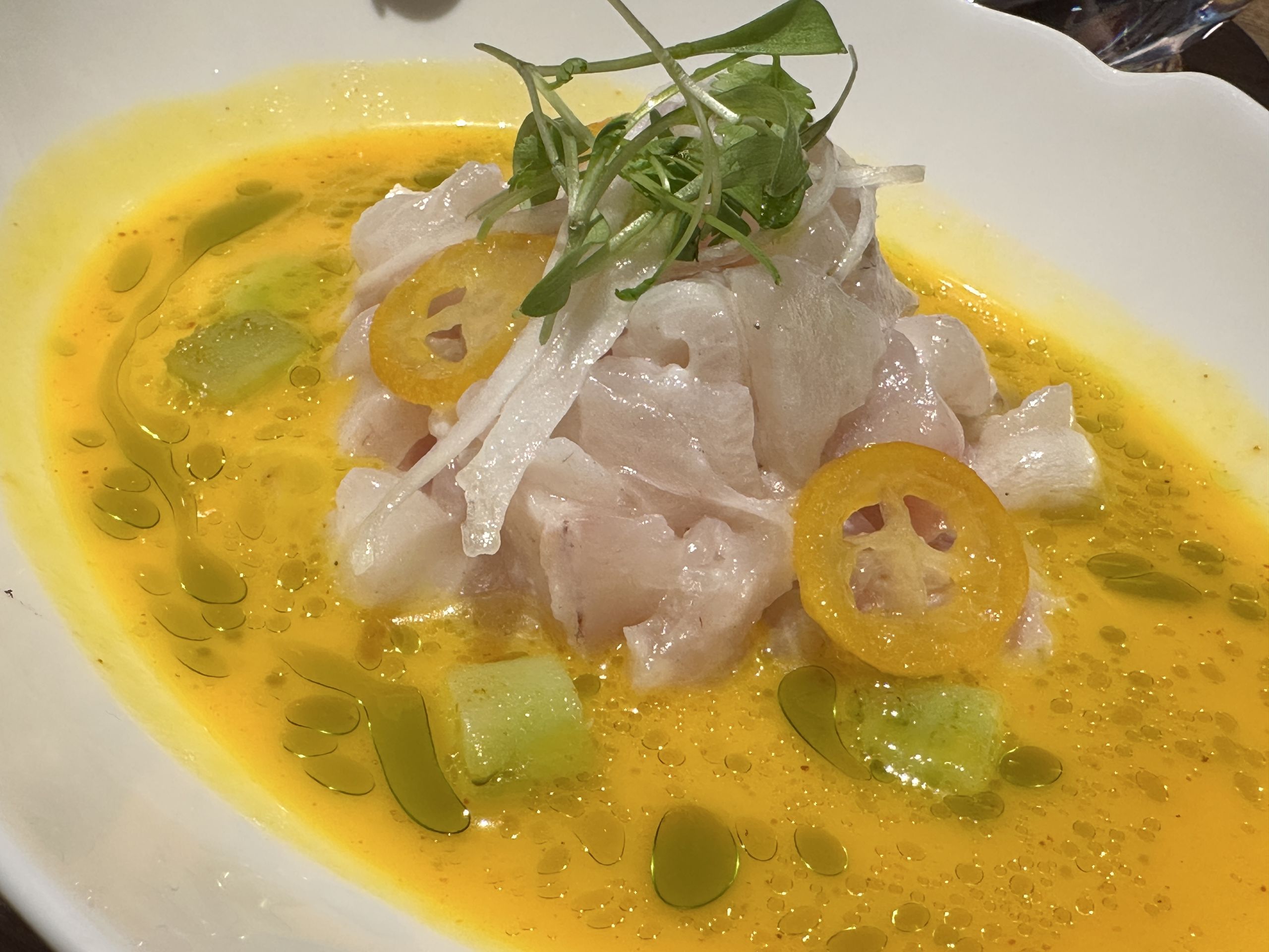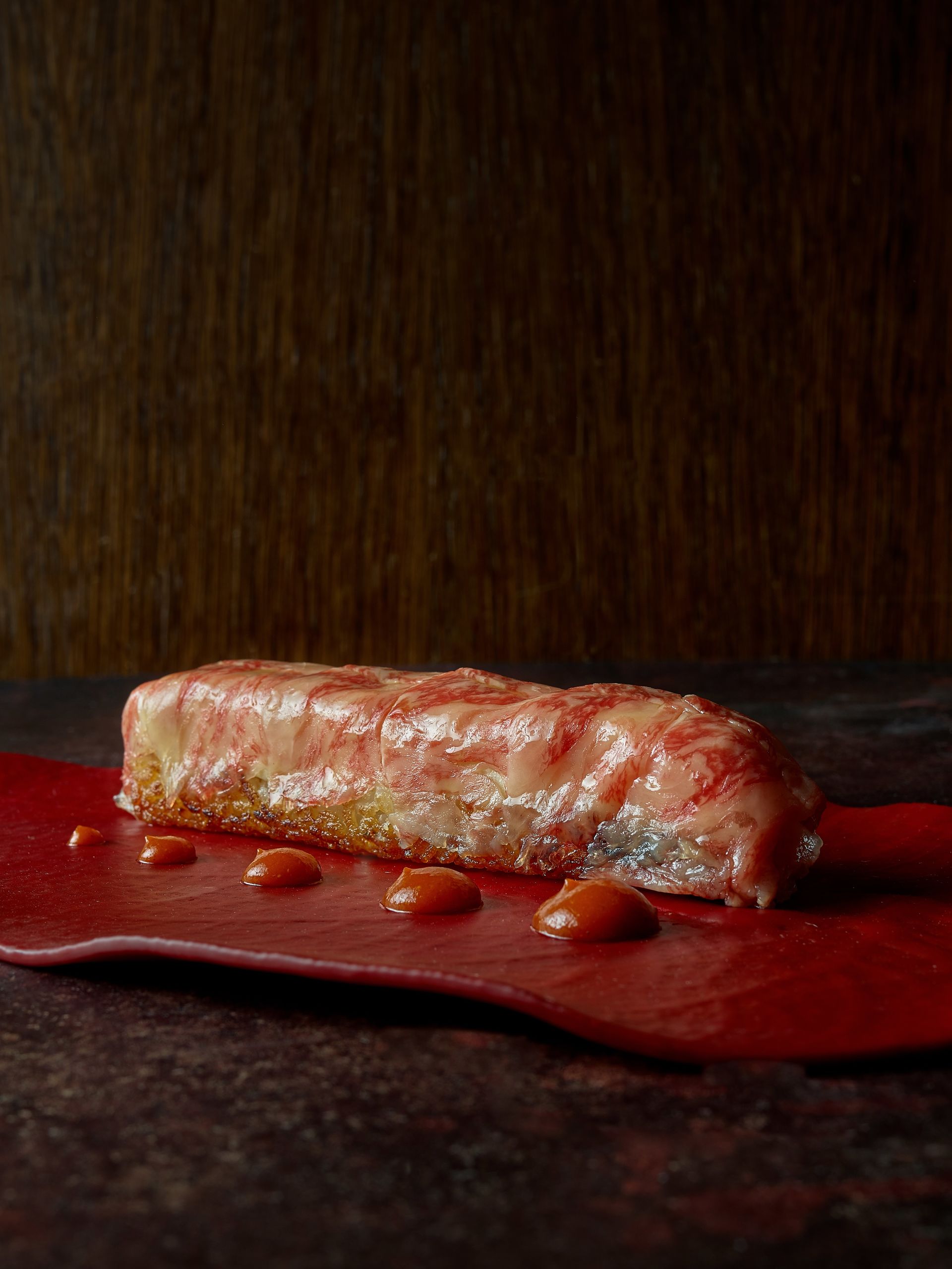 Y desde luego que el plato con el que empezamos es para volver. Un muy buen ceviche de pescado blanco, leche de tigre de mandarina, yuca y cilantro (21€), ligero, fresco y perfecto para dar inicio a la velada. Seguimos con una plato con producto de primerísima calidad y que es uno de los icónicos del restaurante, la ensaladilla japonesa de Wagyu A-5 sopleteado, origen Kagoshima (25€), lo terminan en la mesa con el soplete para que las finas láminas de carne adquieran ese ligero toque a fuego.