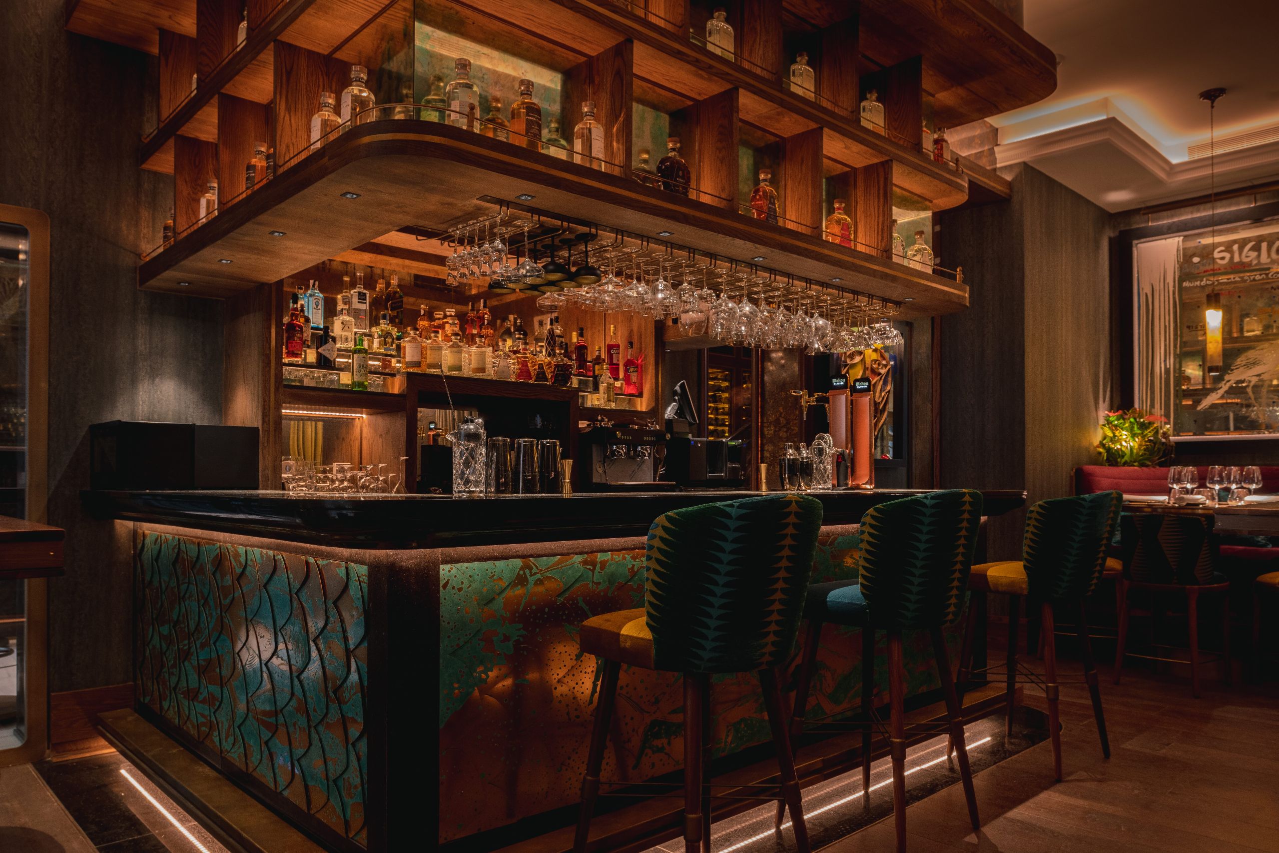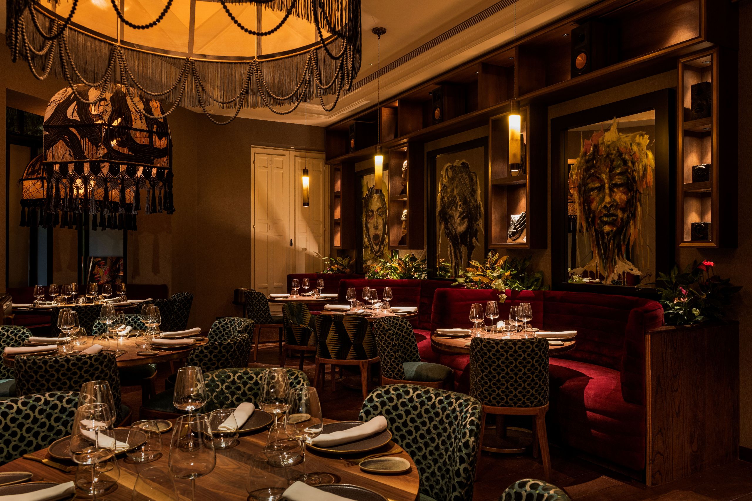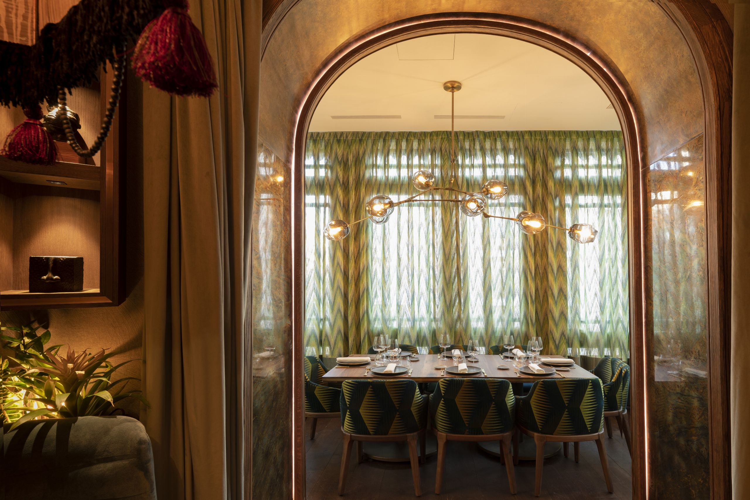 La distribución del palacio es en cuatro plantas. La planta subterránea es en la que se encuentran las cocinas y los baños –con personal de asistencia incluido–. La planta baja es el punto inicial de la experiencia en ABYA, abierto a cualquier hora del día, con cocina ininterrumpida y dos barras. Perfecto para probar la carta acompañado por un cóctel de autor mientras escuchas música de un DJ en directo y te dejas deslumbrar por su decoración.