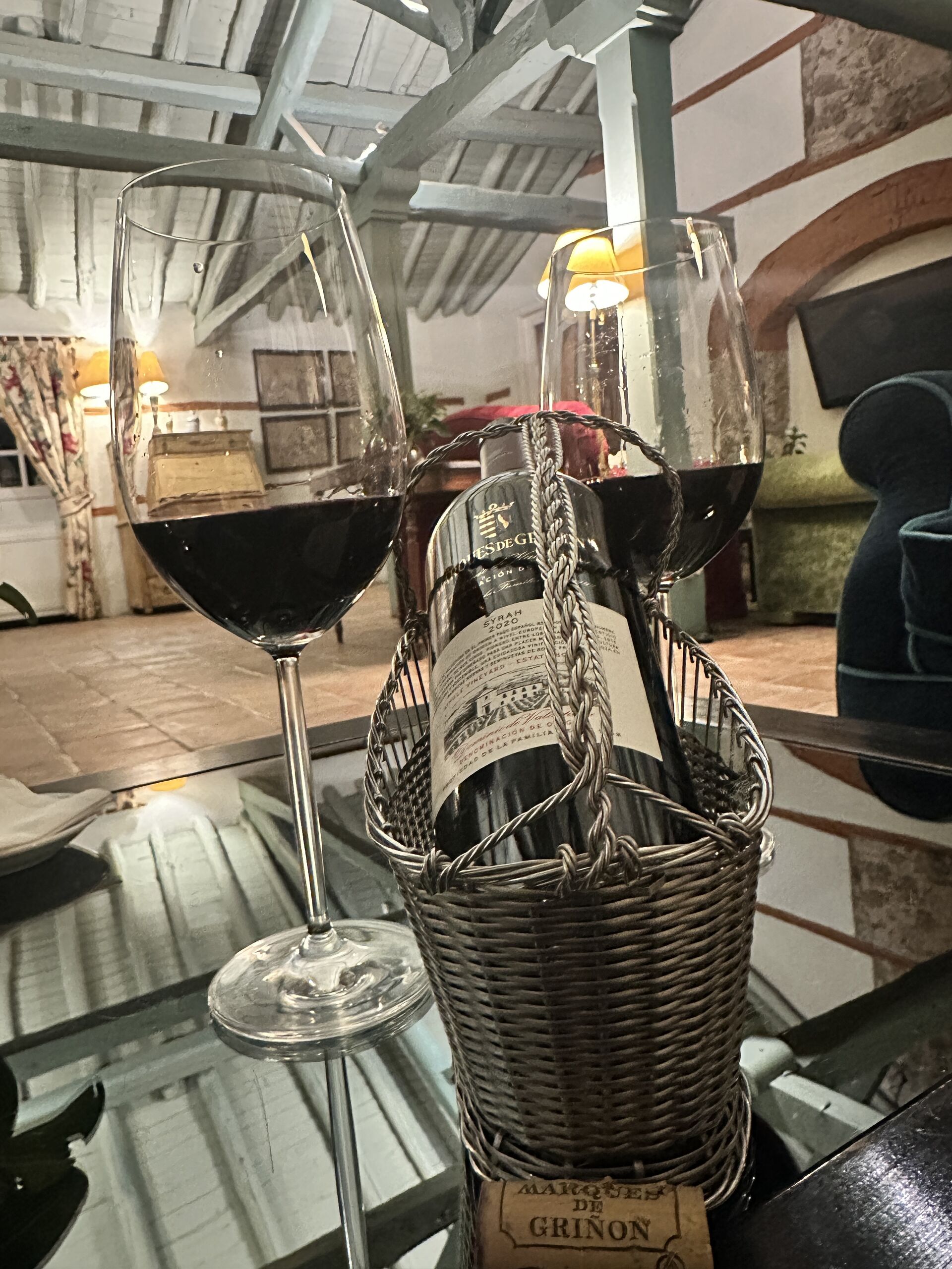 Destaca también el servicio del restaurante y la carta de vinos, ambas cosas obra del maître y sumiller, Francisco Javier Domínguez. En nuestro caso maridamos la cena con un fantástico vino tinto Marqués de Griñón Syrah 2020 del Pago de Valdepusa elaborado por Bodegas Marqués de Griñón y otro de tierras cercanas de Extremadura, Habla del Silencio, elaborado por Bodegas Habla con uvas Syrah, Cabernet Sauvignon y Tempranillo.