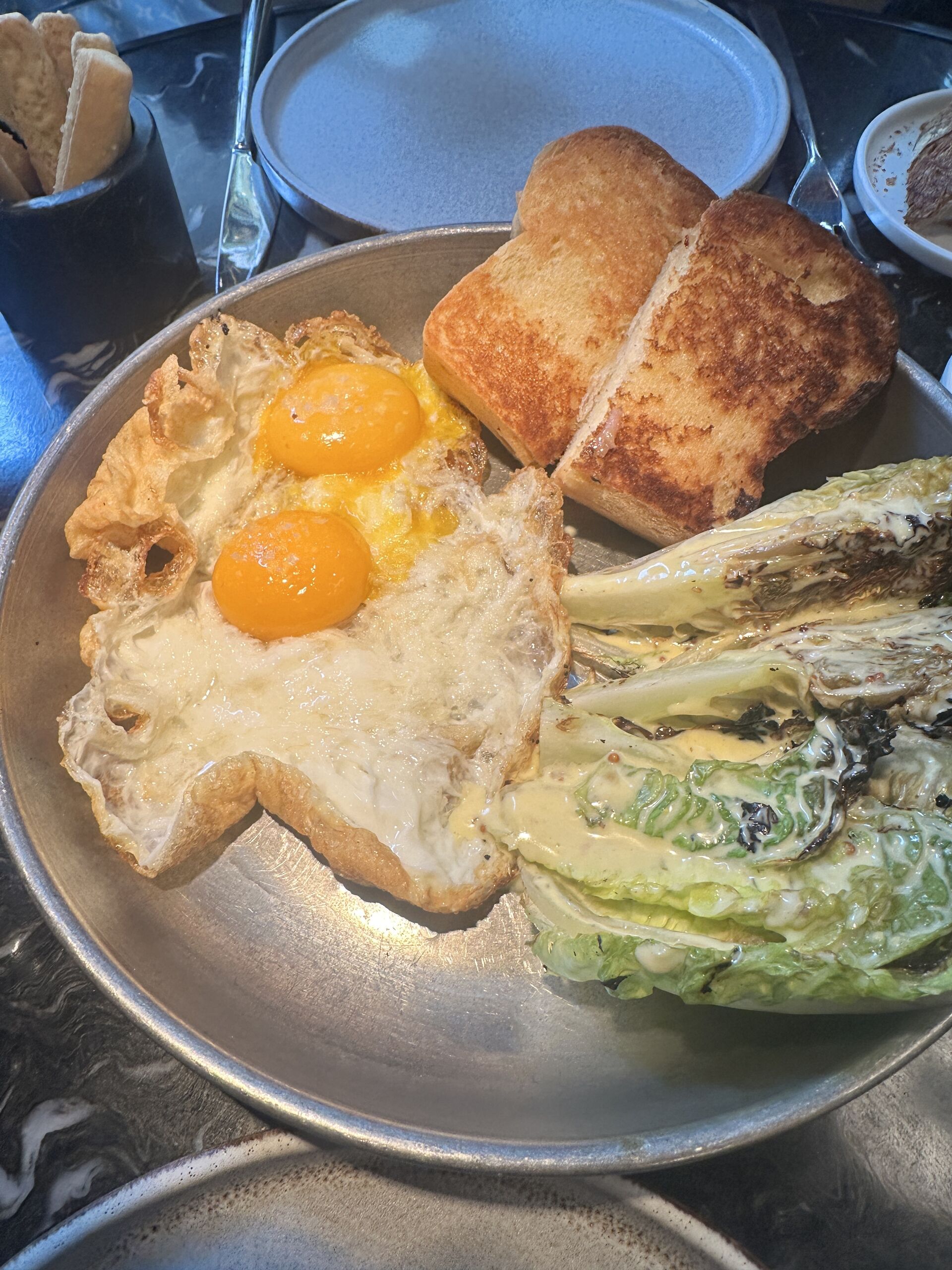 De esas verduras y huevos de la huerta ecológica abulense destacan los cogollos a la brasa, huevo frito de dos yemas y brioche tostado (16€), una muy buena combinación en la que saborear el producto.