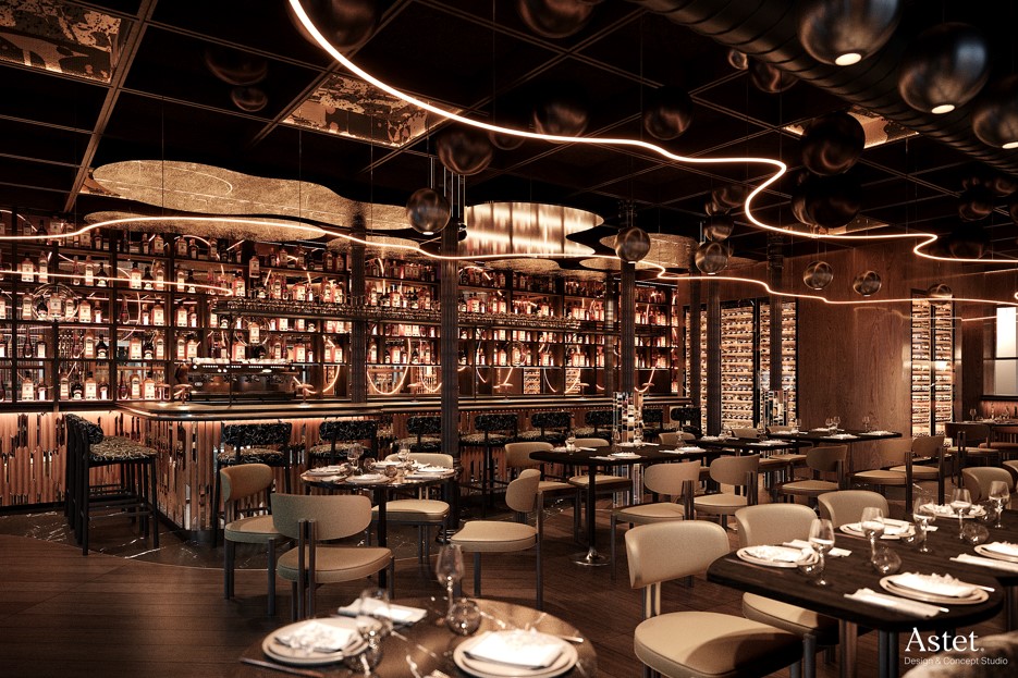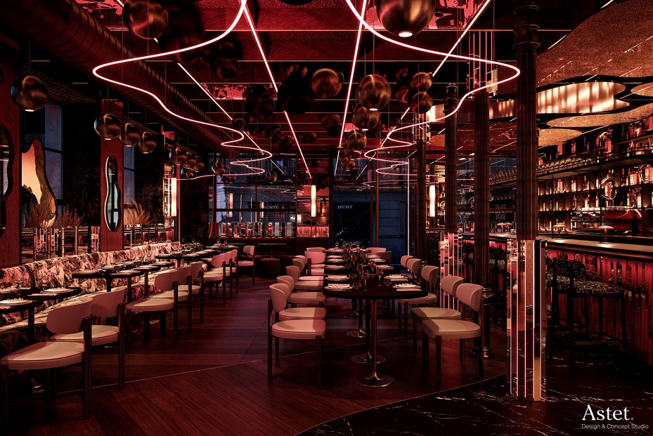 Este enclave también destaca por su interiorismo desarrollada por Astet que busca transformar el espacio en un entorno que combine elegancia, singularidad y accesibilidad, evocando una atmósfera alegre y dinámica. El proyecto tiene como objetivo encapsular la esencia cosmopolita y sofisticada de su entorno. Roostiq Bar brilla tanto de día como de noche, donde su iluminación cambia de color, y se caracteriza por la convivencia de contrastes, tradición y modernidad, calma y vitalidad.
