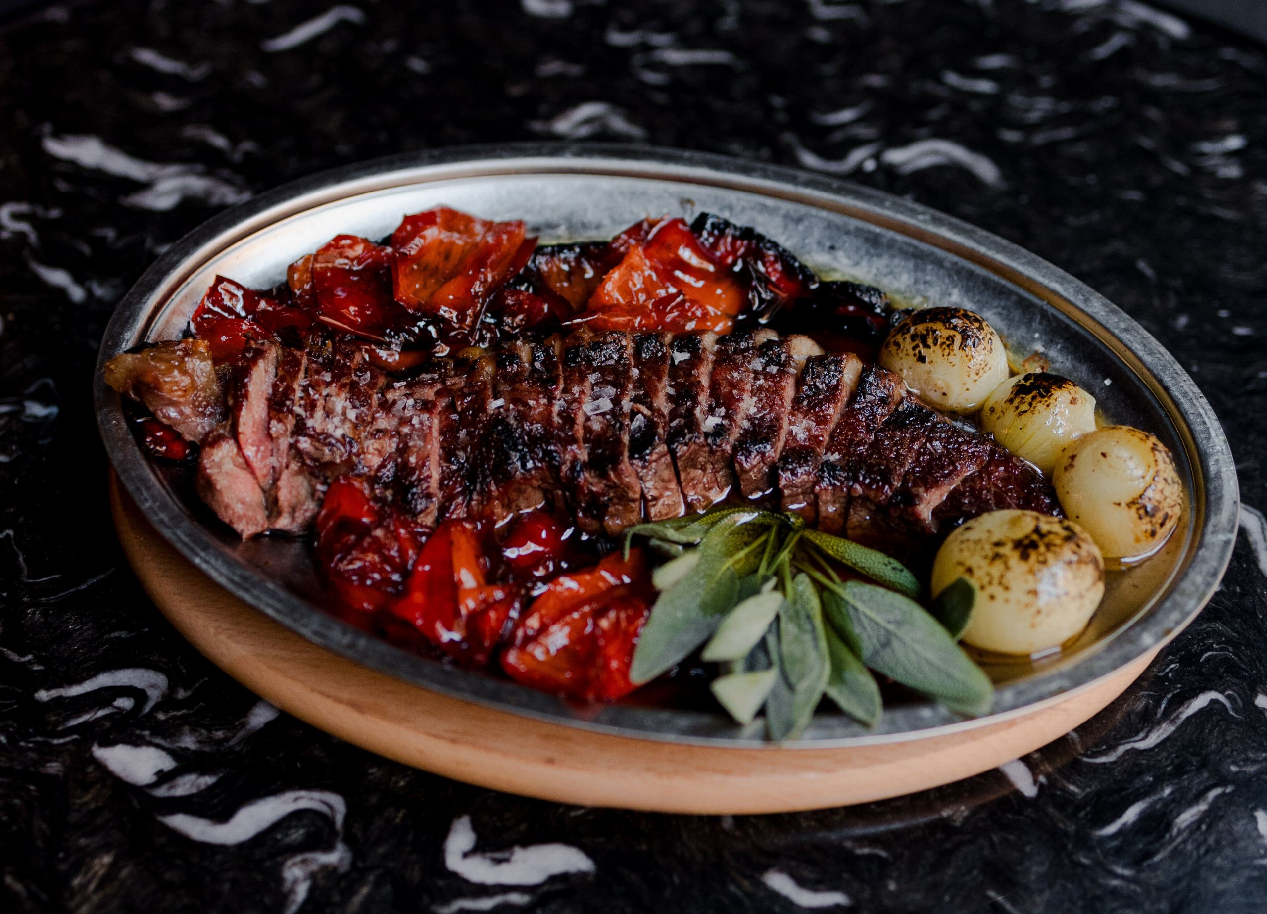 Tanto las carnes como los pescados –donde se ofrece rodaballo y lubina a la brasa– se pueden acompañar por patatas fritas, puré trufado, ensalada de lechuga y cebolleta, cebolla gratinada con trufa, pimientos rojos fritos al caldero o verduritas baby.
