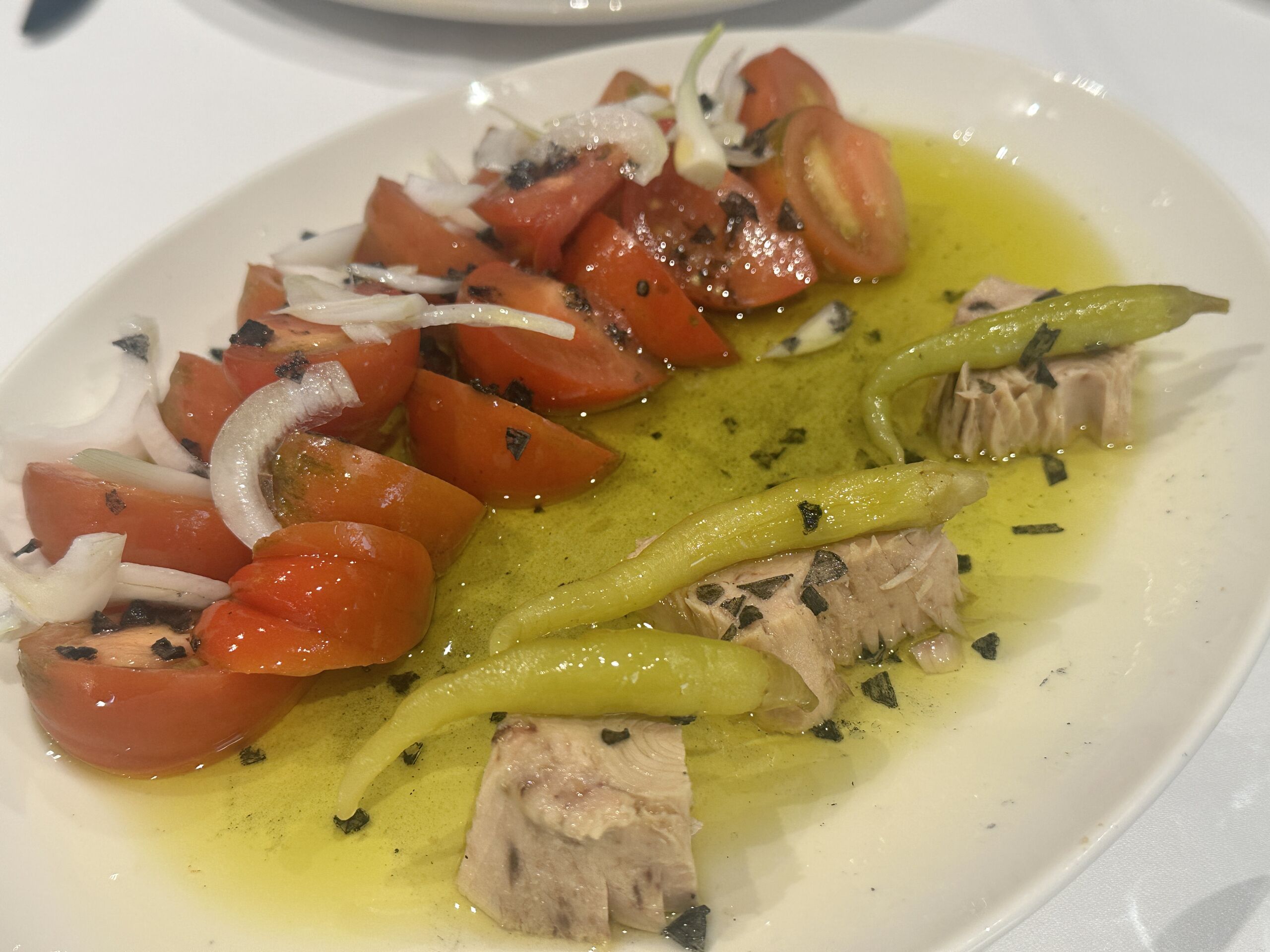 Ya sea en su gastrobar o en el restaurante, la experiencia la tienes que comenzar con sus torreznos caseros (10€), una de sus joyas con una corteza crujiente y una carne tierna y jugosa. Otro de sus platos destacados de los entrantes es la ensalada de tomate de temporada con tacos bonito del norte en aceite de oliva, cebolleta dulce y piparras de Ibarra encurtidas (25€), buen producto, elaboración propia como el bonito del norte y sabor para rebajar esa grasita tan deliciosa del anterior bocado.