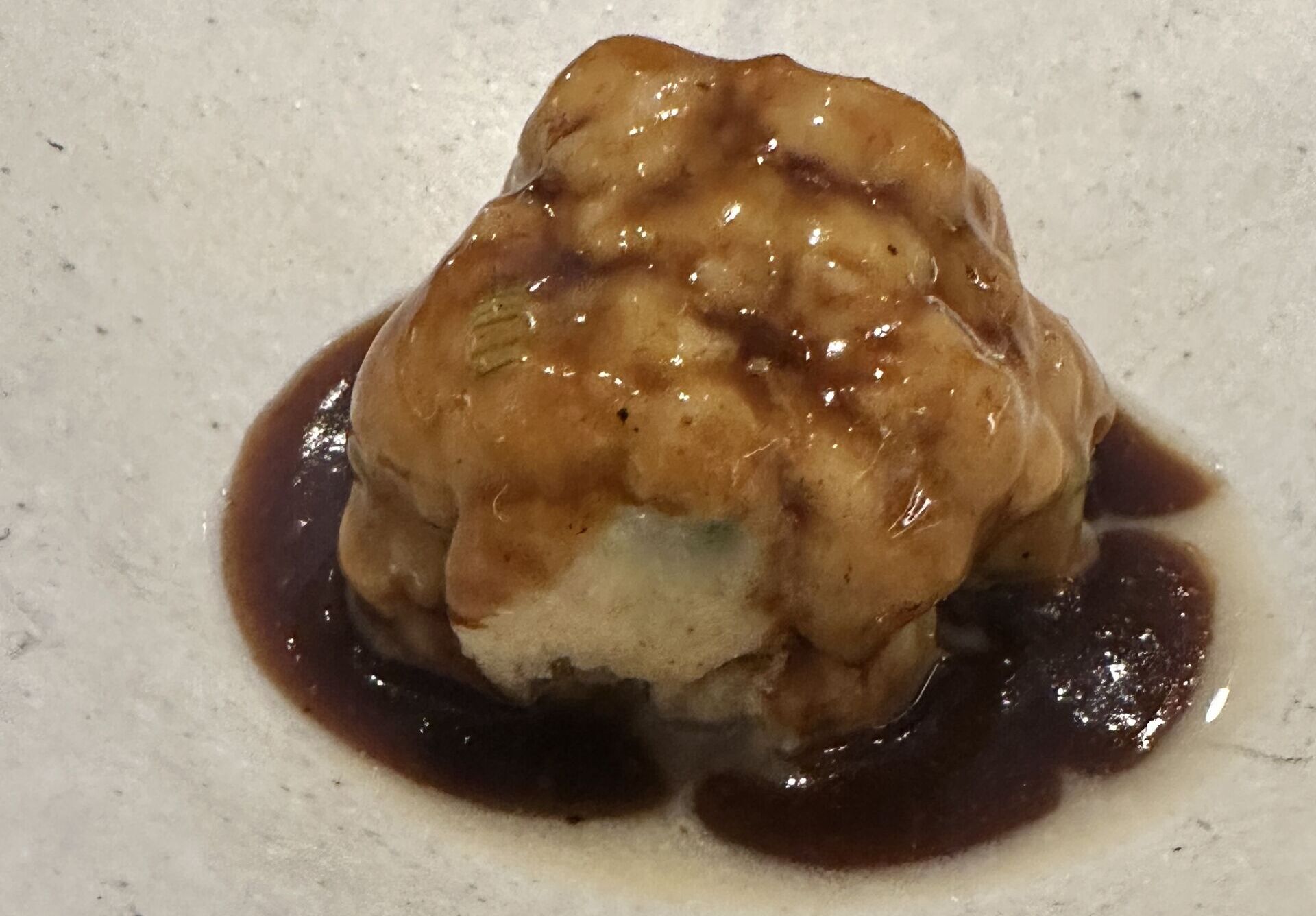 Lo mismo que pasa con los guisos lo vemos con los fondos de sus platos. Productazo y fondos que aportan un sabor exquisito, como el caso de la cococha nacional a la brasa con demi-glace de manos de ternera. También otro plato para enmarcar es el fuera de menú que nos saca el chef de una albóndiga de congrio negro gallego con fondo de Gallo Celta.