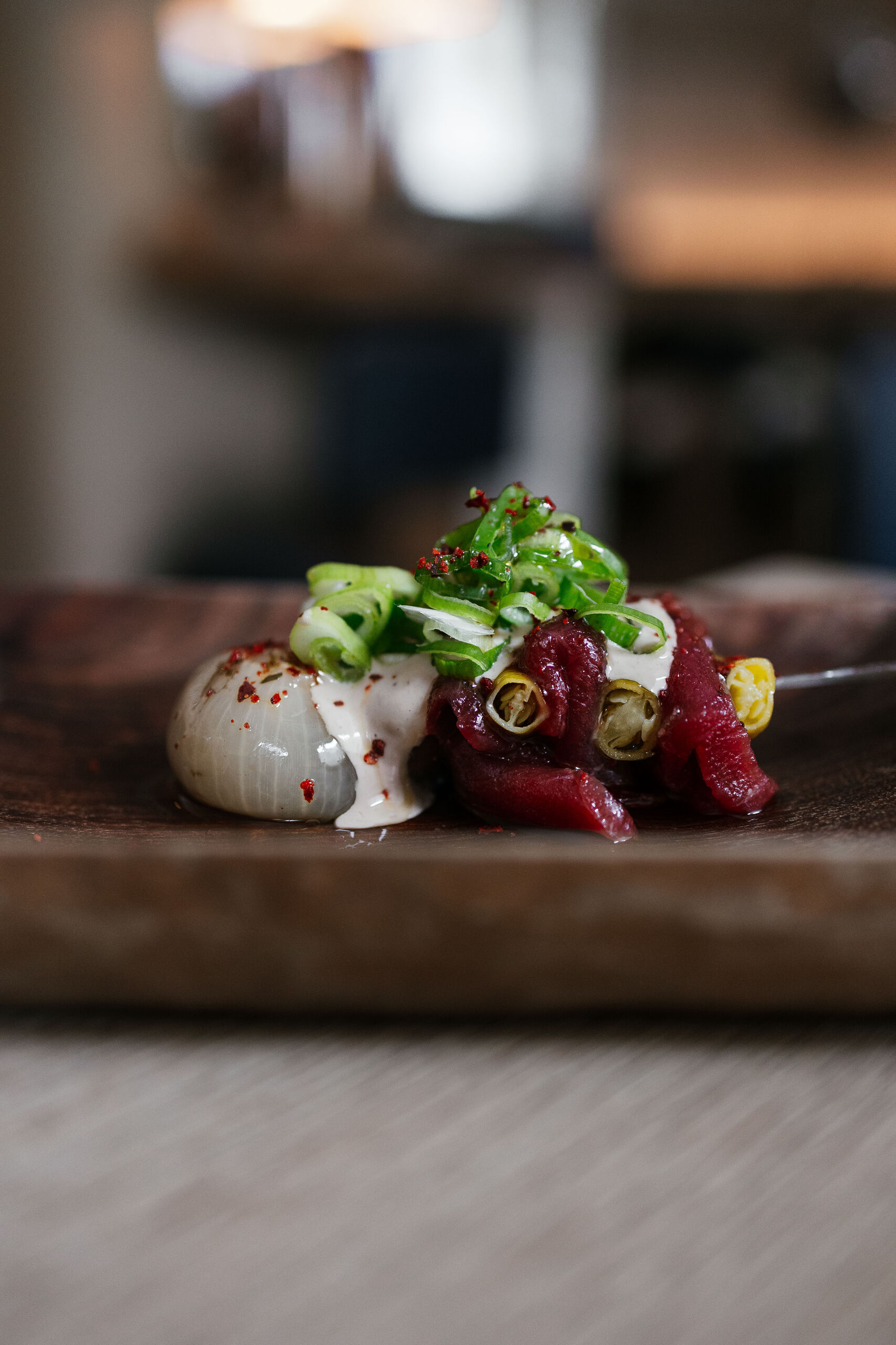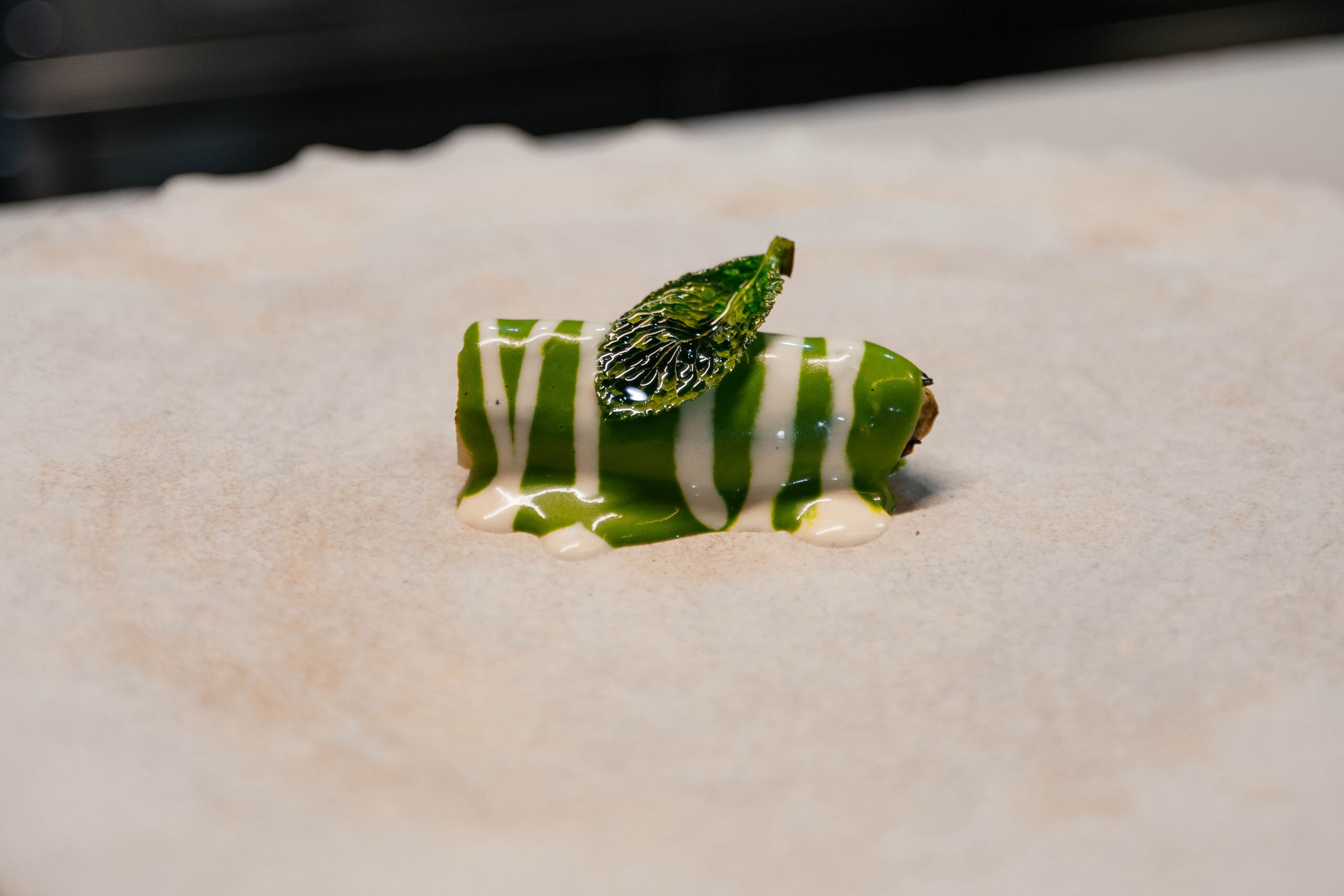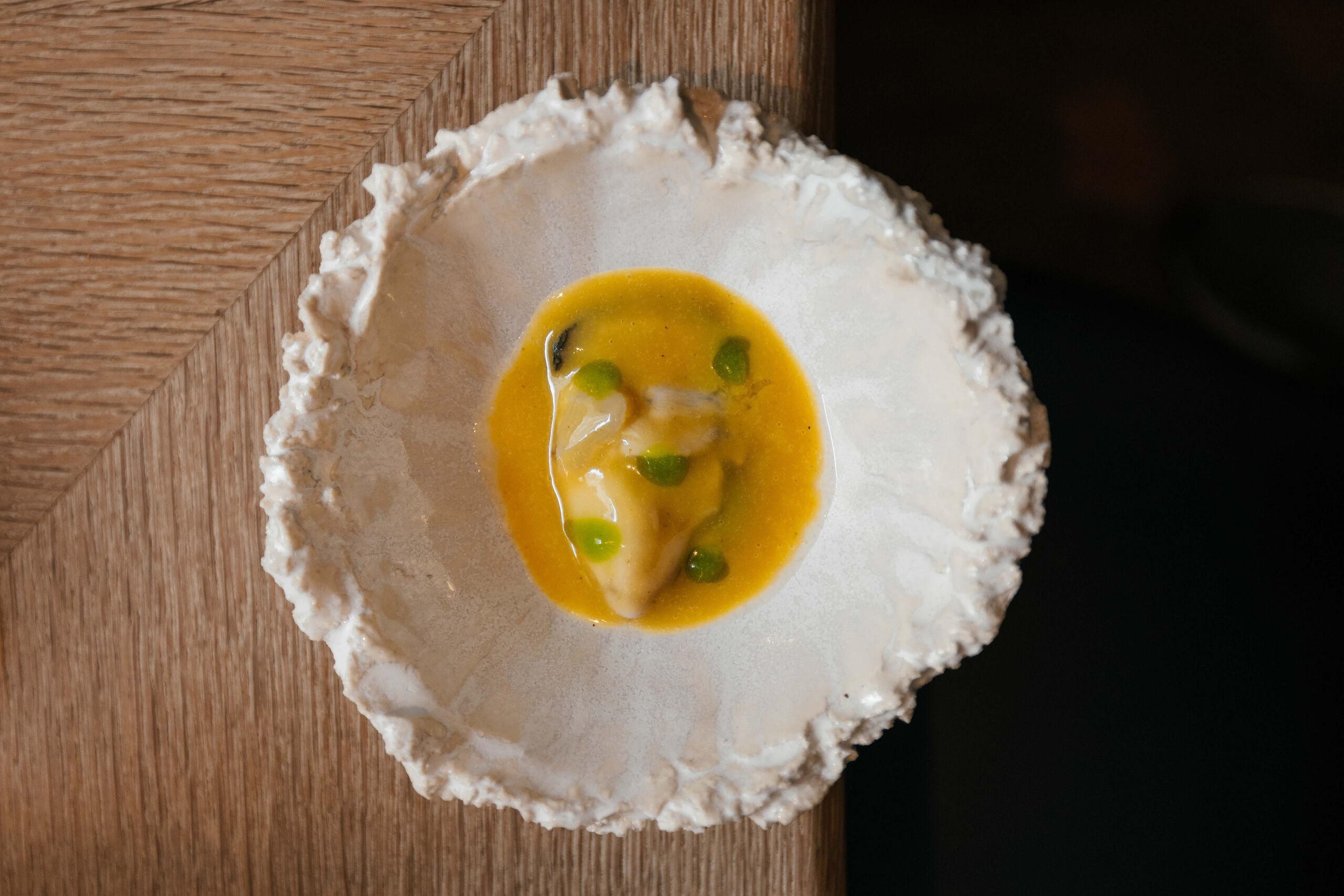 Este viaje por esa marea creciente está compuesto por nueve pases y comienza con un aperitivo de salmón salvaje de Alaska, curado por ellos mismos y reposado para obtener un sabor único. Continúa con el único plato que es un fijo y un indispensable de este templo gastronómico, su gilda Bistronómika de atún rojo y piparras, para comerla de dos bocados y que está aliñada con aceituna kalamata, piparra, mayonesa de anchoa y aceituna, y a la que añade una cebollita francesa hecha a la brasa y encurtida. Estos primeros pases terminan con una ostra ‘fine Claire’ acevichada, con una base de gelatina de manzana y la cubren con leche de tigre y fruta de la pasión que enmascara un poco de más el sabor de este fantástico marisco.