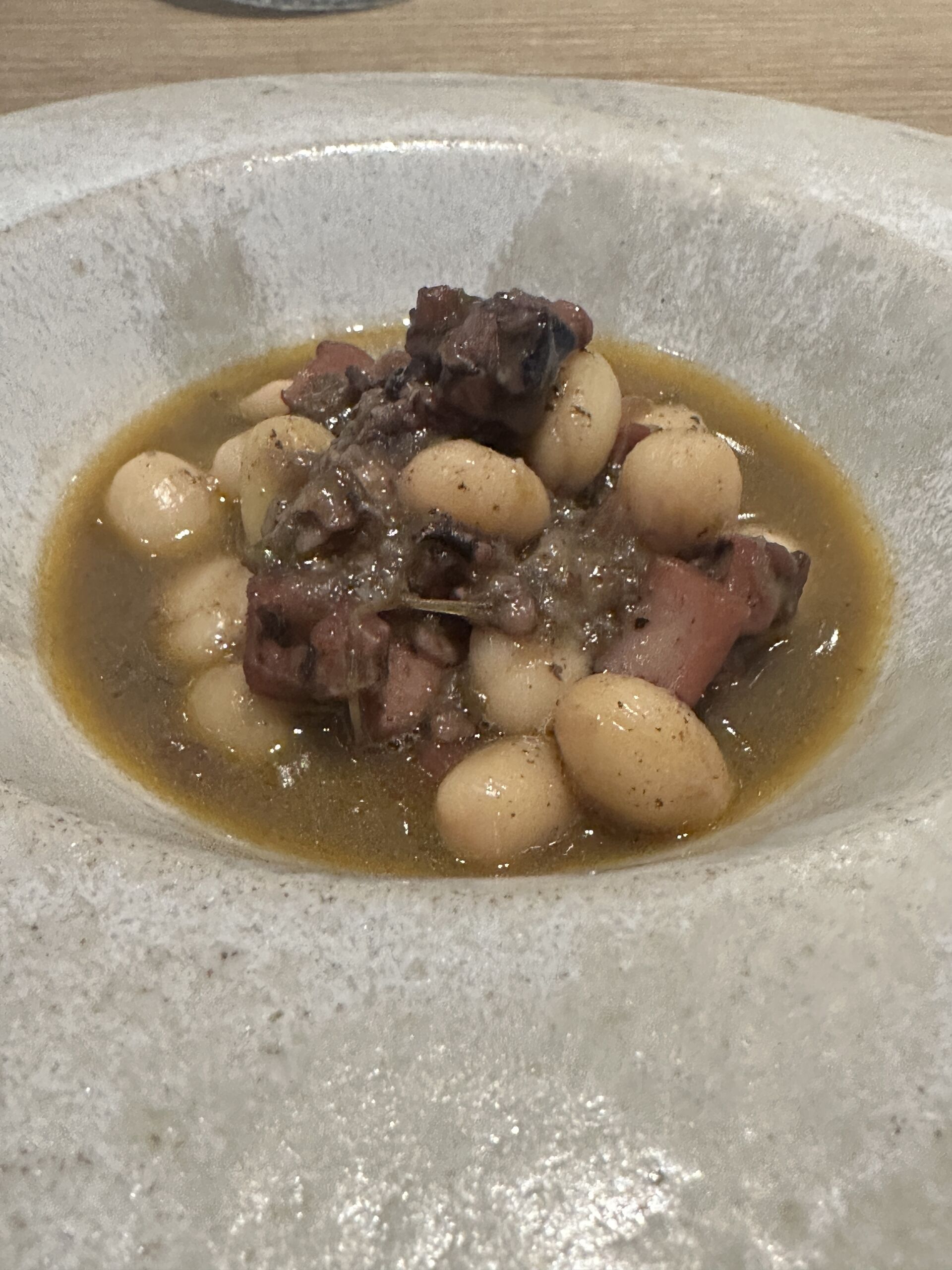 Como te conté en Libertad Digital tras mi primera visita a Bistronómika, el buen producto lo trasforman en muy bueno. Y lo sigo comprobando en este menú primaveral que continúa con ese alimento que no es una legumbre, es una verdura lo que hace de este guiso un plato más ligero de lo esperado al leer la carta. Son las exquisitas pochas de Coristanco con fondo de choco de la Ría de Arosa.