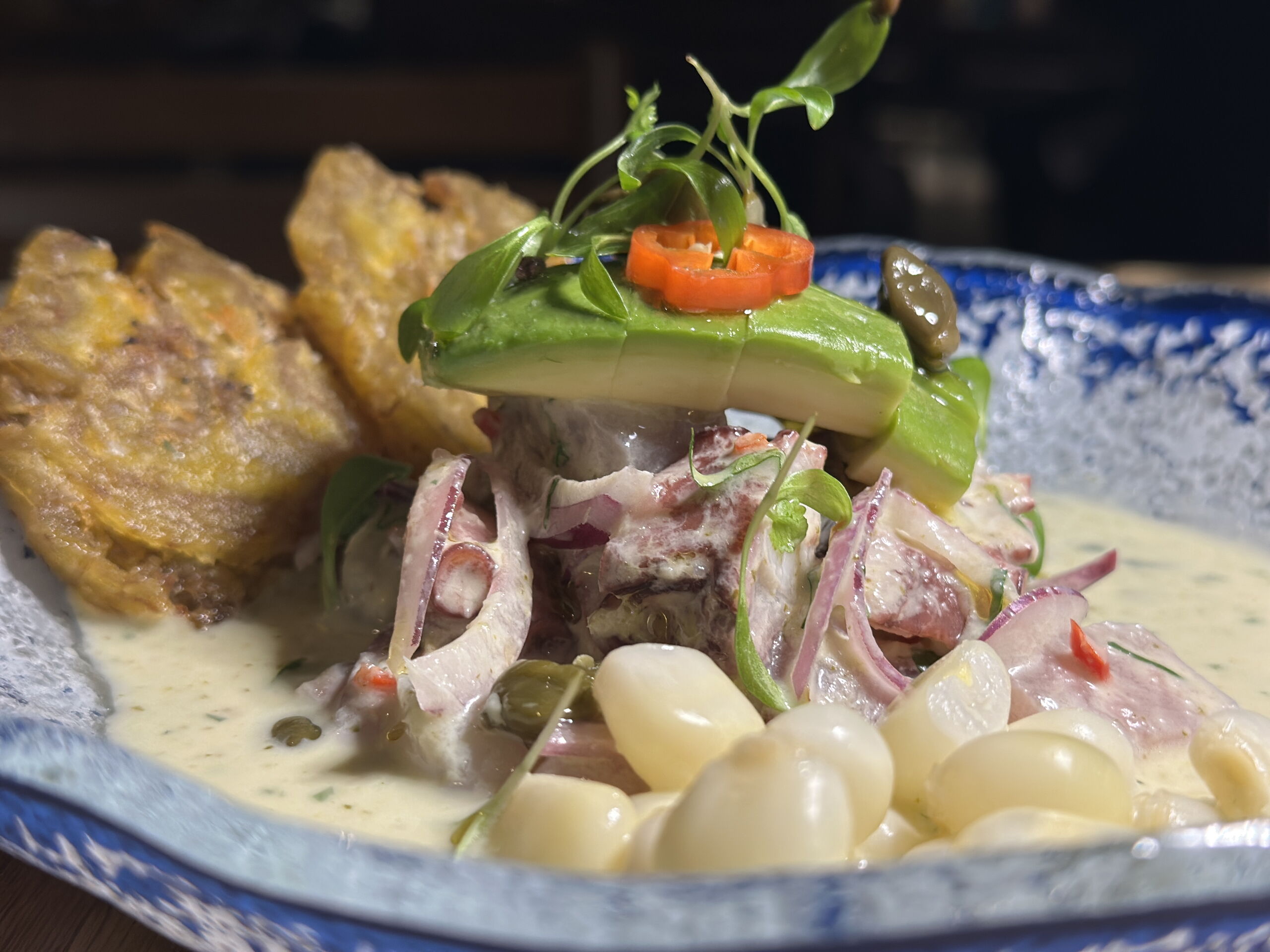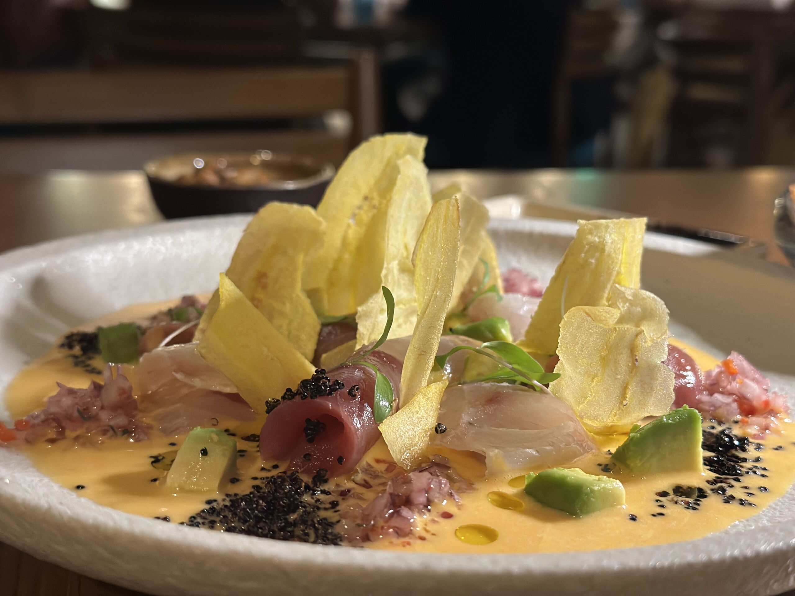 En La Mar Madrid, aconsejados en todo momento por el atento servicio de sala, en nuestro caso por Libertad –son 88 trabajadores que dan servicio diario a unos 300 comensales–, probamos el buenísimo ceviche Lima Madrid (28 €), con pulpo, corvina y conchitas en leche de tigre emulsionada con puré de alcachofa, aguacate y alcaparras.